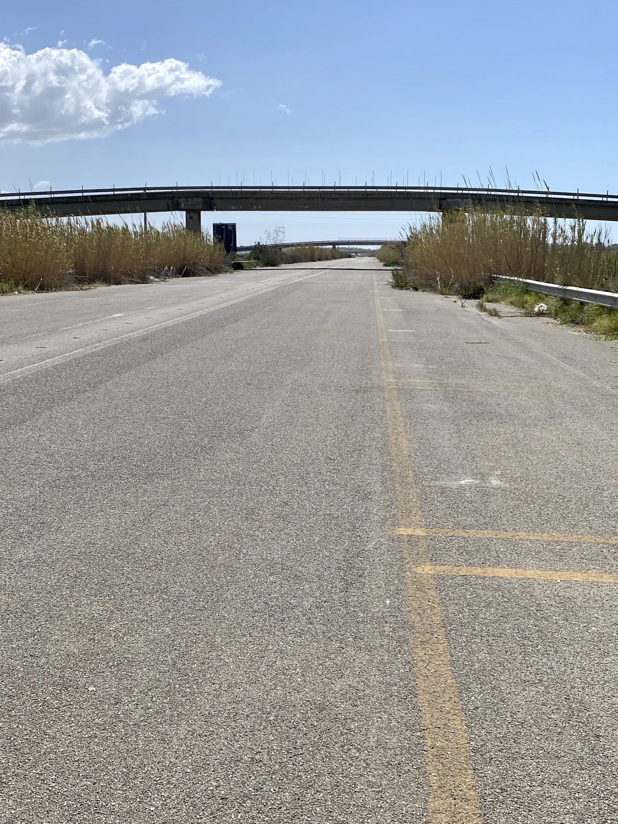 The first bit was bumpy and unpaved but that section was very short. We soon found ourselves on what had been a divided highway, complete with overpasses and interchanges. We saw maybe 3 cars on it; it was otherwise abandoned for reasons unknown. It was 5 or 6 km of well-paved bliss.
