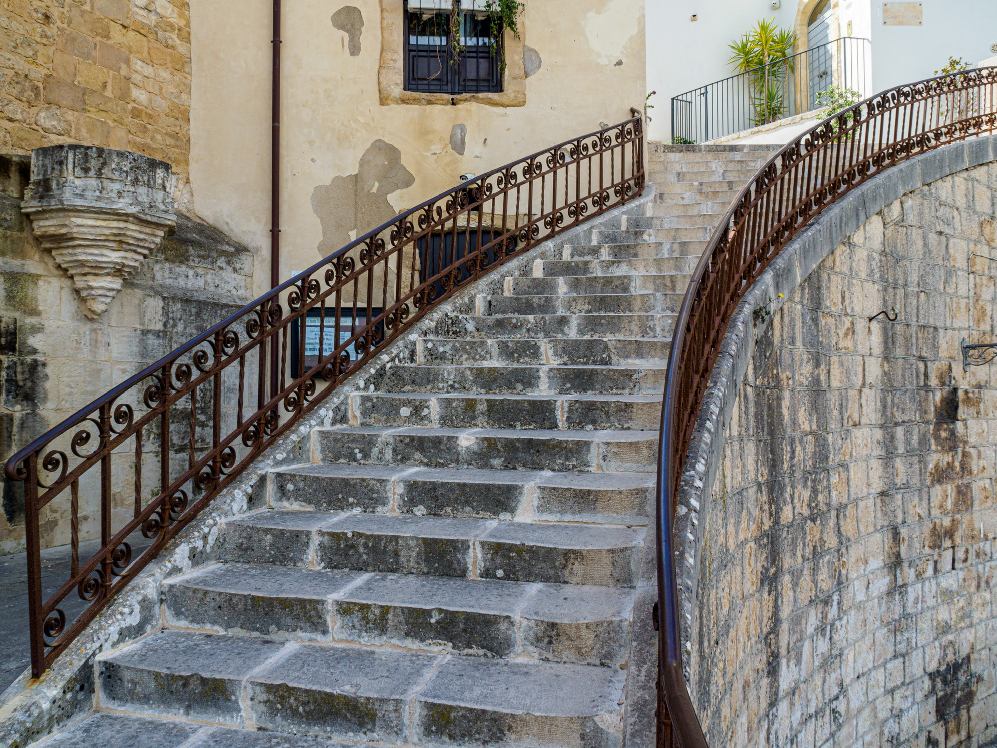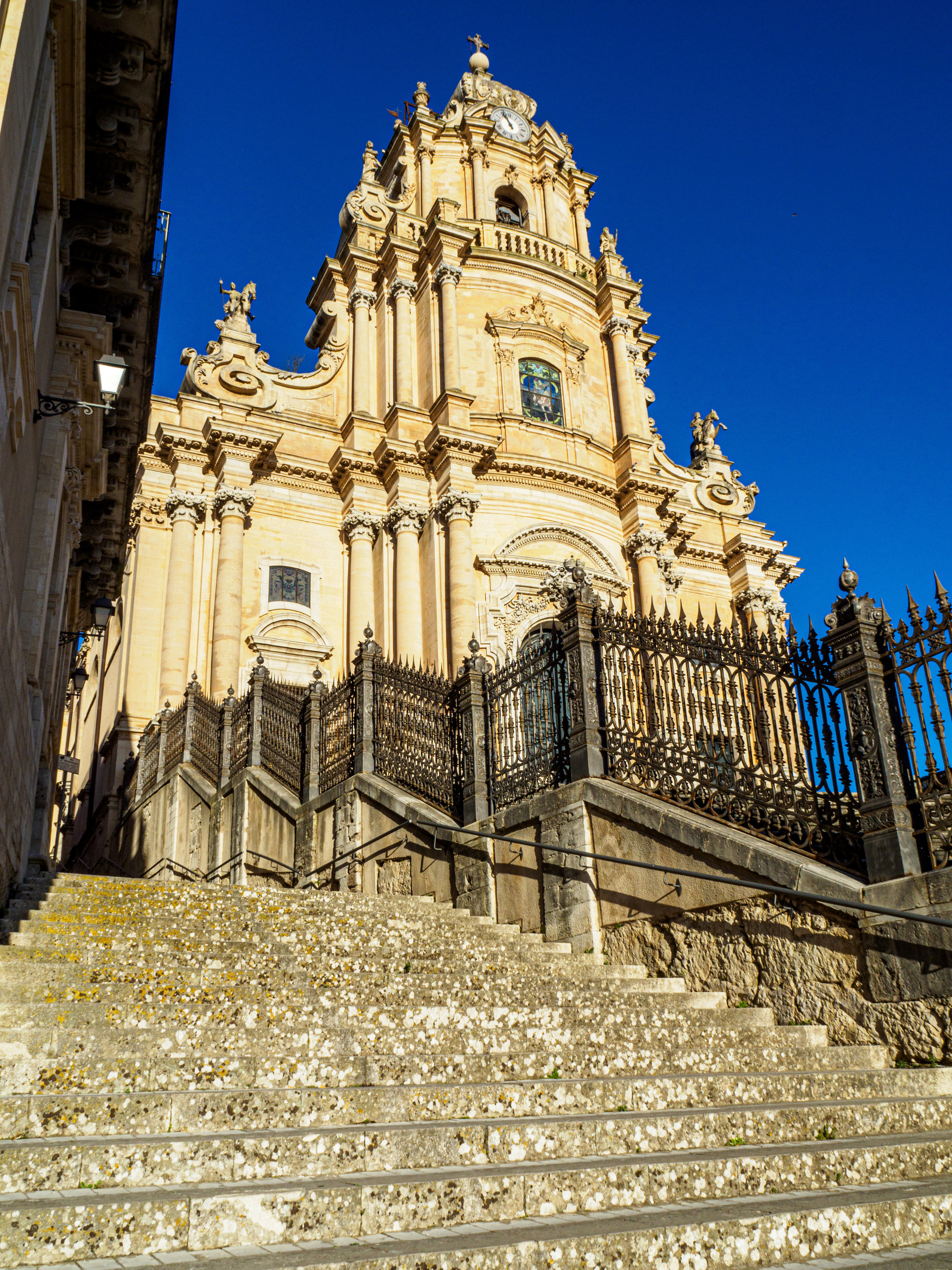 Duomo de San Giorgio. The wrought iron fence (dated 1890) surrounds the main staircase so visitors climb these stairs on the side and enter through a small door.
