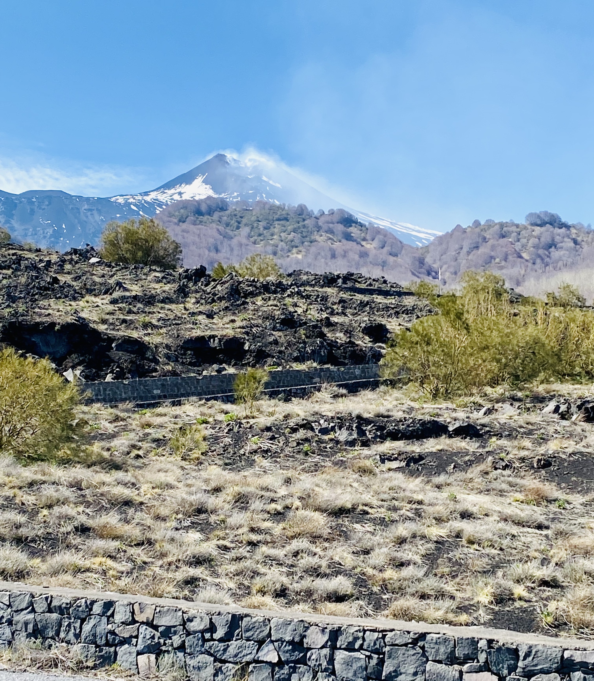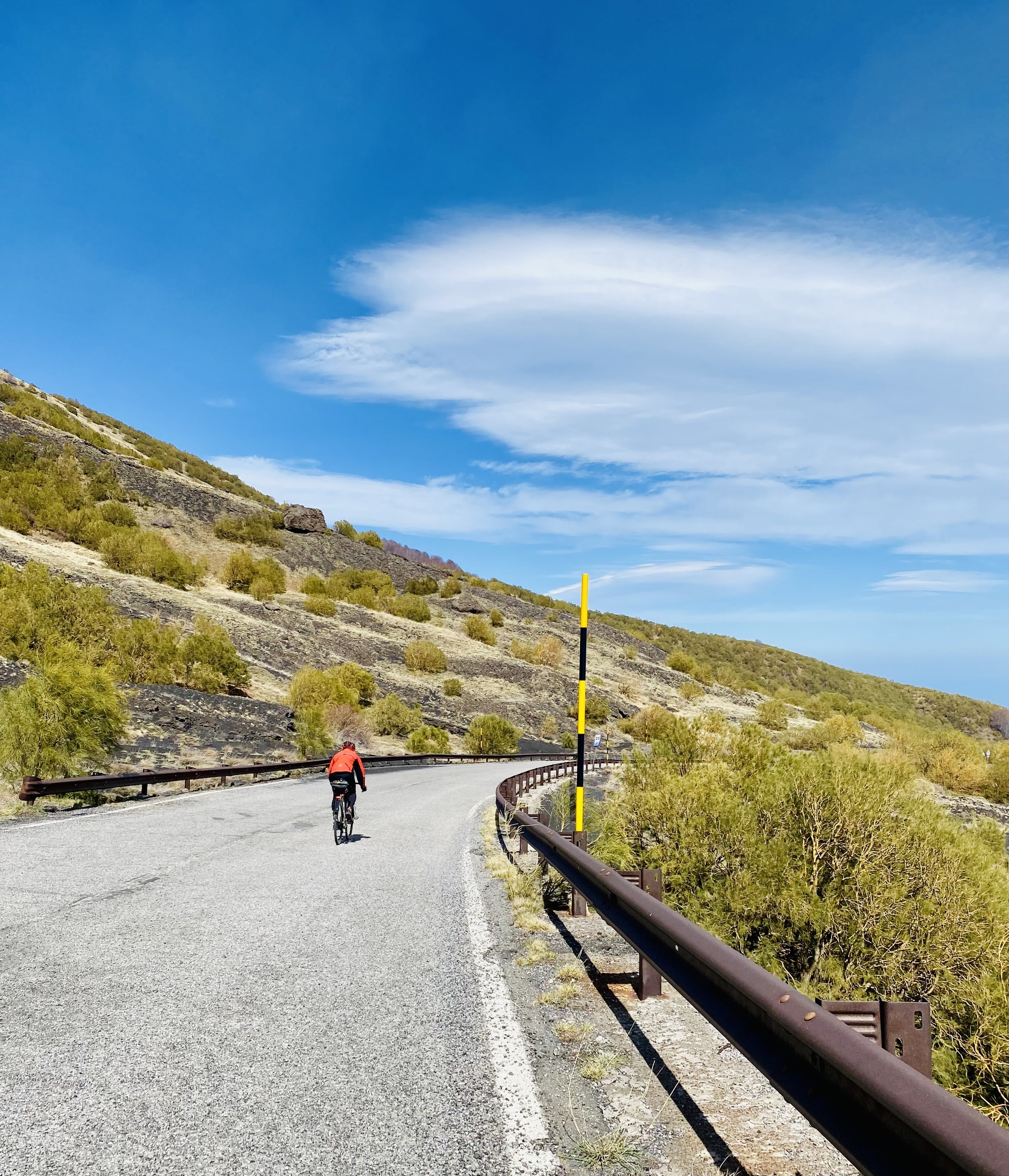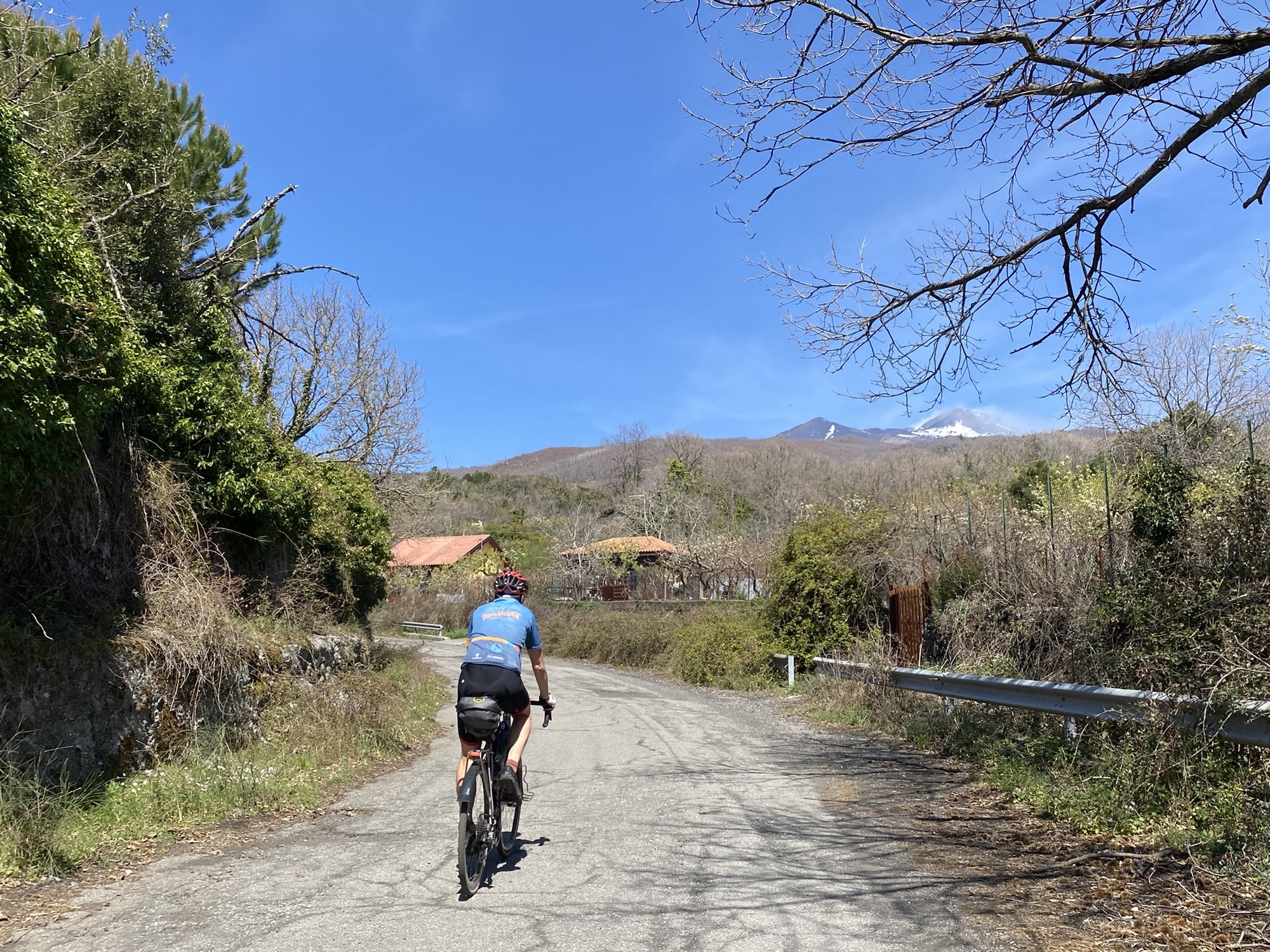 We had today in our itinerary to ride up Etna, but it was always “weather permitting” and, up until very recently, the weather forecast hadn’t looked promising. But today was perfect! So, despite our residual tiredness from two tough days of loaded riding to get here, the ride was on!