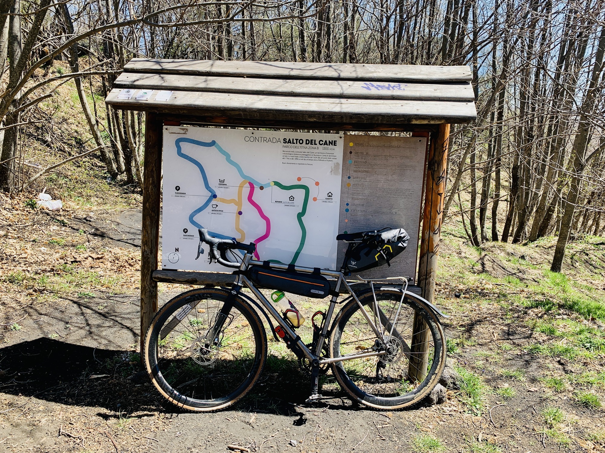 Time now to try and deal with my cleat issue. After reading about Susan Carpenter’s experience last year in Puglia, I’d decided to carry a spare cleat bolt. Unfortunately, I forgot to pack one and Al didn’t have one either. Google told me there was a Trek Premium shop, Le Due Ruote, fairly close to our location, and open. Less than an hour’s walk, “mostly flat” according to Google. I contacted them; yes, the shop existed, it would be open until 8 p.m., and they had a bolt for me. The walk was not flat at all, but I expected that as we are on the side of a mountain. It was worth it to me because it’s a lot easier to walk unencumbered on a pleasant evening than to be pushing my loaded bike (or riding it in trail runners for any distance). I should add that I’ve been riding in SPD shoes for decades and this is the first time I’ve lost a cleat bolt.