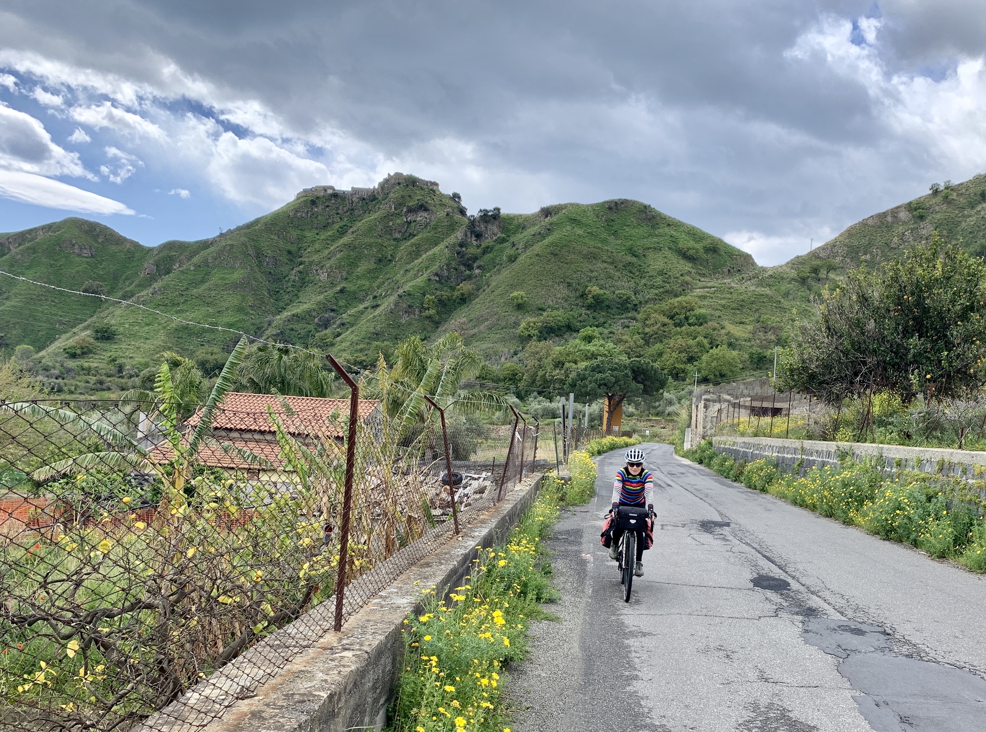 We started by retracing the route we’d taken to Taormina, down to sea level and then up the valley through the scented citrus groves. We crossed the river and pedalled up past Gole Alcantara, which looked very different from this direction and moving slowly. I’d missed all the tacky tourist stuff as we zoomed down after having visited via the community stairs.