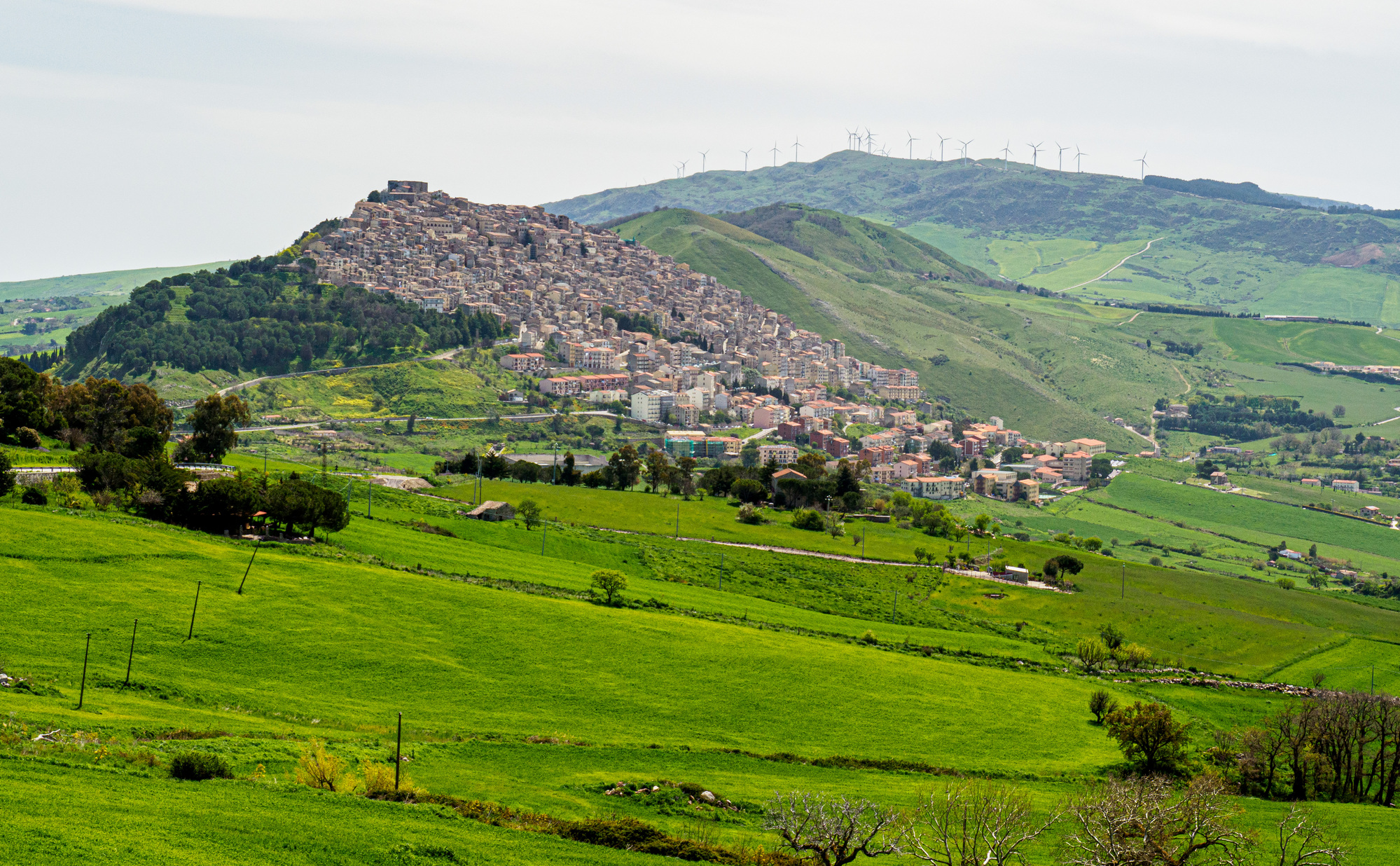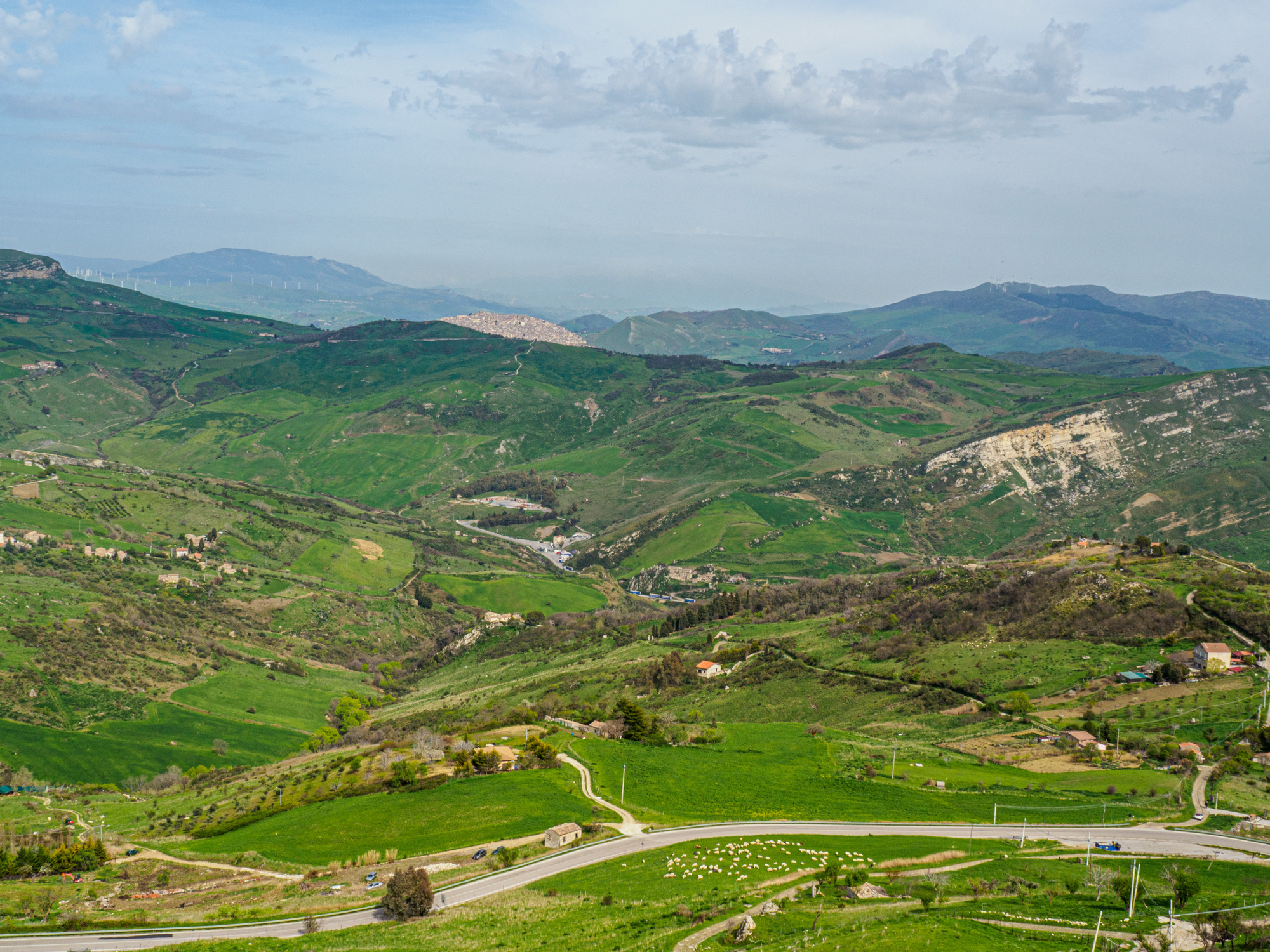 Beautiful bucolic scenery today, green pastures with a few herds of sheep, a few cows, even some horses and a donkey or two. Dogs herding sheep but none apparently on guard duty—but I didn’t push my luck by stopping to get my camera out. Also some toads again, definitely dead on the sides of the road in the valley below Sperlinga, but not yet flattened.