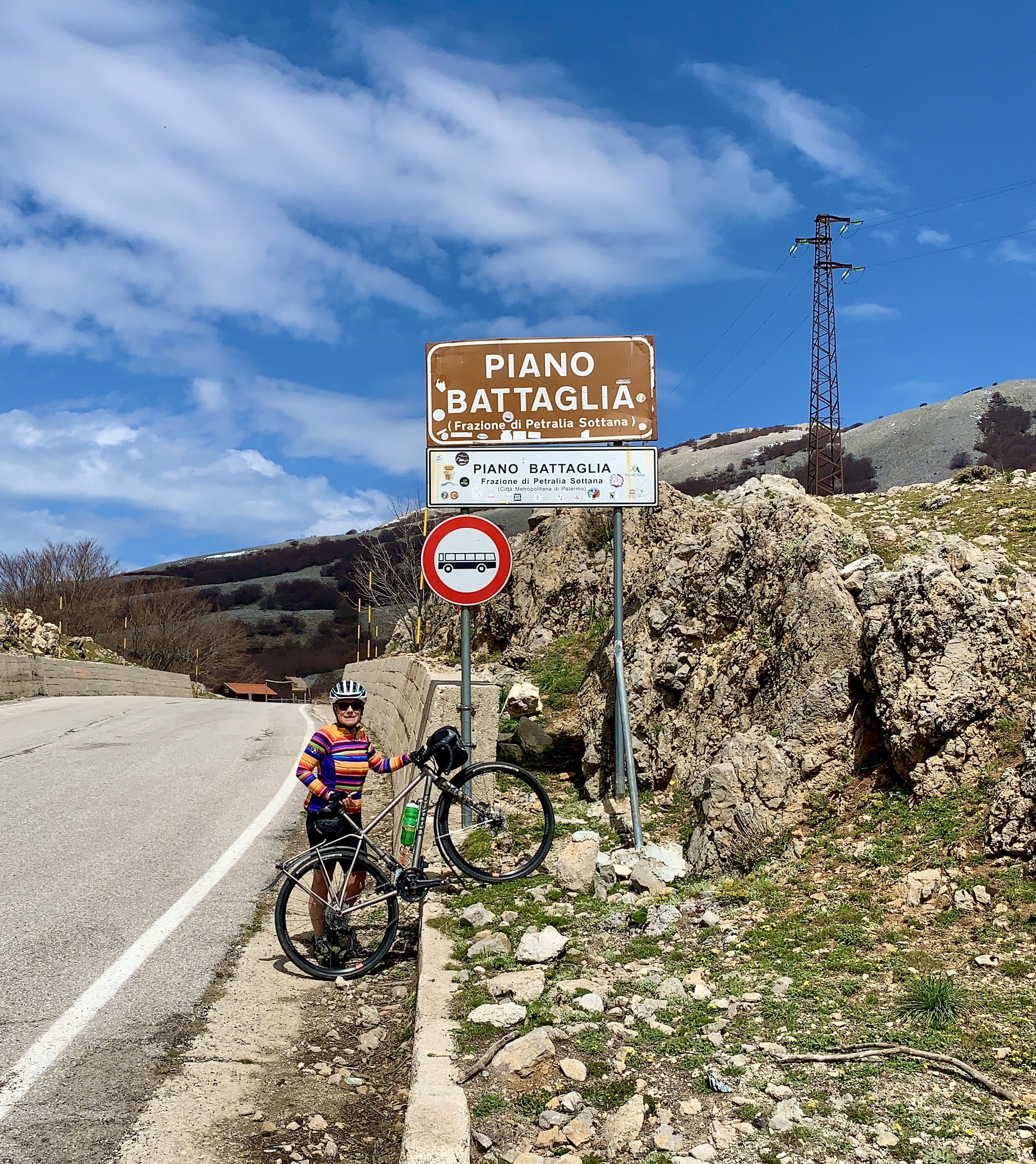 We continued climbing a long way, gaining over 900 metres elevation, all the way to Piano Battaglia. The scenery was okay, the road was okay in places and terrible in others, but there was nothing that made us think we wouldn’t mind doing this again tomorrow on loaded bikes. (Speaking of rough: every bridge, and there were quite a few, had very deteriorated expansion joints every 10 metres. Plus some of the potholes were big enough to swallow a vintage Fiat 500.)
