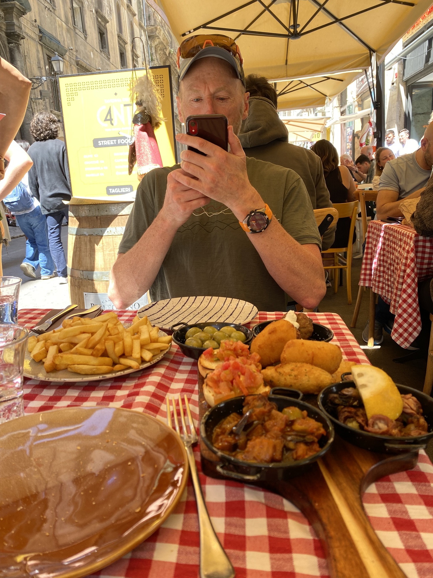 Lunch: Sicilian street food at a tourist restaurant on the pedestrian strip. The street was much busier than when we were in Palermo in mid-March.