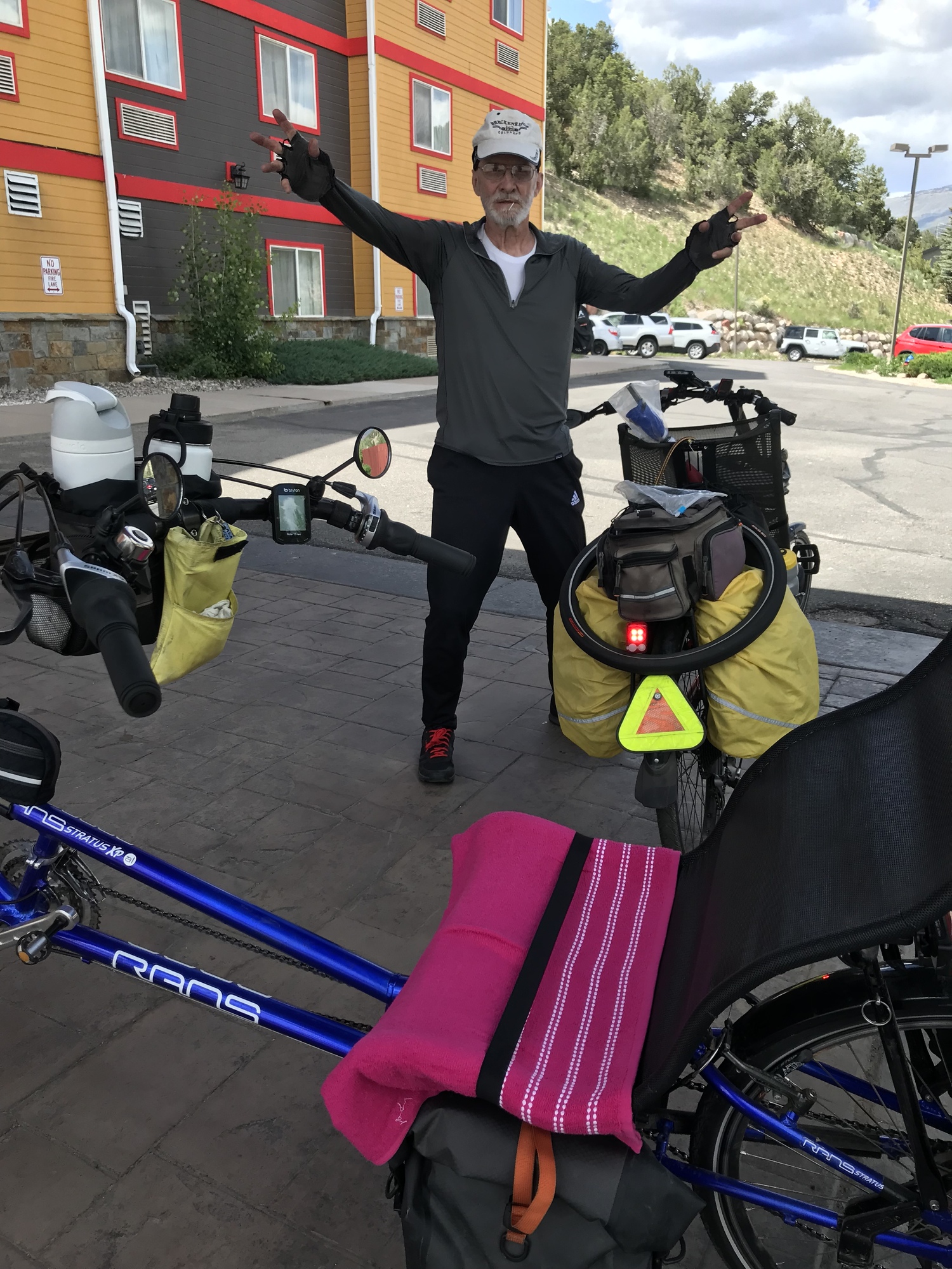 Oren and I were passed by a group on red E bikes. They passed us early on, rode to Hanging Lake, and passed us again going back. We saw one man on an E scooter. Besides those people, we saw just a handful of cyclists. One rider of note was a self contained rider from England. He started in San Francisco and was headed to Niagra Falls, with a goal of riding 100 miles a day. He had good weather, other than 43 degree centigrade temperatures in Death Valley, and hail at Torrey, Utah.