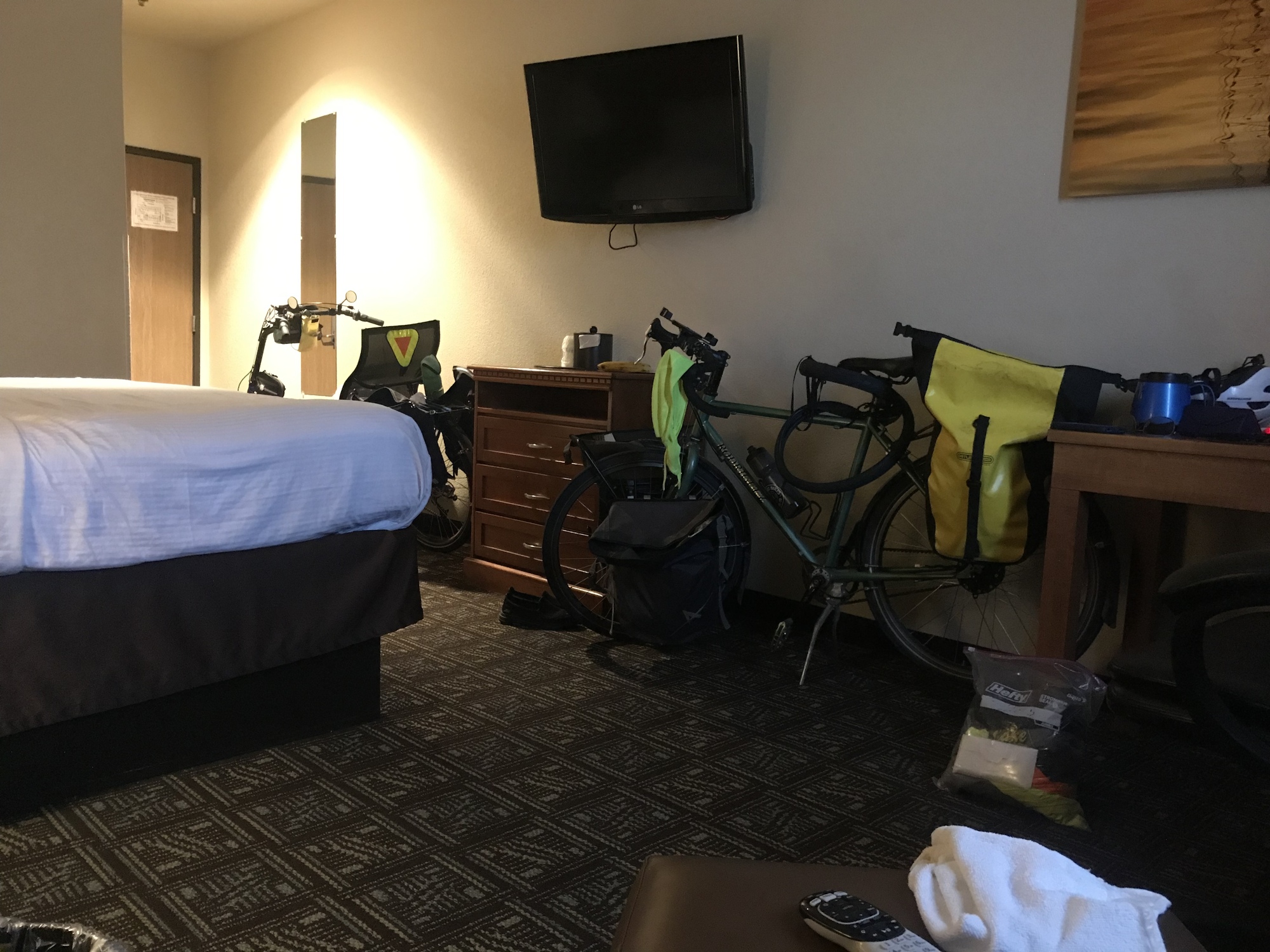 The Best Western is next door. I rode on over and could check in. I chatted with the ladies about the weather and bicycling. They were very surprised I didn't have a car. The chatting part worked for me, as I came right back and told them the room I was assigned had a heavy smoke odor. They were able to move me. I also scored a couple of extra pillows. I expect four at Best Western.