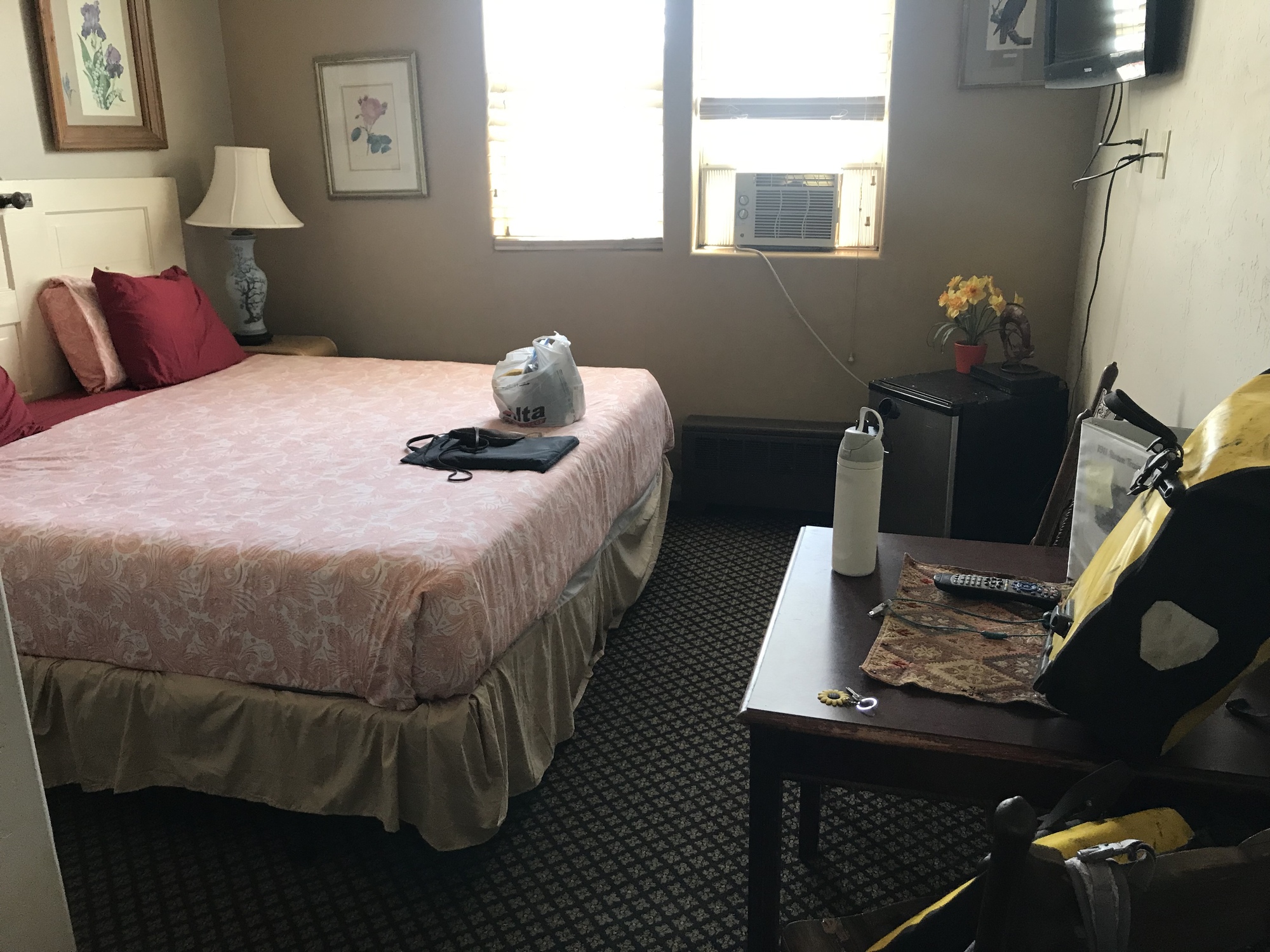 We went back to the inn. We are trying a new to us place, in town. The Steam Train Hotel. I called to let Teagen know we were here. She gave us directions on how to get upstairs. Our bikes went in the currently unused lobby. The door would be locked behind us. We needed to get our items now. Hopefully getting our bikes back in a timely fashion tomorrow won't be an issue.