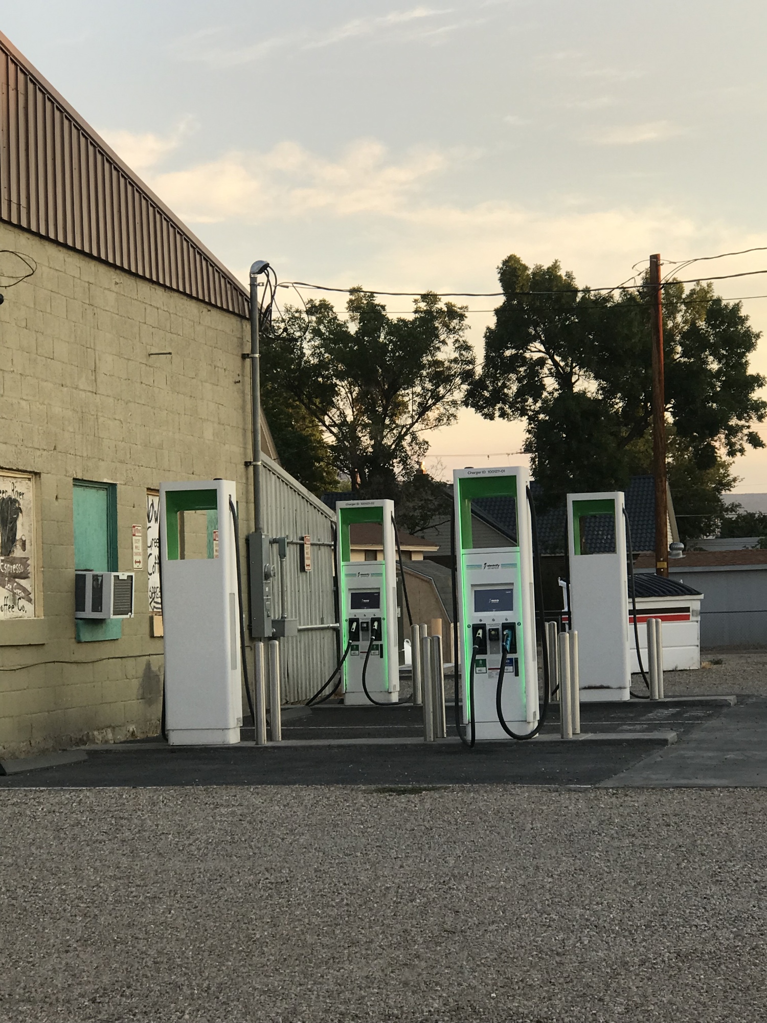 I stopped at the first gas station. It didn't look like it had much of a store, because it's built into the side of a big rock. When I went inside they had all sorts of choices. Even kombucha! Oren went back later to get breakfast items. He said they had a good selection. I chatted with the clerk, enjoying the air conditioning. He said the hazy sky was from forest fires around. Then a state trooper came in. I asked if he had passed us during the day. Yes, several times. His territory covers 400 miles of roads. He had two Monster drinks and two bags of chips for his drive back to Green River. I made no comment about his diet!
