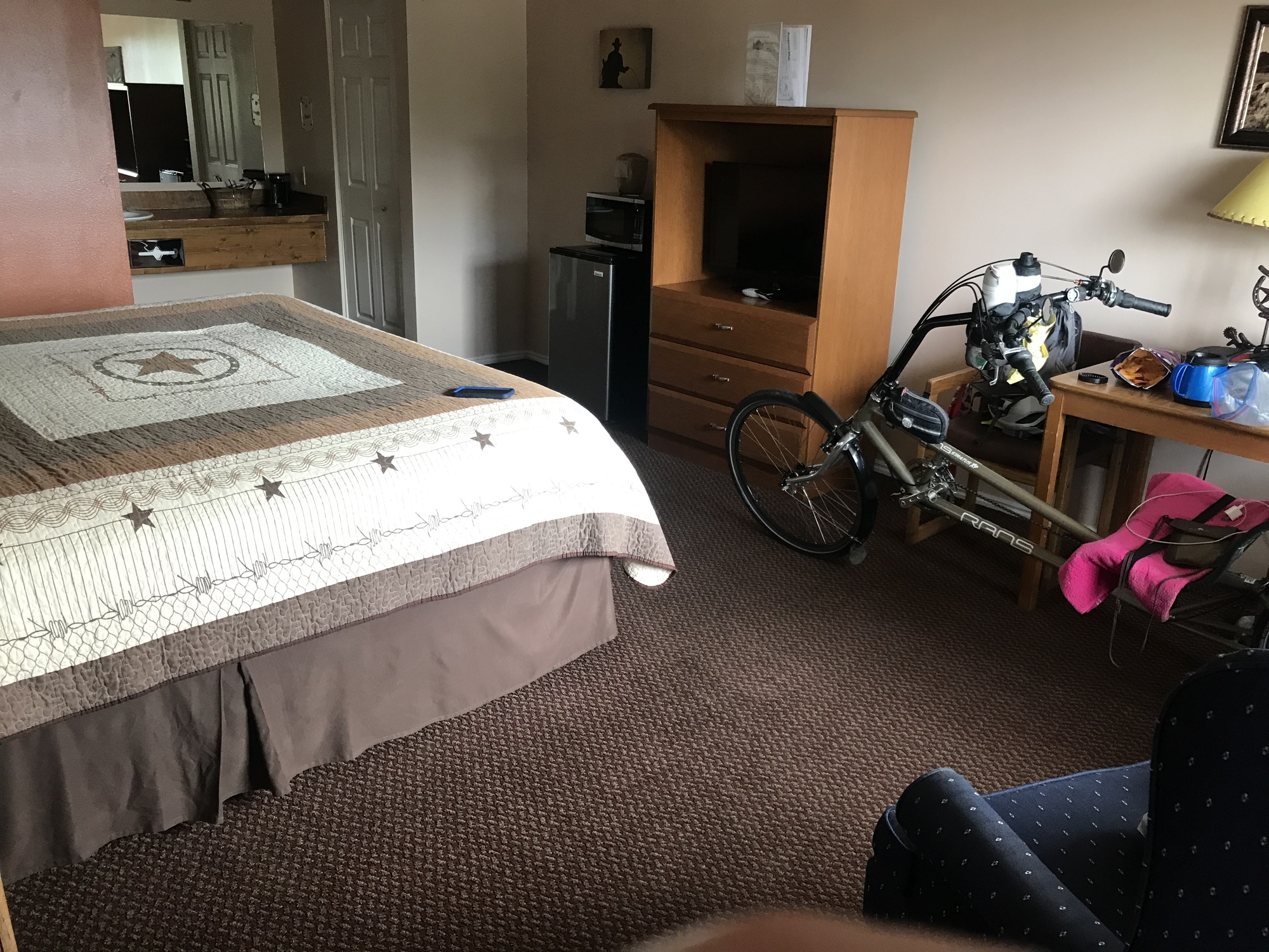 It was a rough day. Beautiful. One for the memory books. Tomorrow is 65 miles. I hope I have legs in the morning. I'm concerned about heat. We have an included breakfast buffet with our room. It doesn't start until 7 AM. Given my heat issues today, I'd rather be riding before 7 AM, not after. Maybe eating a full meal, and not oatmeal, will help my performance. We are eating tonight at the steakhouse attached to our motel.