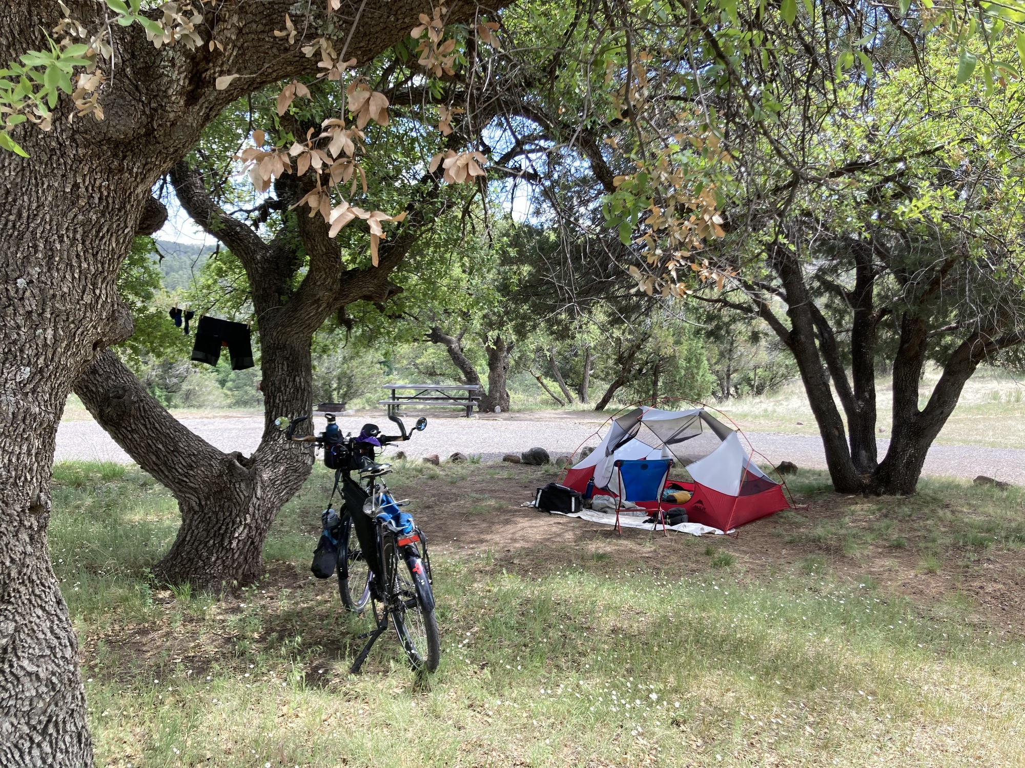 So, it turns out that not 100 yards from where I turned around the other day, not wanting to ride down to the lake to camp, there’s a perfectly fine campground up on the mesa. I should learn how to read a map. Anyway, it looked nice and with less than 16 miles for the day I decided to stay the night.