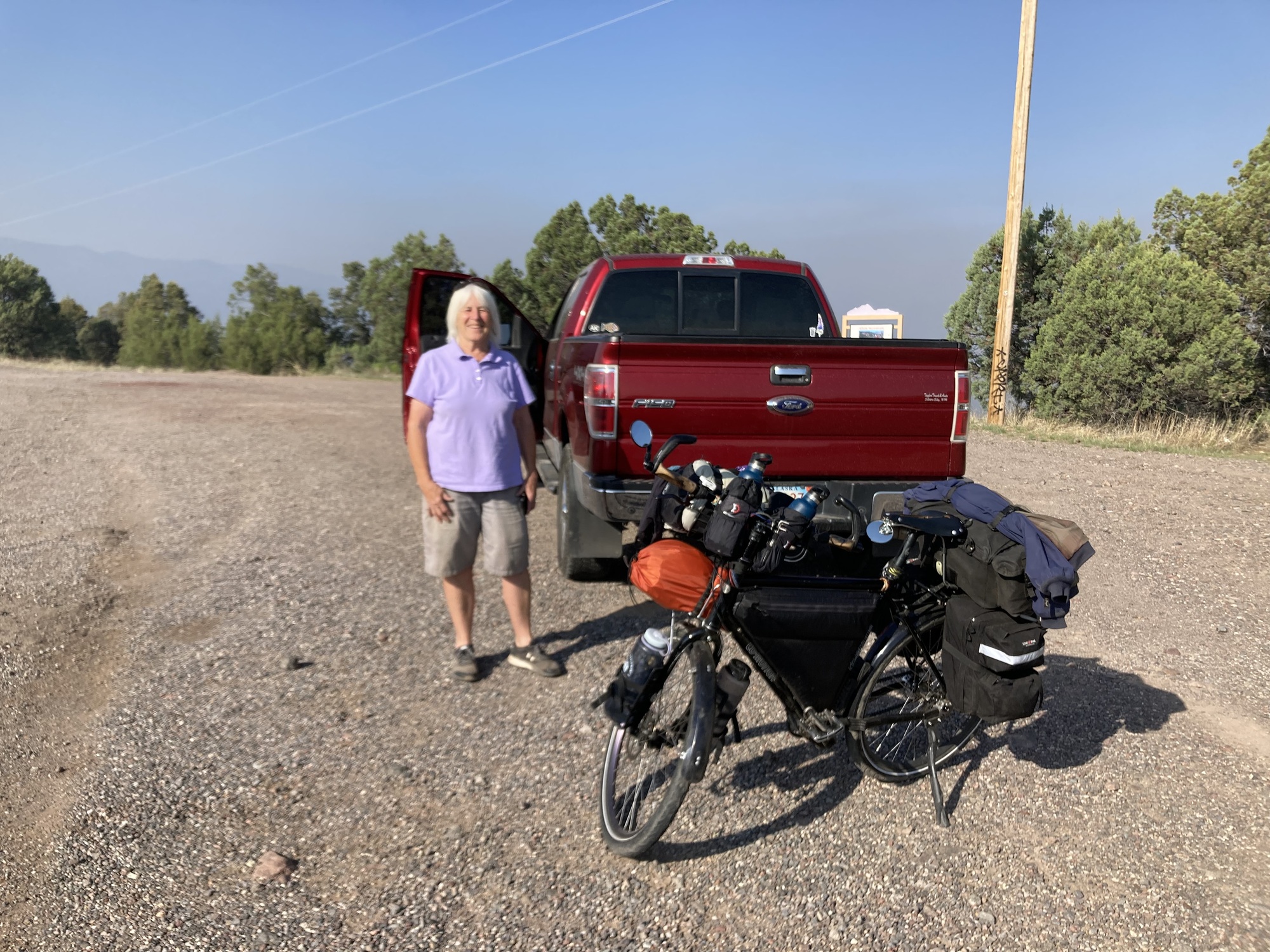 Linda came by with her truck in the morning, as promised. I loaded my gear and bike in the back and we swung by her cabin to load ice into my water bottles before heading up the hill. Linda’s spending the summer in Gila Springs, lives in Silver City but is an Alaskan through and through. Her offer to take me up to the top of the hill took a load off my mind as I was getting ready this morning, but unfortunately we both misread the road and I got out about 3 miles from the summit. But I did avoid the really steep switchbacks at the start which I was certain I’d have to walk, so it’s still a big win. Both general stores at Lake Roberts are closed today and tomorrow, disappointing. I don’t really need anything but there are cold things and other treats in stores and I was looking forward to it.