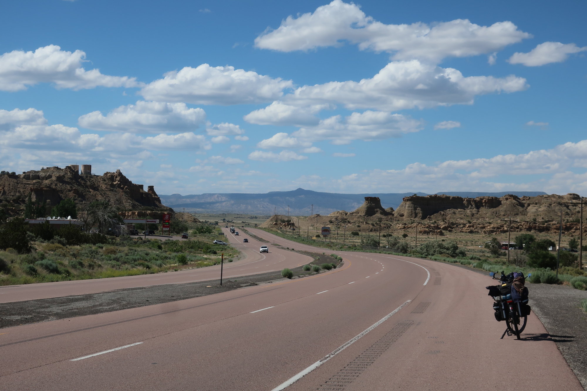 It was 32 miles to Gallup in the morning, with no breakfast options other than what I was carrying. I ate crackers and imagined pancakes later. I found a coffee house and hung around Gallup for a few hours, updating this journal, topping off my batteries and reading the news.