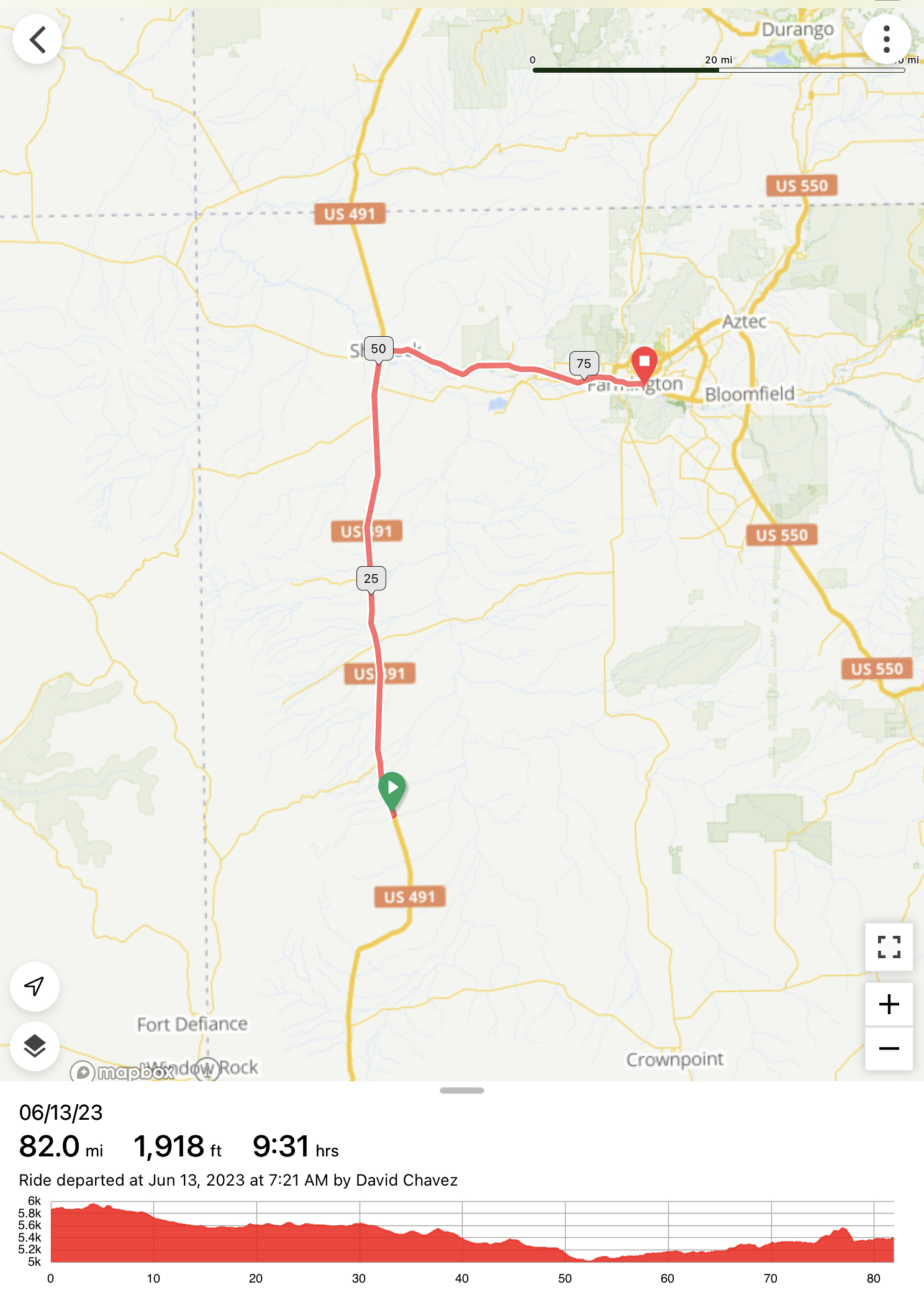 Wind today was from the west, stiff and uncomfortable at times. By the time I reached the town of Shiprock I was questioning my original plan of looking for a place to camp north of town. For one, camping options looked slim but mostly it was the fact that the annoying side wind was a great tailwind for anyone heading east! I decided to turn right and see where it blew me, which was to the Motel 6 in Farmington where I arrived shortly after dark. That’s also when I discovered my headlight isn’t working…