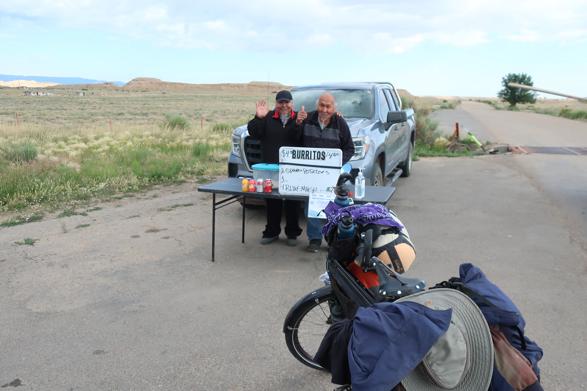 It was quiet behind the church and I slept undisturbed. I was 5 only miles south of Sheep Springs which had a gas station and headed there for breakfast and was happy to see a collection of vehicles selling breakfast items. A lot of spam based items, seems the most popular. Spam and egg burritos had sold out just as I pulled up. I had two very satisfying portions of blue corn mush.