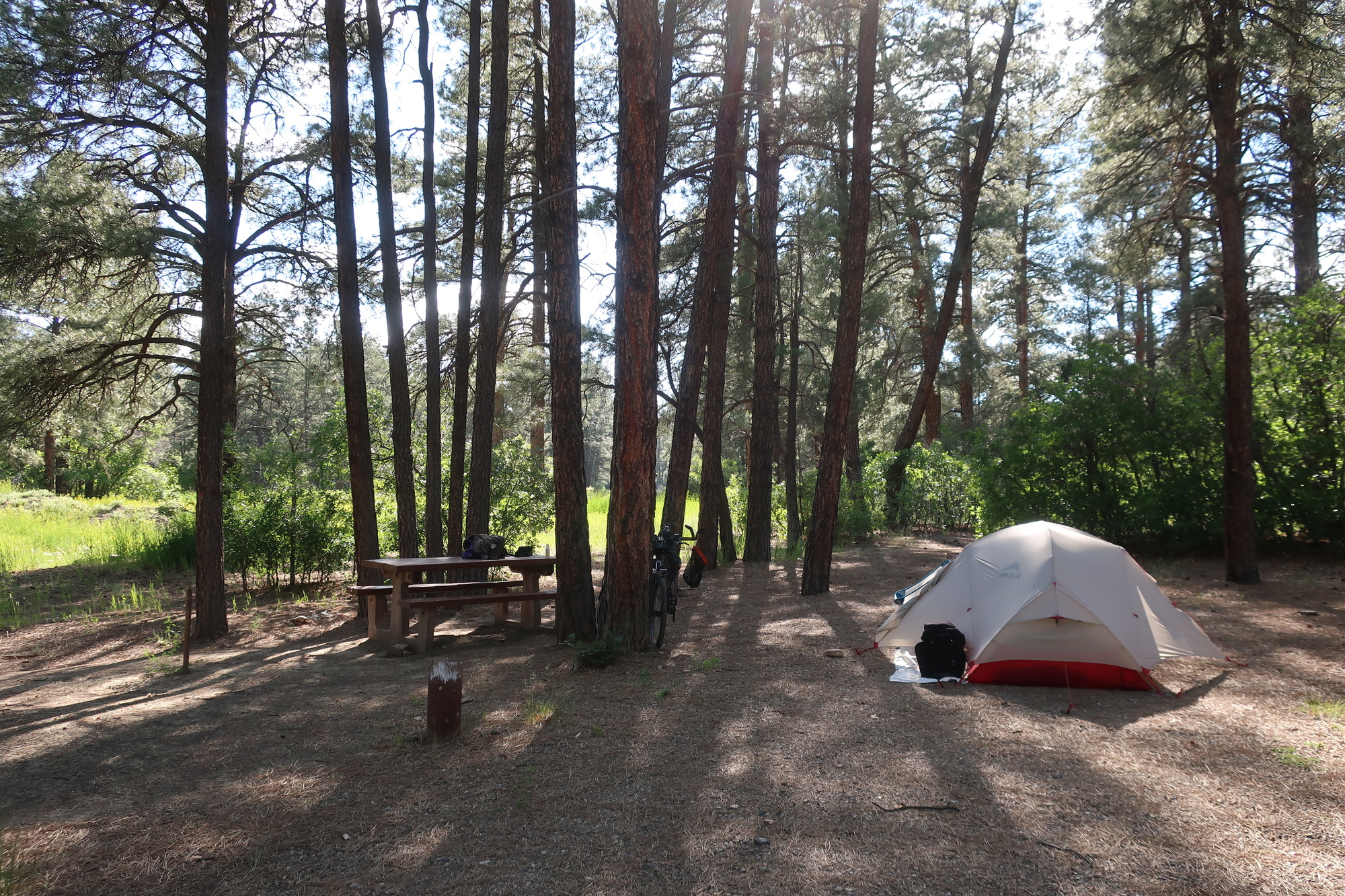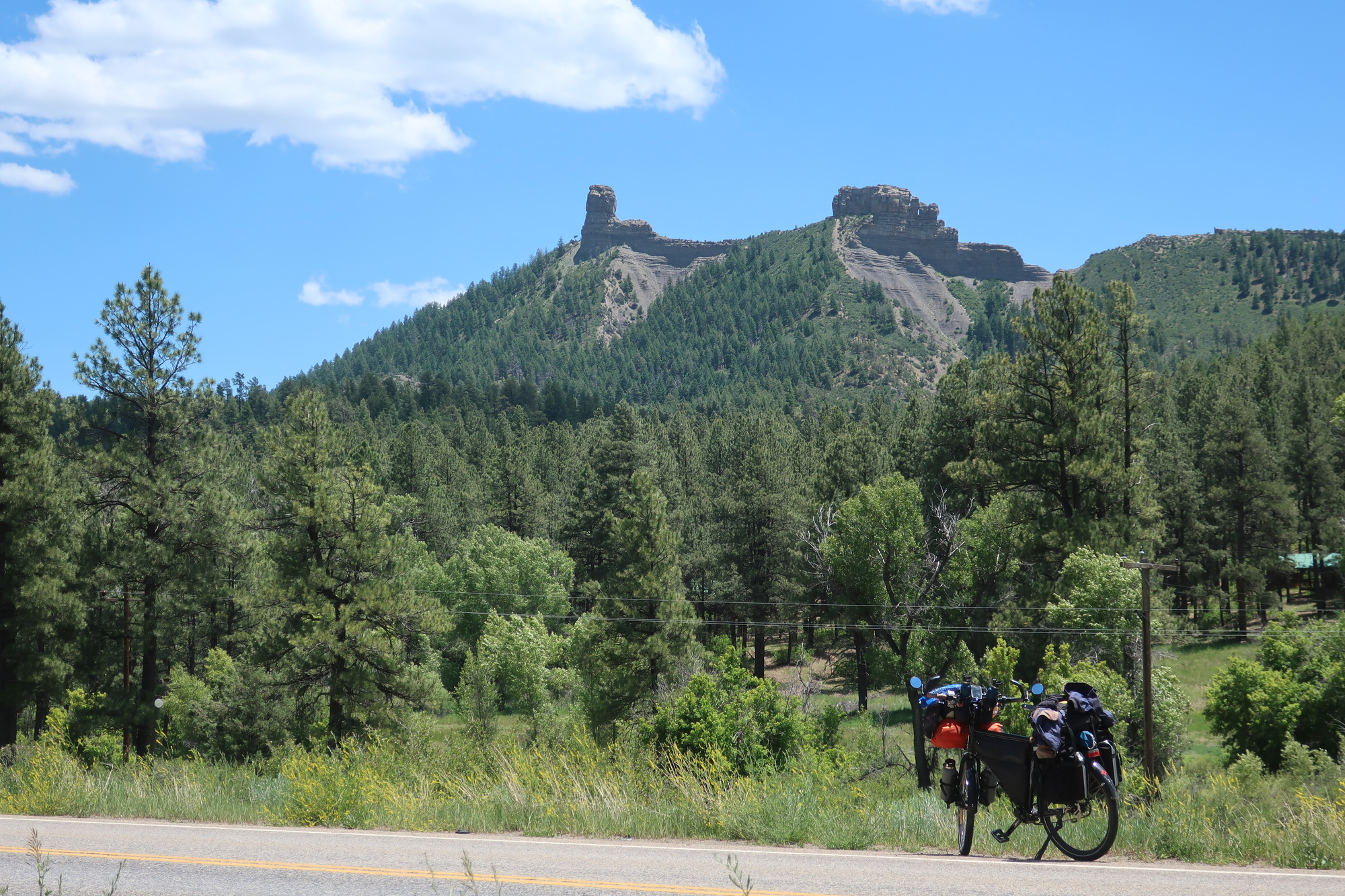 It’s very pretty here, and looks completely different from northern New Mexico. Lush. Green. Rivers and streams everywhere it seems. Breakfast was in the well kept village of Bayfield. So storybook pretty that I wonder what the dark side is. I lost my wide brim hat today. I had it in the morning and I didn’t when I stopped to put it on when the sun got strong. That will need to get replaced soon, a wide brim makes such a difference when it’s blazing or when it’s raining that I deeply feel it’s loss. So far Colorado has impressed me with its beauty and its prices. Forest Service campgrounds are over twice what I’ve been paying, $22 here at the Ute campground (though it’s $11 for me ‘cause I’m a boomer). I stopped at the closest campground to Pagosa Springs, which is 15 miles and a climb away for breakfast tomorrow. Pagosa Springs was in reach, but zero reasonable lodging or camping available made stopping early a better choice. It’s nice here in the forest. Chimney Rock National Monument is 8 miles away, an out and back detour about which I’m conflicted. I feel I should, it’s a good opportunity, but I’m also tense about the upcoming climb, and want to be past that. So I’ll probably skip it tomorrow.