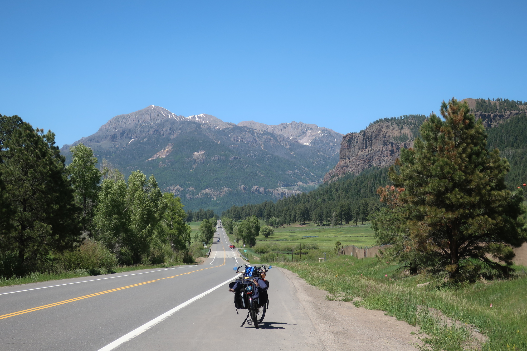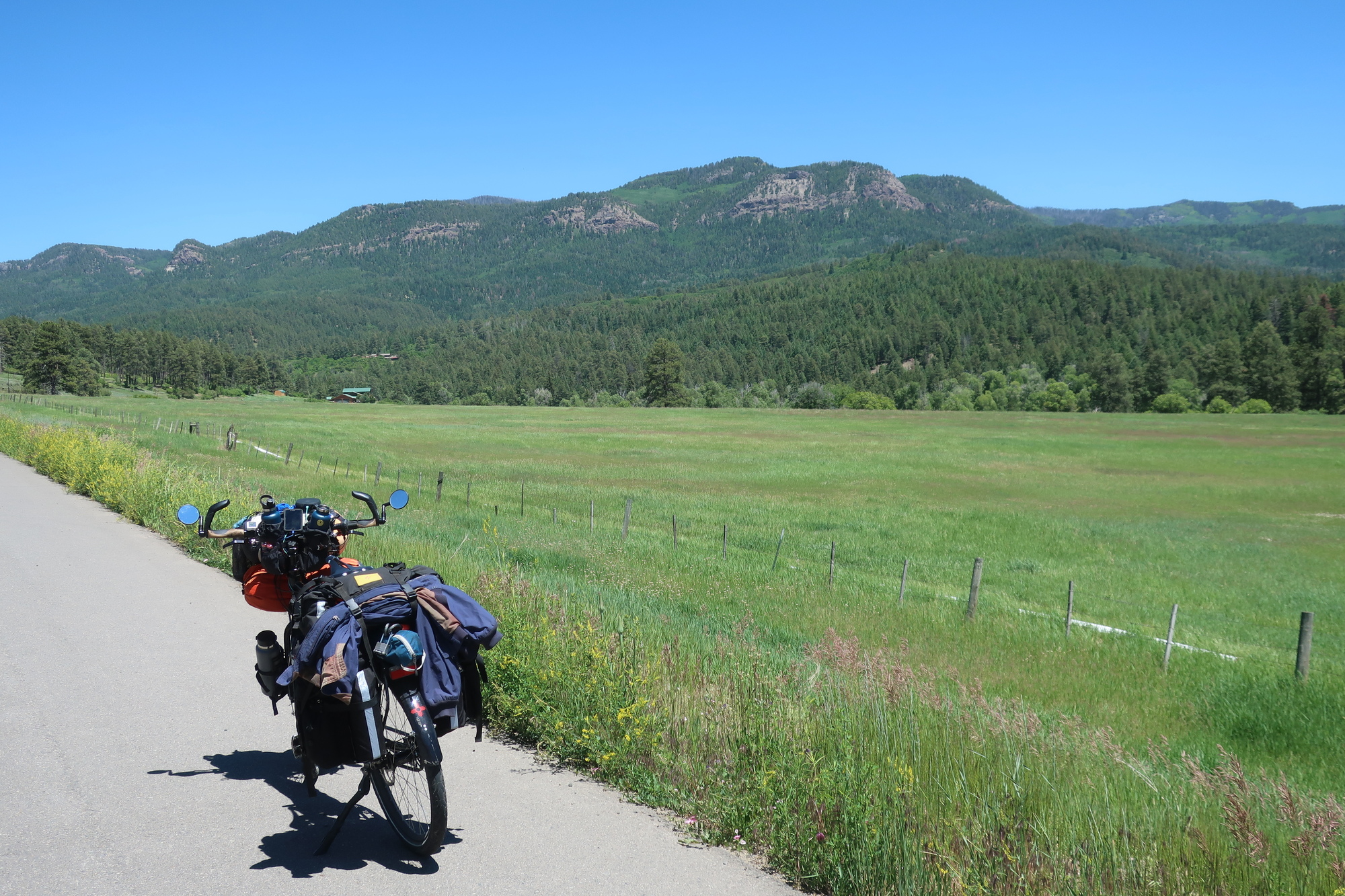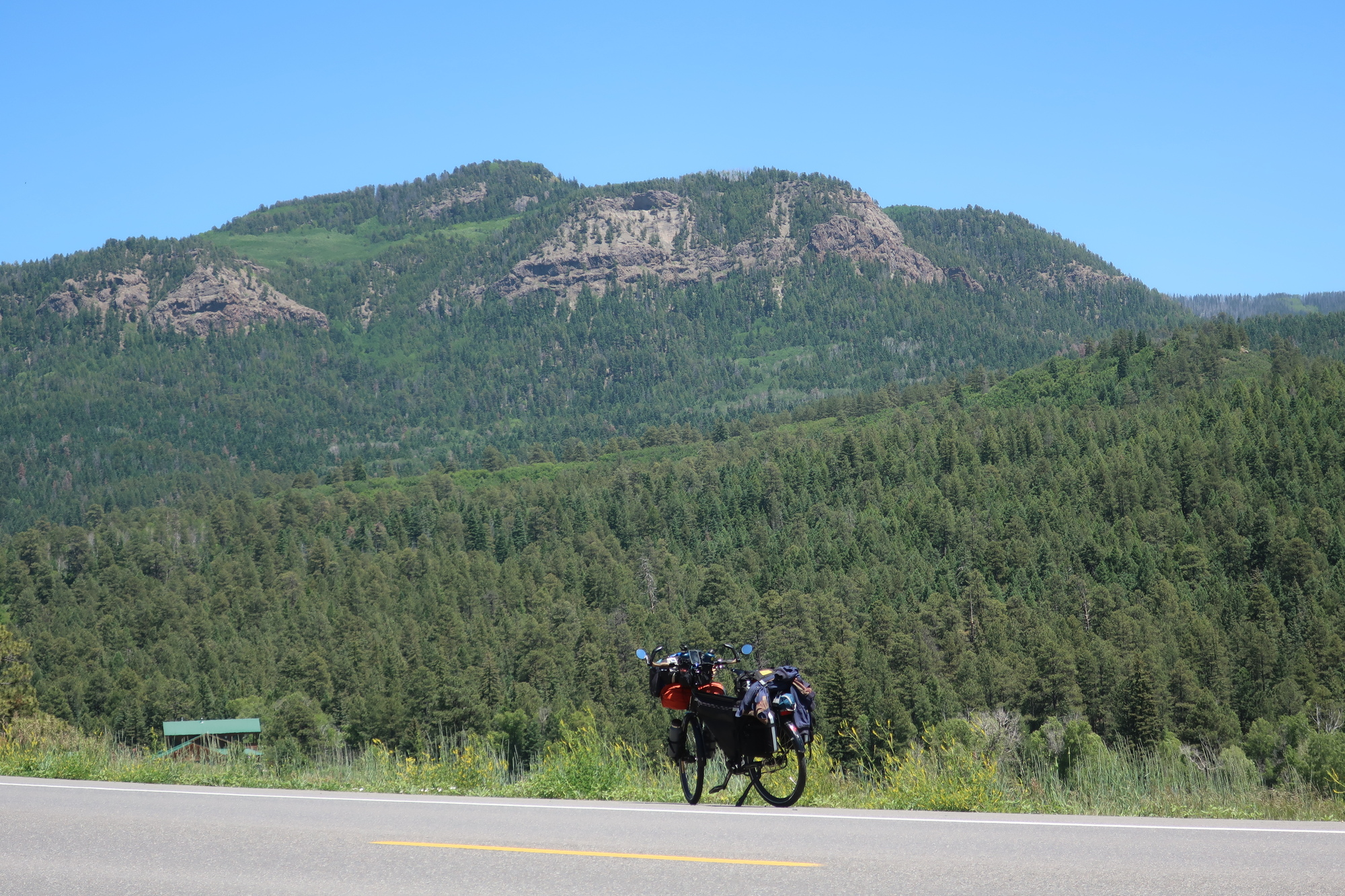 Chilly morning, had crackers with peanut butter for breakfast and set off for something more substantial in Pagosa Springs. I passed the turn off to Chimney Rock National Monument, a decision which I will regret but not today. After only a few miles I came upon a small store and got a coffee and donut, which was a nice unexpected treat. US 160 is really busy. There’s a nice wide shoulder so it’s not tense riding, but there are so many cars that it just gets plain loud. Pagosa Springs itself was a construction nightmare, I didn’t spend long there. Picked up some supplies for tonight, had brunch and then left. Noisy though it was, the road was absolutely gorgeous, I would often have to stop and stare. I don’t know if it’s the green, or the water or the mountains or the temperature, but all combined it was a sensory delight. I enjoyed today. I’ve seen the grade for tomorrow’s climb over the pass and it does not frighten me. My funk is gone.