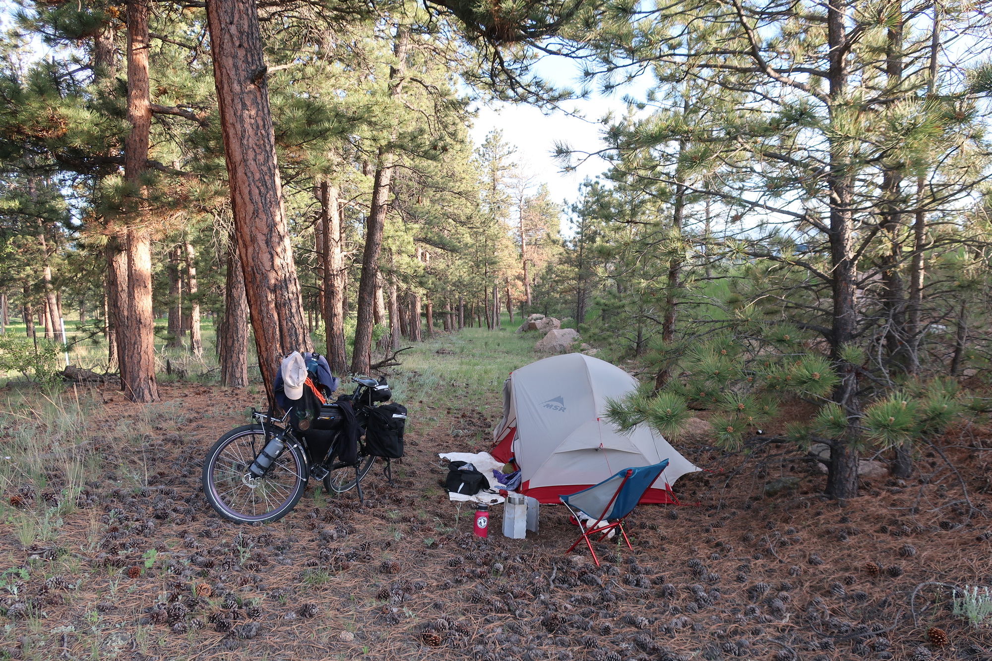 I seriously overestimated how long it would take me to get to Denver, two days would have been sufficient. I decided to call it a day around 4 pm when I saw a nice spot next to the road well hidden from traffic. I could have easily gotten to edge of the city with the daylight remaining, but much easier to sleep up here than figure it out down there. There’s only 45 largely downhill miles to go so I’m well on track to getting to my hotel in Denver tomorrow.