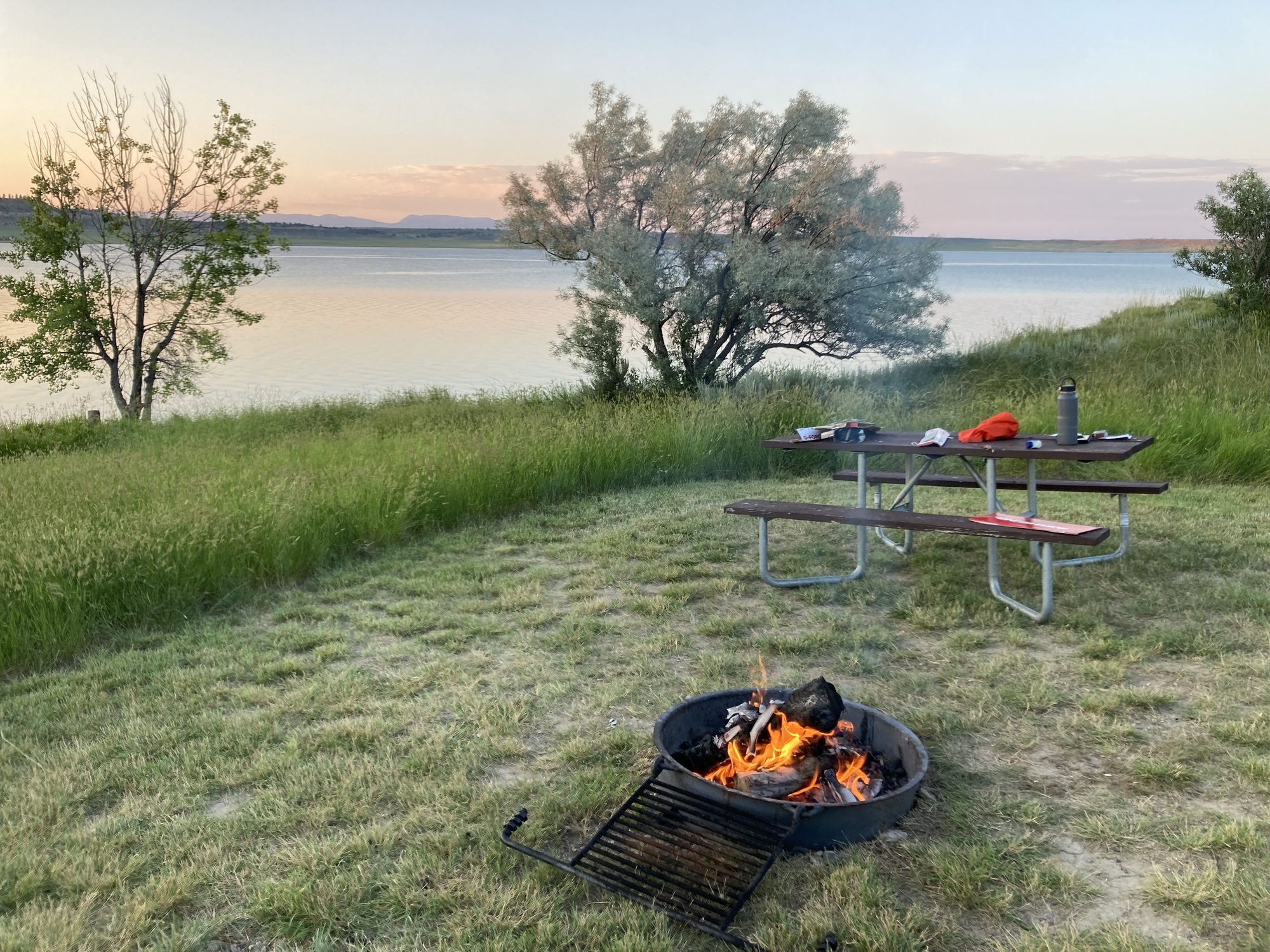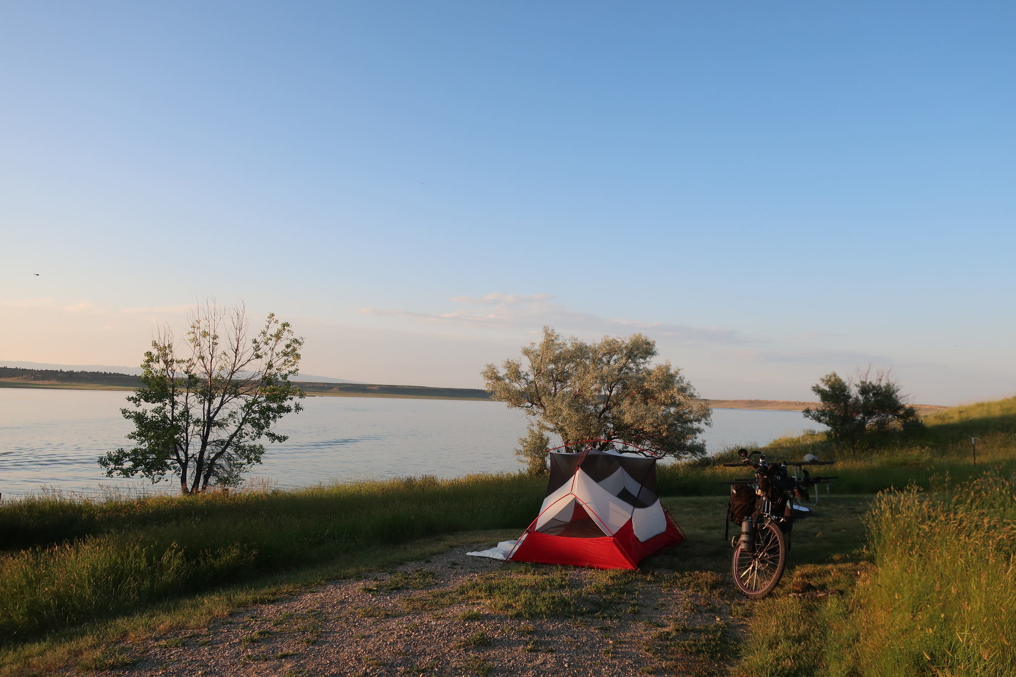 The first 40 miles out of town were across prairie, with barely any trees at all. Just isolated houses miles apart and an occasional tiny hamlet. With no shelter from the sun, no shelter from the wind, and nothing really to look at, it was a welcome change when the road tuned west at Lavina and started to follow a river. Cliffs and trees lined the river and making it an altogether different experience. I stopped for food in Ryegate and then camped by a reservoir a few miles down the road. I’d hoped to have gone further, all the way to Harlowton, where there was a park for camping and a restaurant for breakfast, but with the wind I was back to my normal, slower pace and it was going to be difficult to get their before sunset.