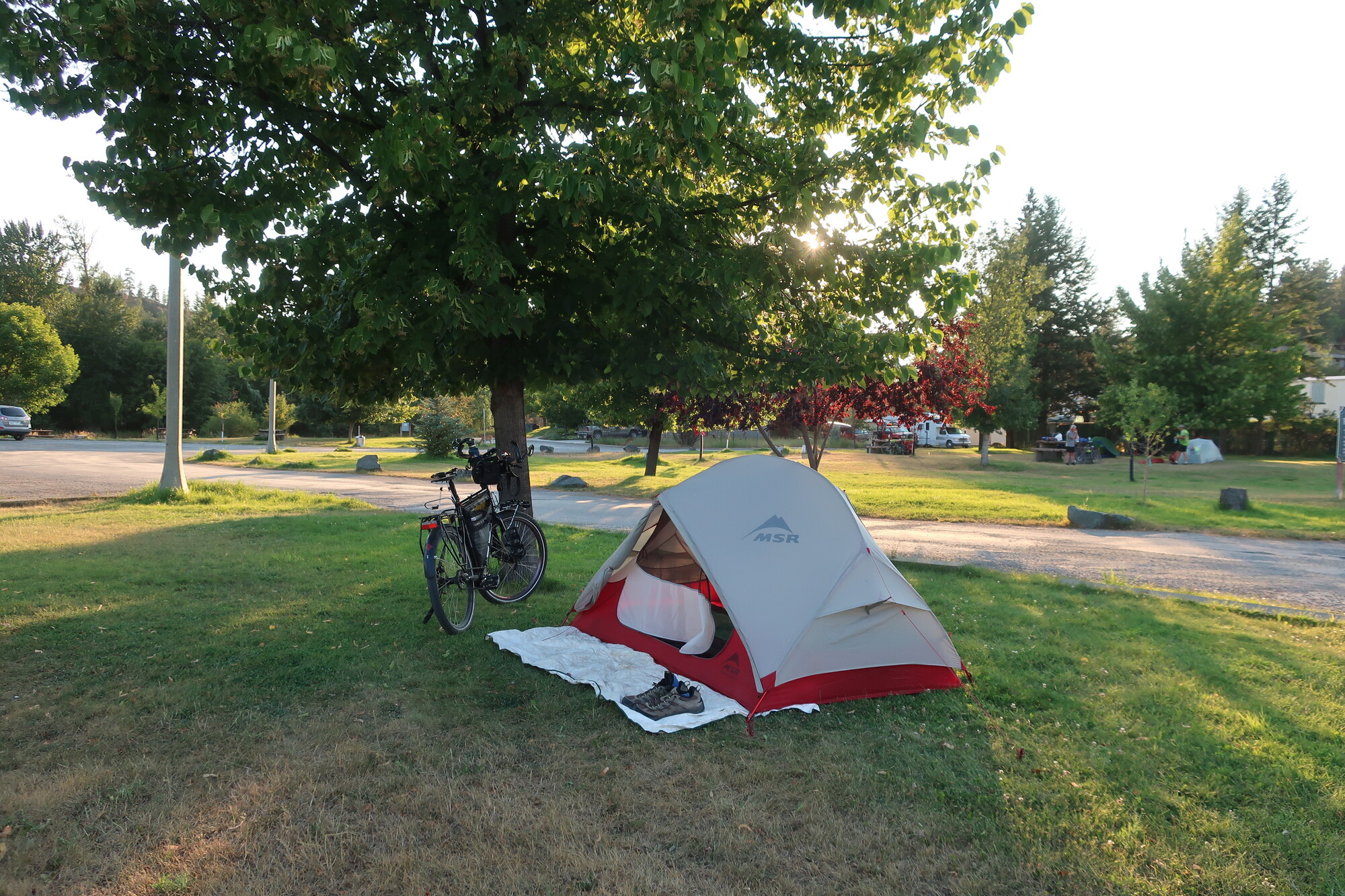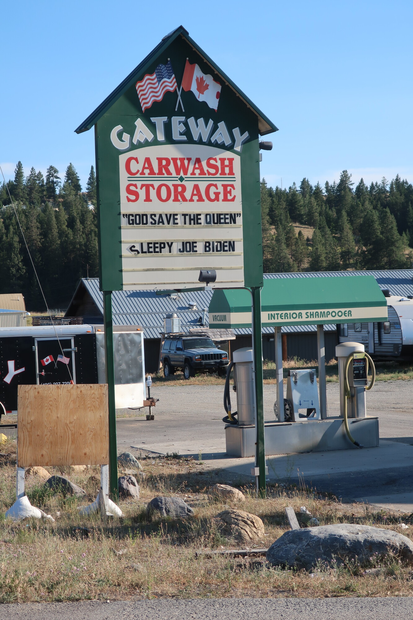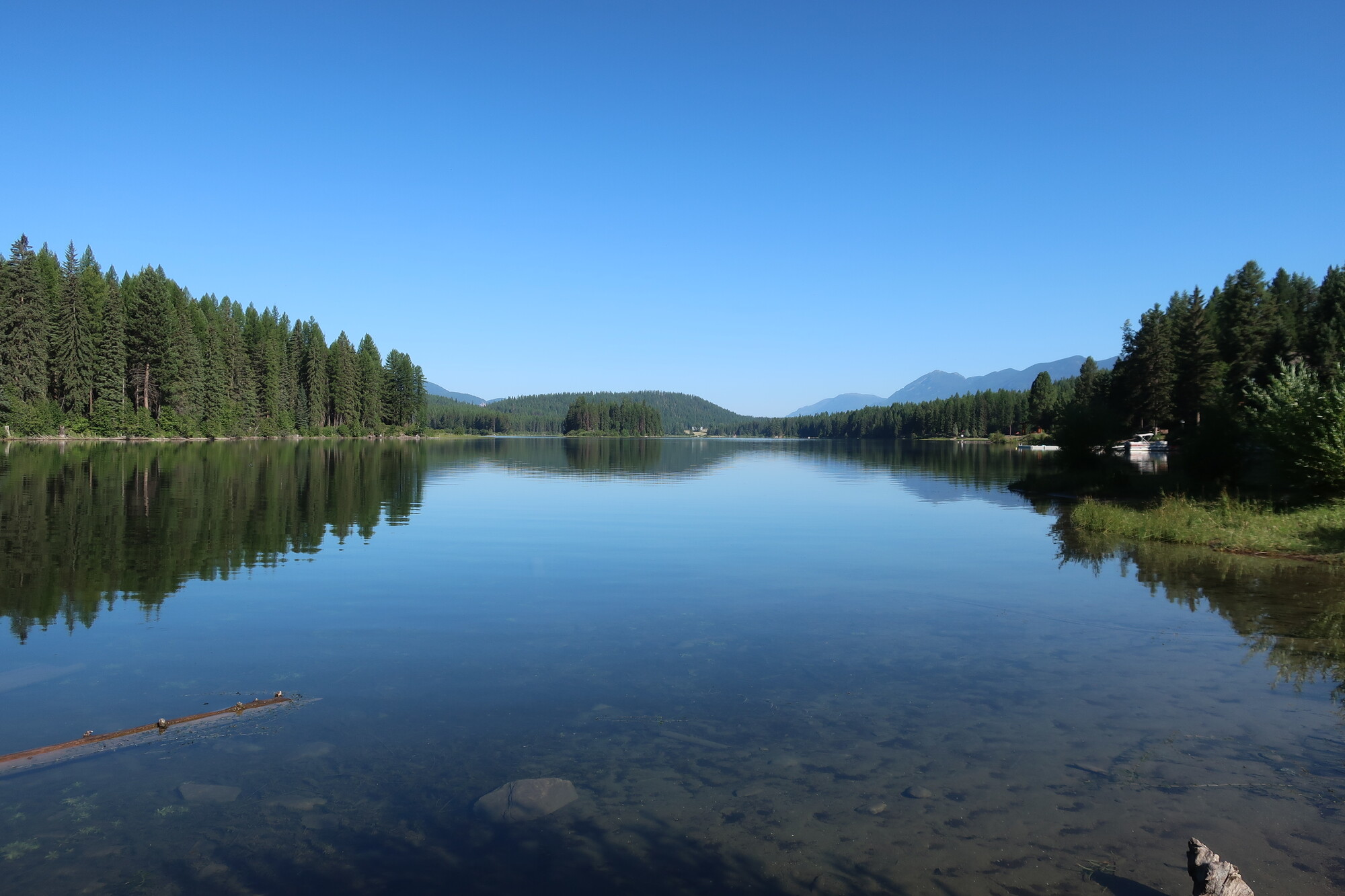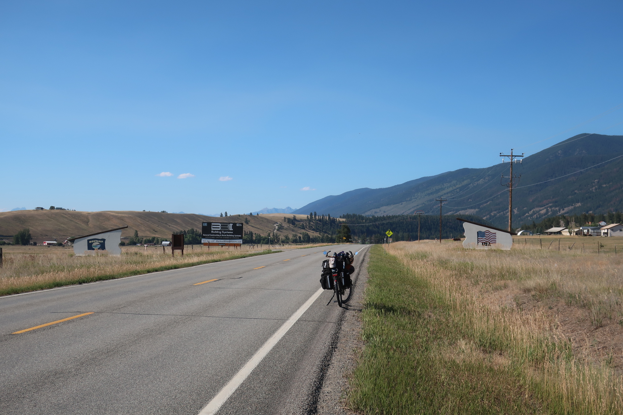 It was an easy ride to Eureka, slight tailwind, no serious climbs and lots of lakes full of deep blue water. I got to town around 2, had lunch and hung around in the park for several hours waiting for the temperature to drop and to see what the winds were doing. About 5 I decided it had cooled off enough and the wind sufficiently manageable to make a 16 mile out and back trip up to Roosville to touch the border worth while. There’s not much up there but a duty free store on the US side and a border post on the Canadian side, but it does tick a box. I went up to the edge, took a photo and came back to Eureka. I’m camped across the street from the Exxon station at the entrance to town. Nice, but noisy.