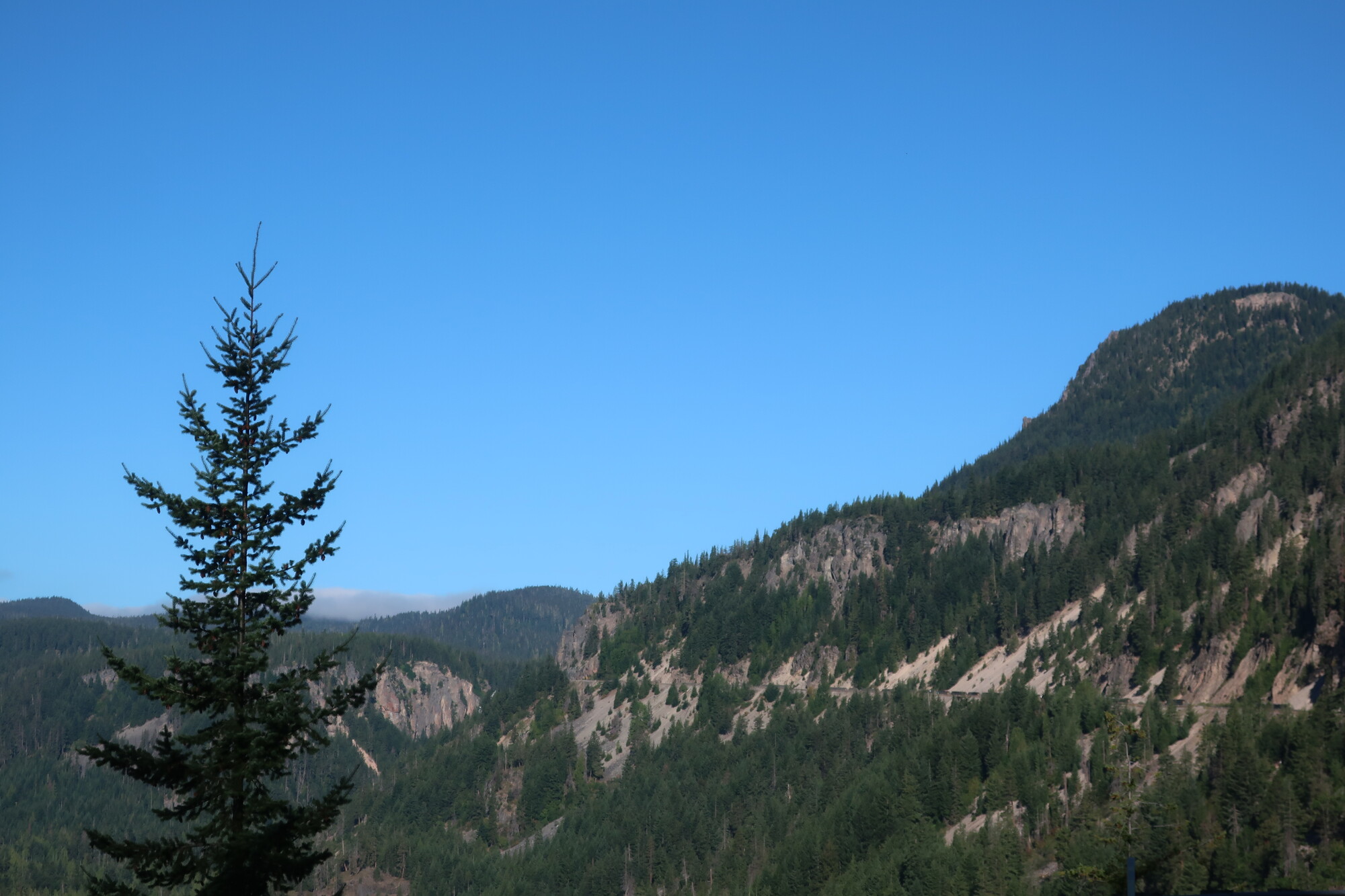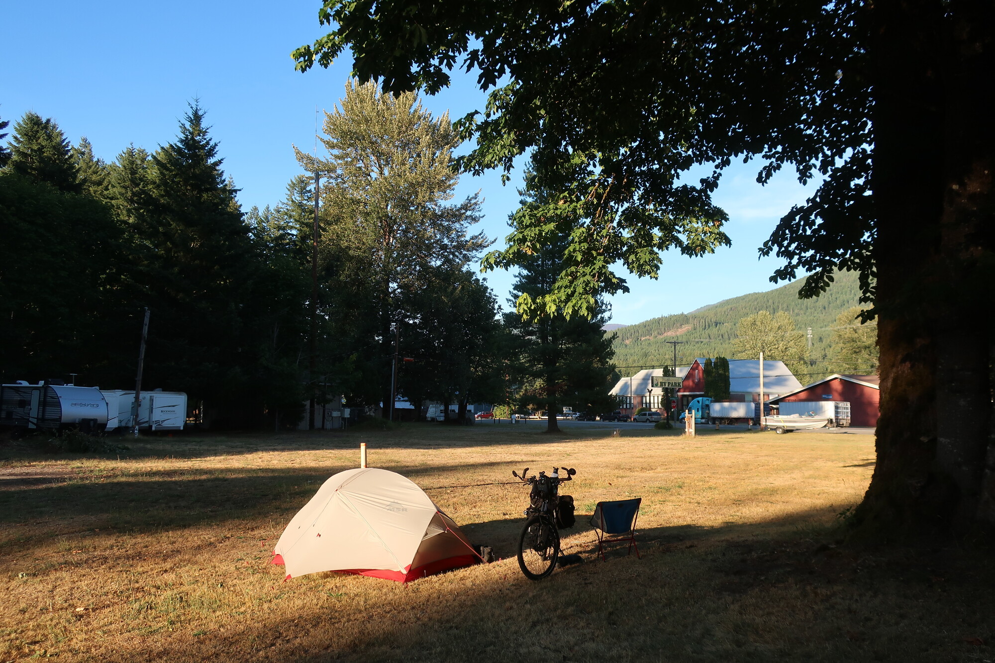 It was a slow grind up to the top of White Pass, not terribly hard but I was feeling lethargic and took lots of breaks. No wind until after I crested, that made me feel even better about quitting early yesterday. My rear tire went soft and I said oh shit, I don’t want to deal with this. I pumped it up and continued and hours later it is still full and tight. I’m assuming it’s the slime inside that sealed a leak, but I’m not over thinking it. I decided to stop in Packwood when I found an RV park with $10 camping, showers and a brew pub across the street.