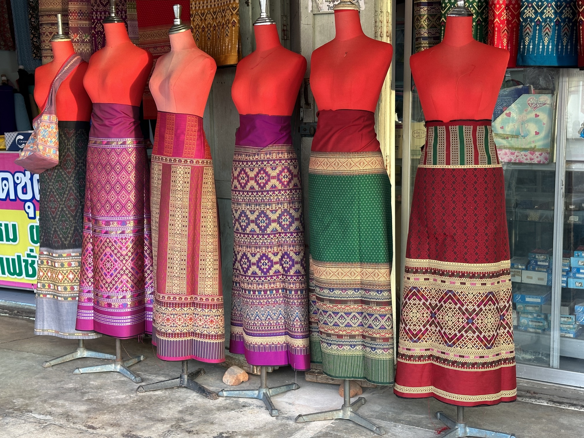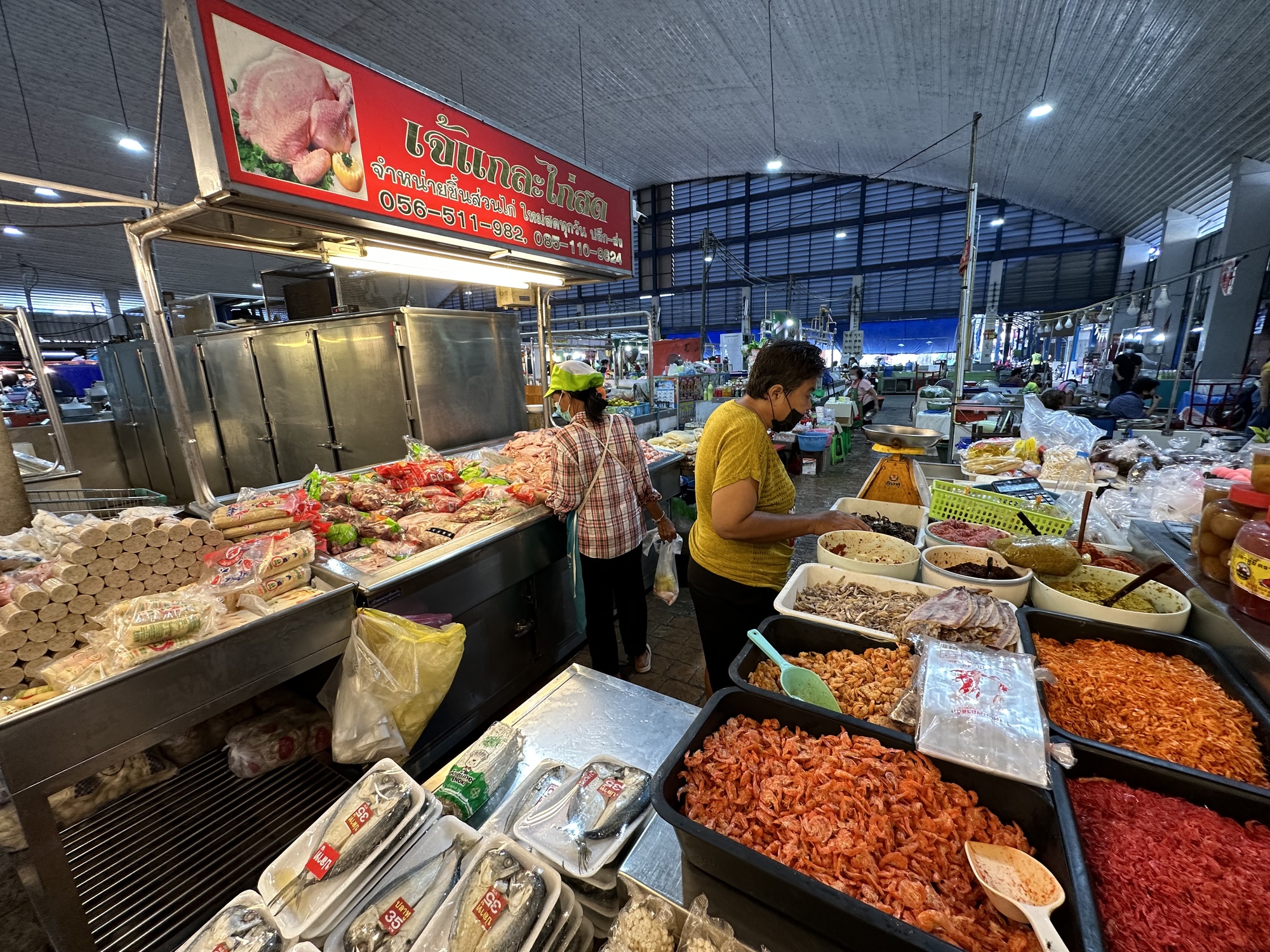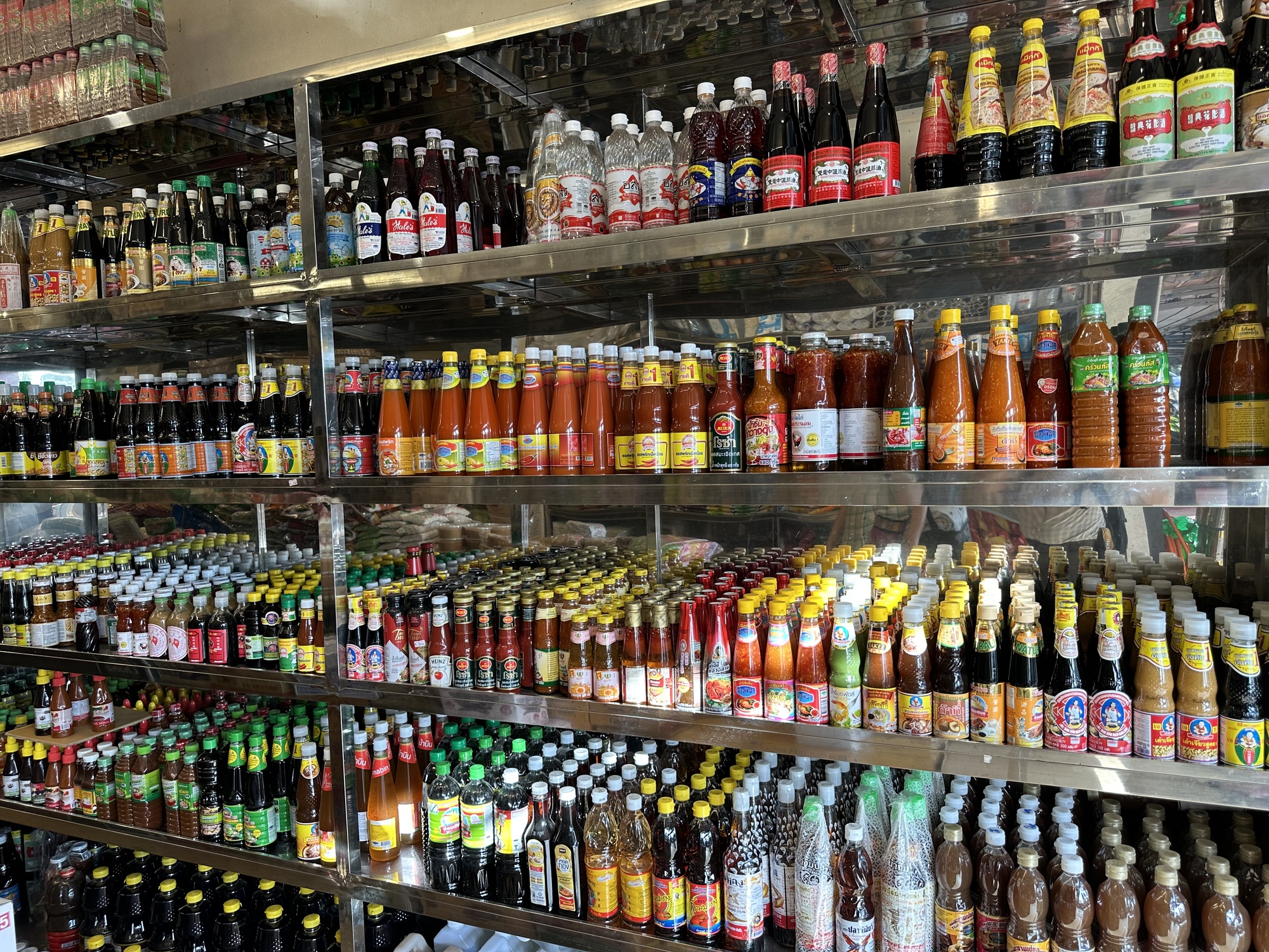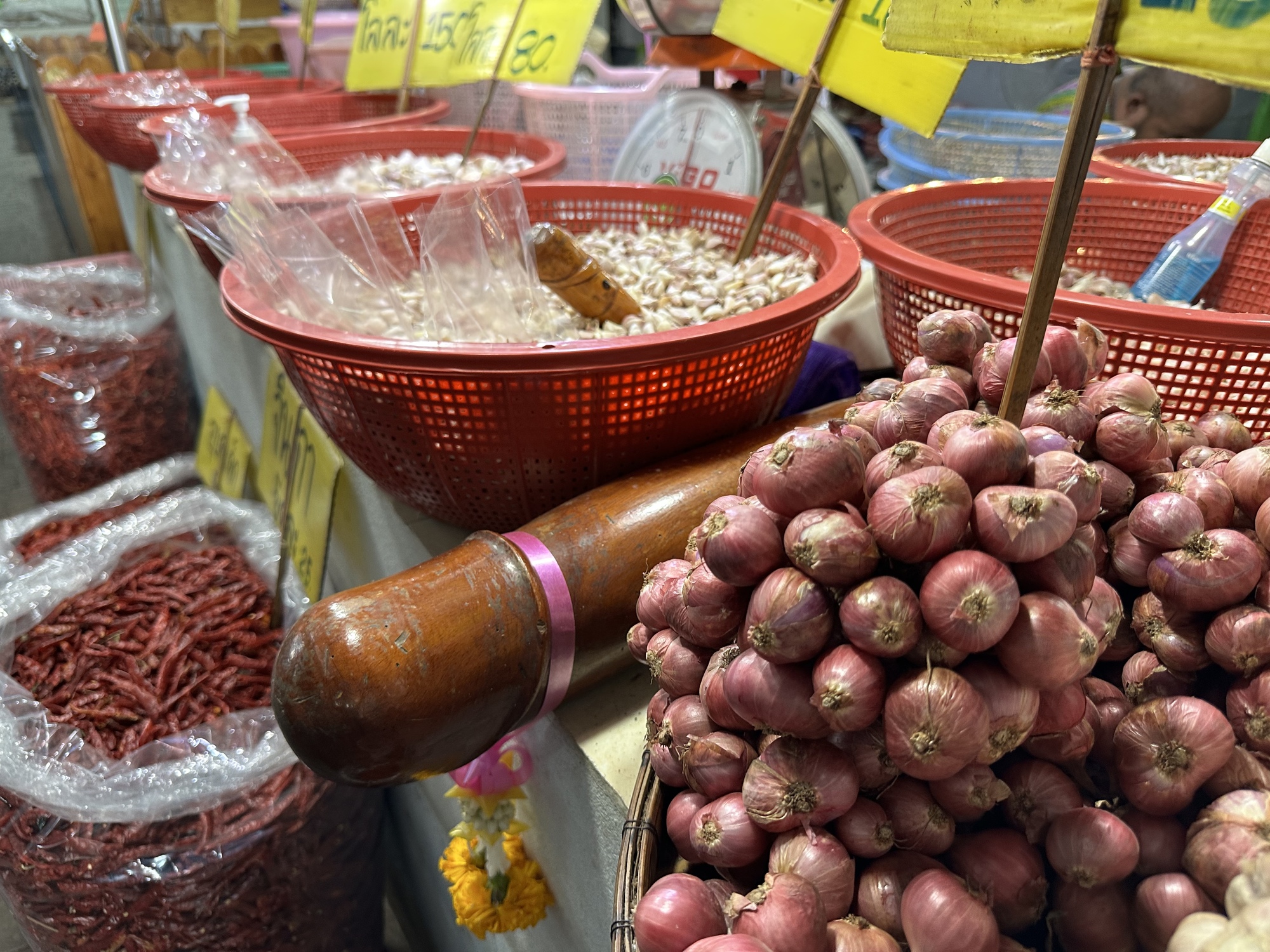 Sure enough we found a sweet old couple’s living room in the market where amongst the piles of this and that was a table covered with the day’s newspapers where the farang could sit with lovely glasses of caffe boulan, with requisite layer of sweetened condensed milk at the bottom. Mae and Khun Pa sailed around their cluttered room doing various tasks, Mae spooned hot rice out of the rice cooker into plastic bags to sell out front, Khun Pa tidied up around the boulan pots.