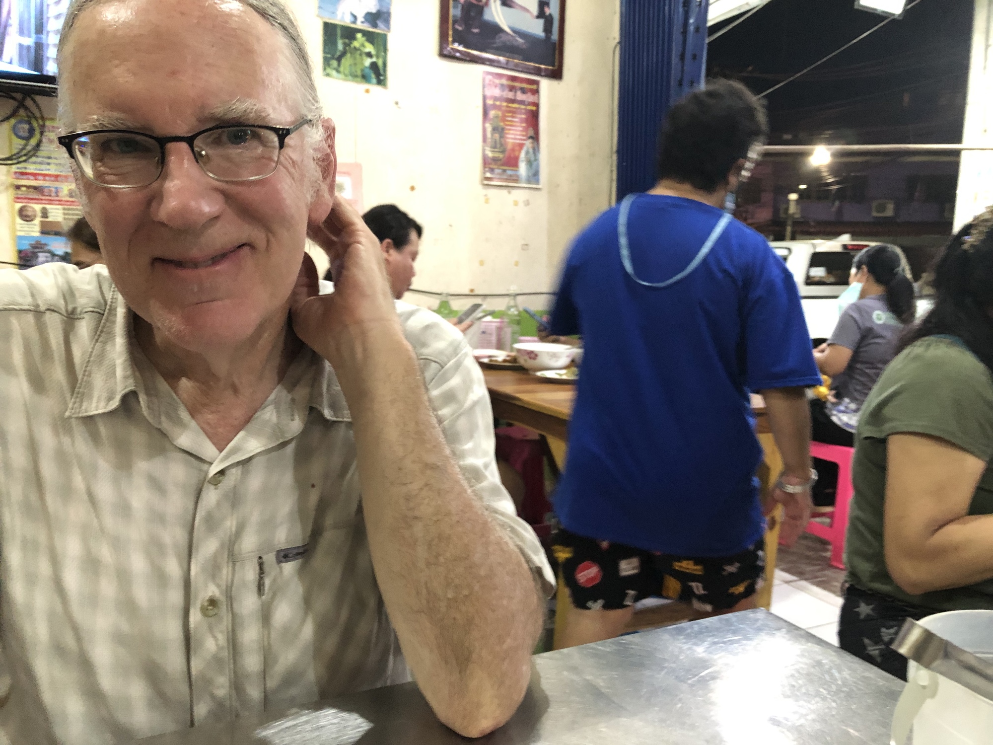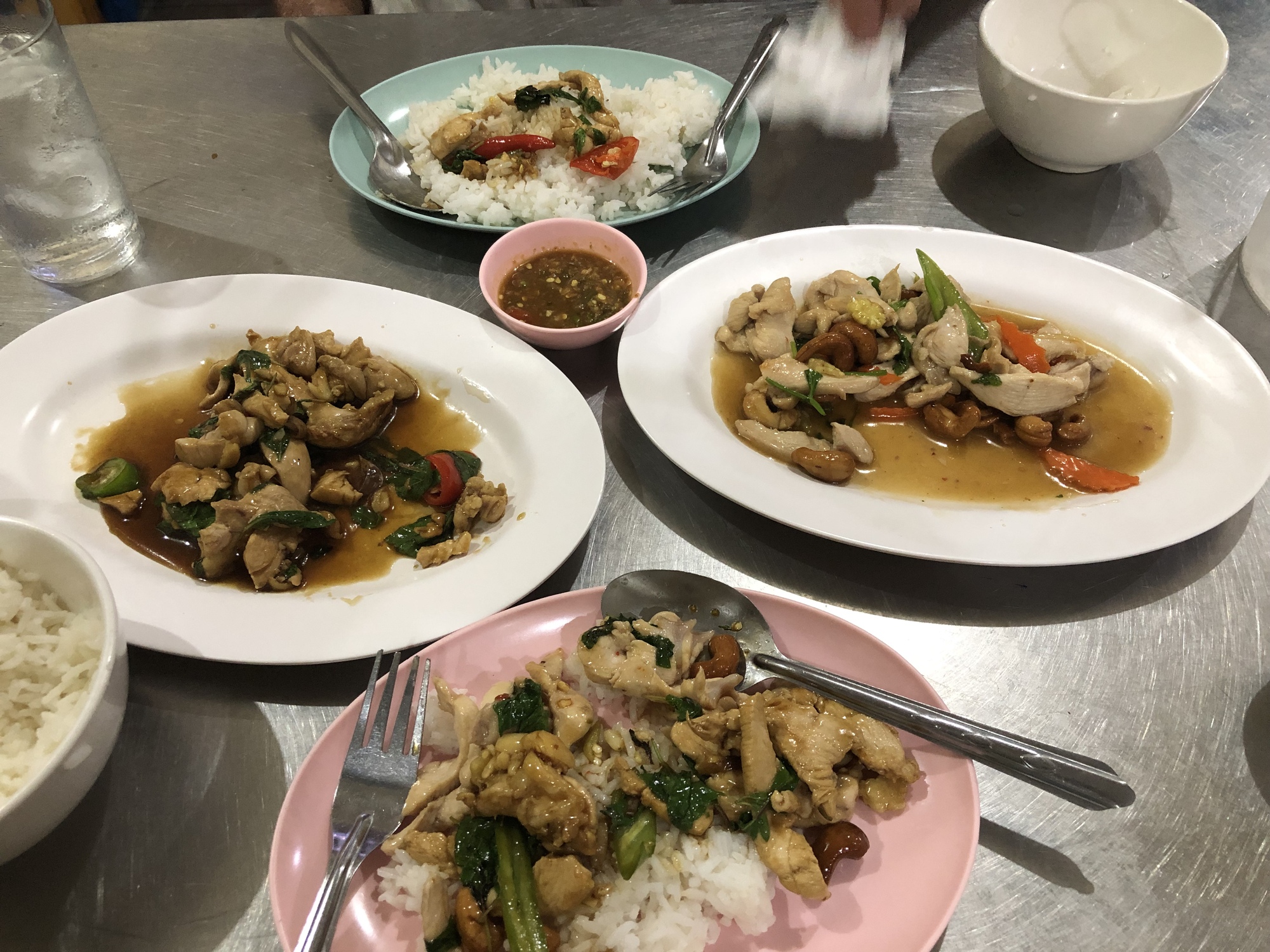 Soon he returned unfallen and we set out to find some dinner and check out the mystery festival. Things were jumping in downtown Uthai Thani but we were shoehorned to a table in one of the very busiest restaurants in town and had two different chicken dishes that we shared and watched the staff running around taking orders and delivering ice in buckets. A little girl no more than eleven years old walked carefully through the very crowded restaurant with a tray full of tiny bowls of liquid spicy condiments. She was shy but precise, and when we asked for another round looked pleased with herself, as she should be.