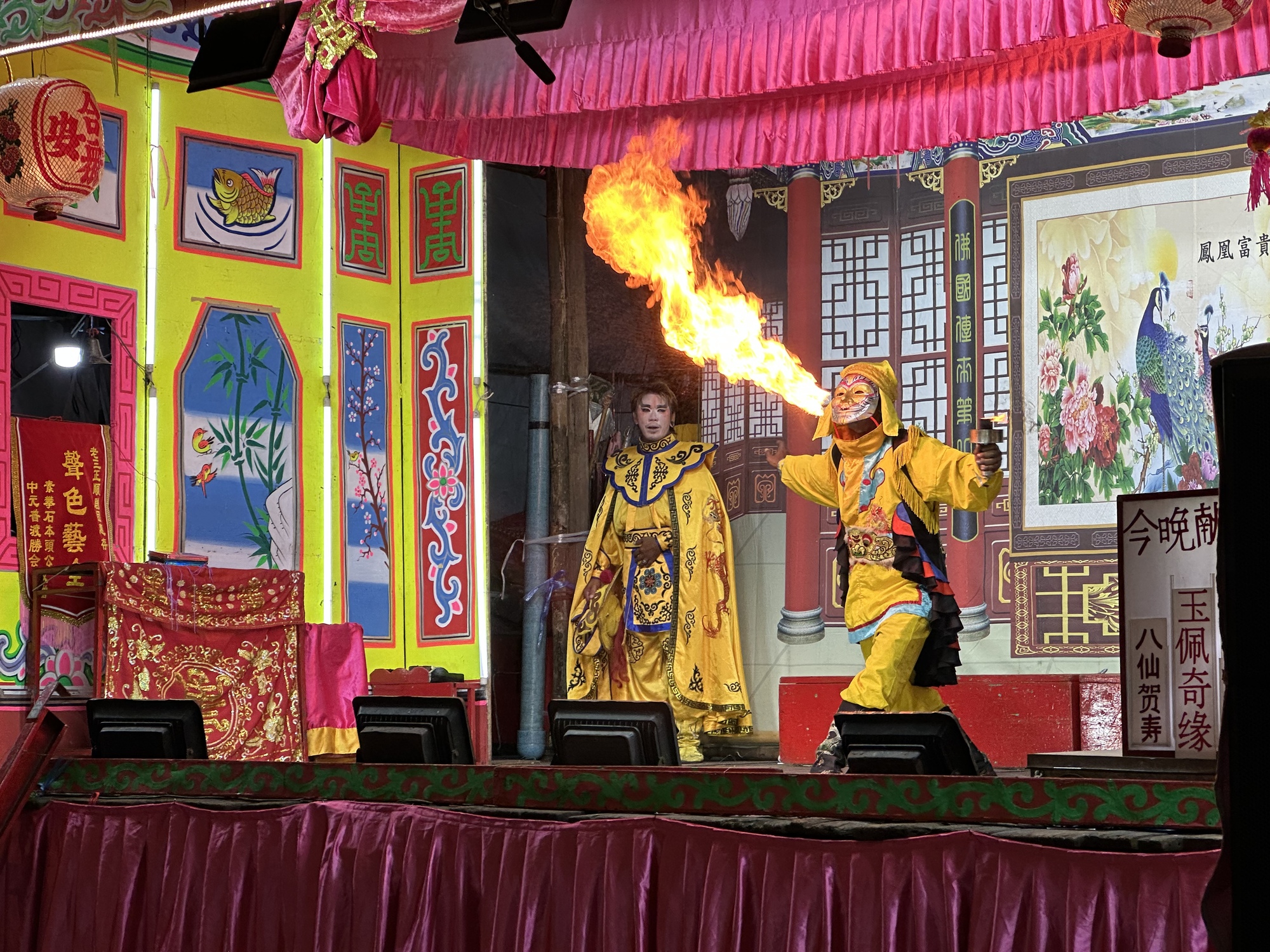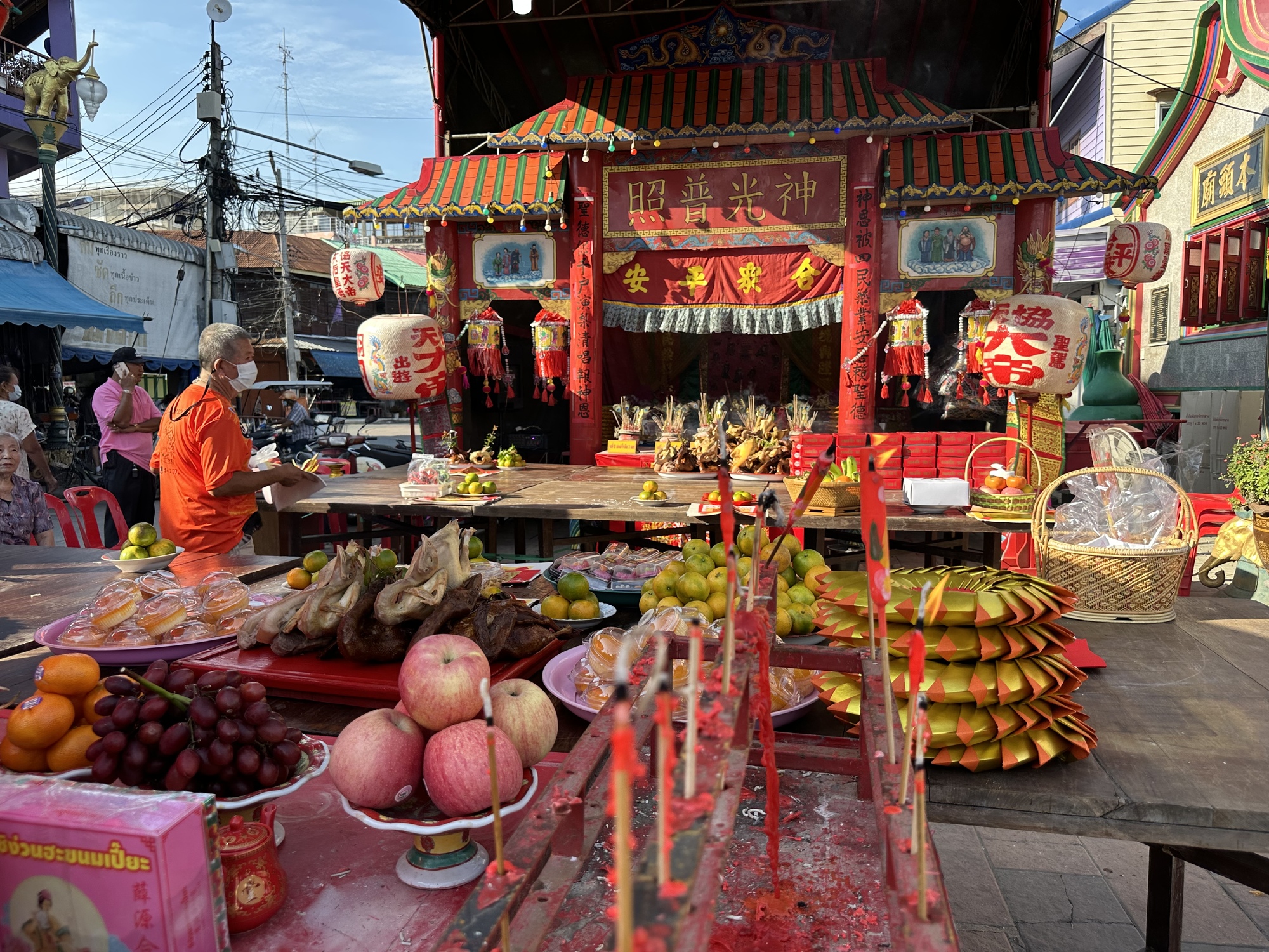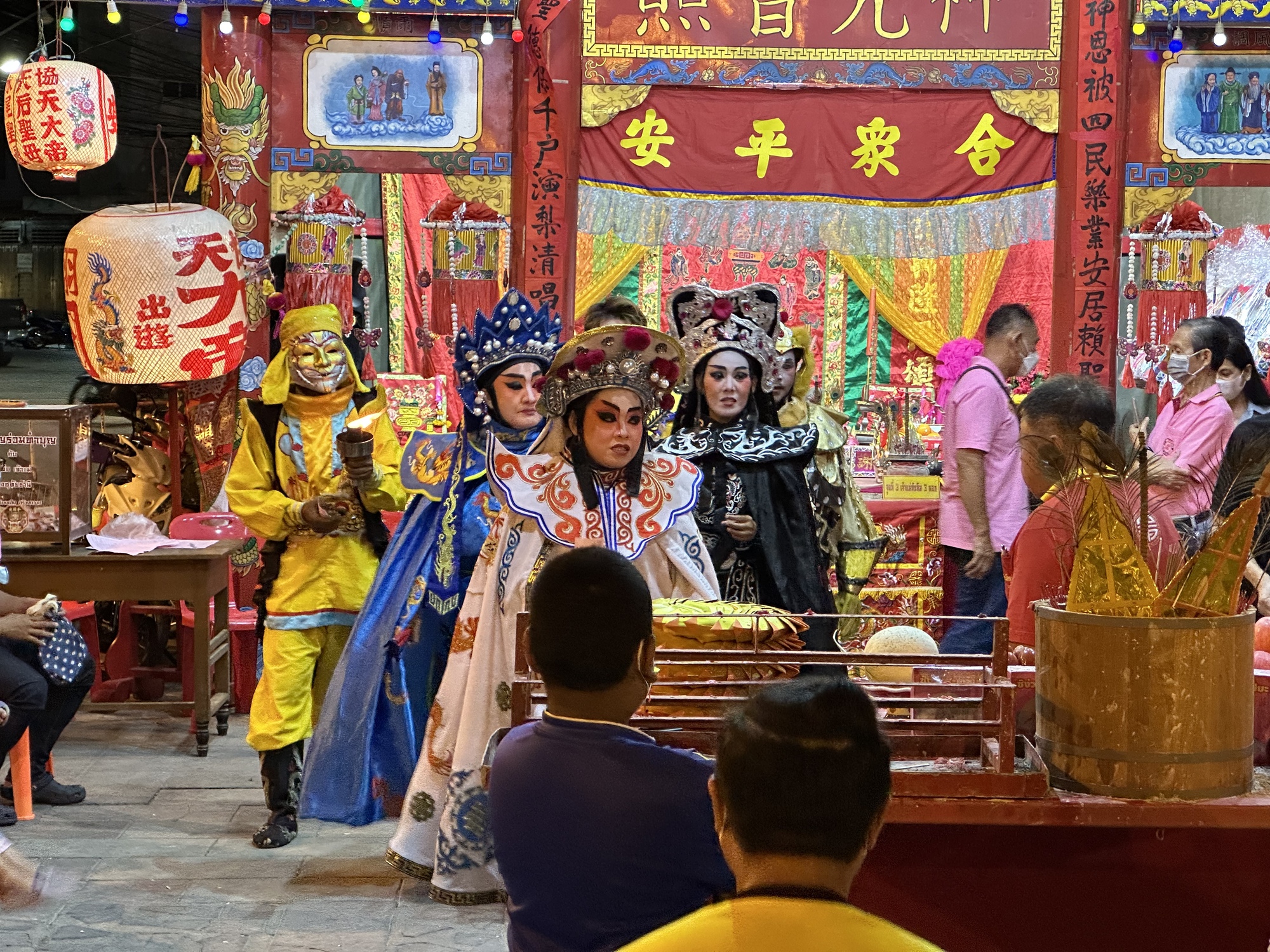 The mystery festival was some sort of Chinese religious event. There are lots of ethnic Chinese Thais and they very proudly celebrate their cultural traditions. There was a dazzling shrine set up and a nearby stage with actors dressed up in glittering costumes, it was a blast. Small children gathered near the stage to dance around and jump in shock when the fire-eater character tried in vain to set the curtains ablaze. I jumped in shock too.
