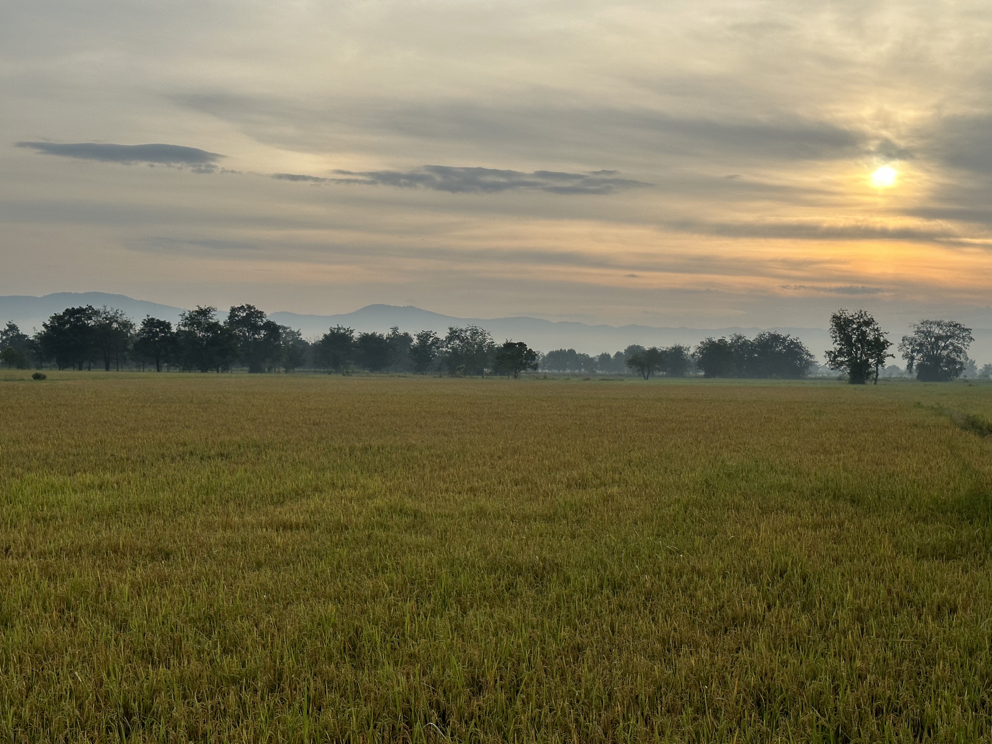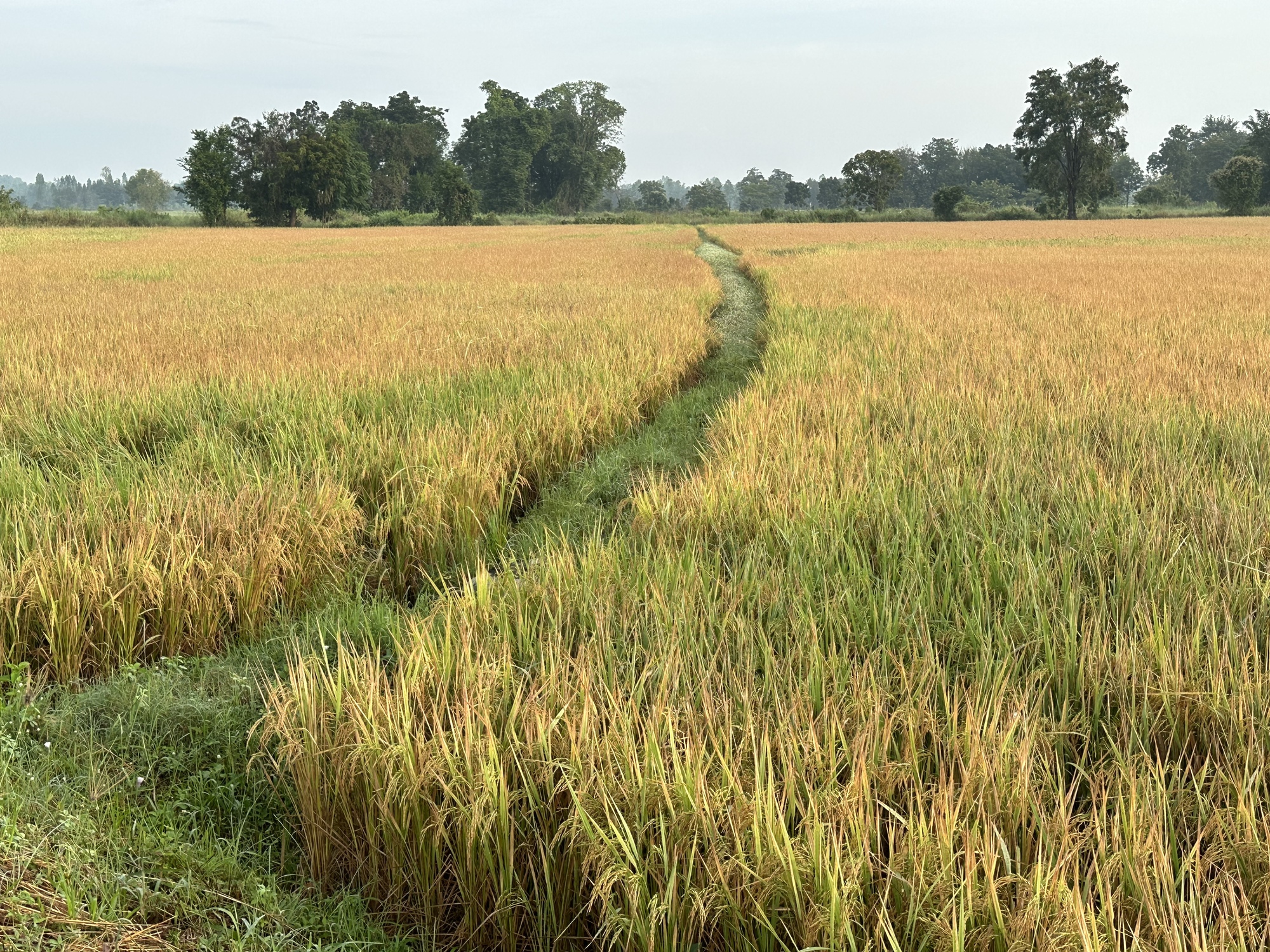 I could mention the headwind we have had this entire trip. We were so excited about going north for the first time ever which meant the sun wouldn't be in our eyes or blasting our skin. However we hadn't considered that the prevailing winds this time of year in Thailand might be from the north. But why would I mention the slight headwind? It's just a breeze in our faces. It's hardly been a problem and in fact we have welcomed the breeze because it's been cooling us a bit. The slight breeze bobs the tall grasses that crowd the shoulders of the little roads making them even more narrow. Their seed-head shadows dance on the cement as I ride over them.