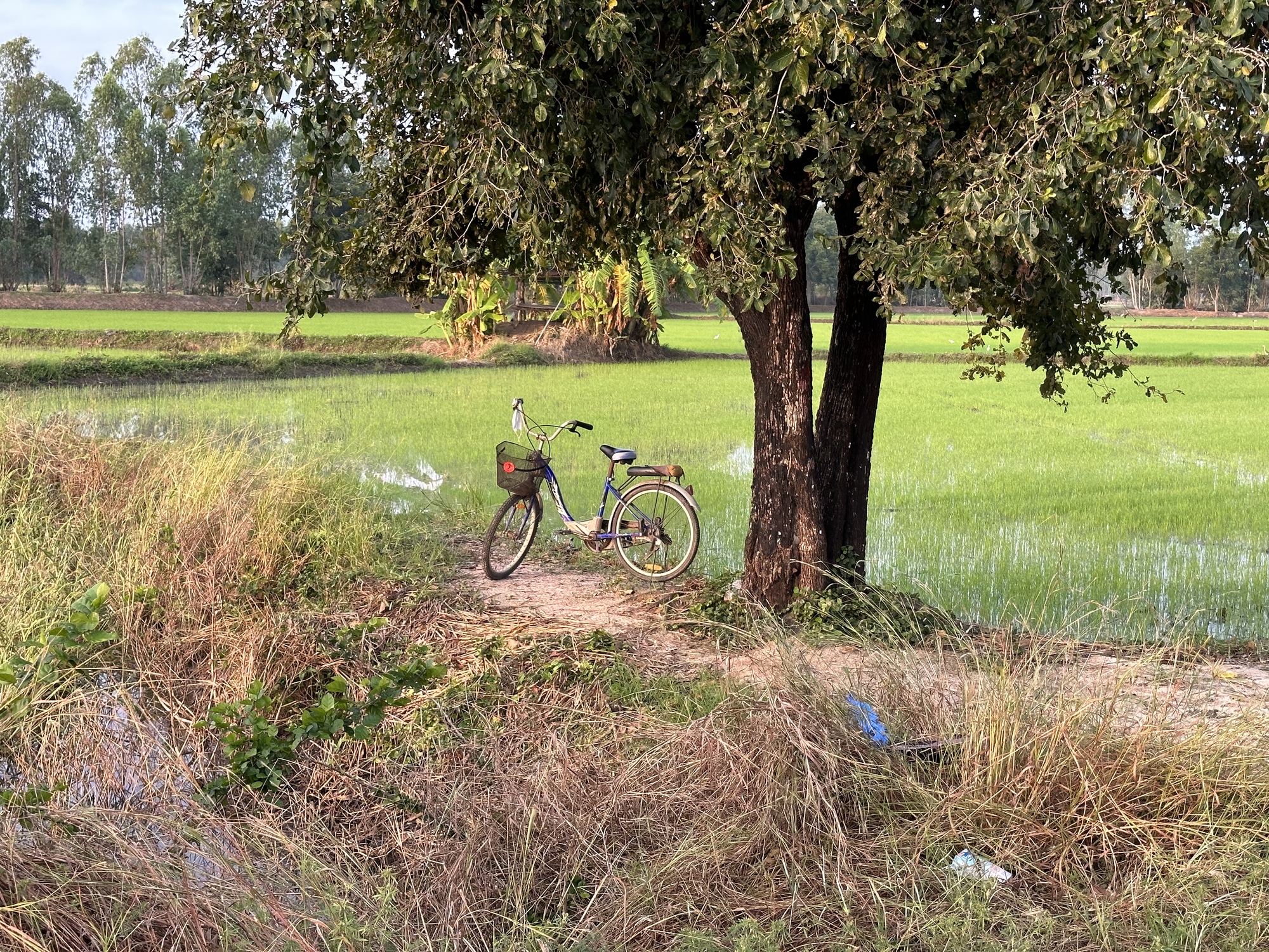 I shouldn't mention how hot it's been either. No, actually it's not the heat but the humidity which has been 98% every morning when we set out from our guest house bungalow around 6AM. How is it even possible to be such high humidity if it isn't raining?! Our mirrors fog up. My glasses fog up! But my mind does not fog over and instead is excited. Why would I mention heat and humidity? We can't do anything about it. It comes with the territory and maybe is why all the birds sing their hearts out and dogs are dead tired sleeping dogs, and live snakes, we have not seen, thrive and frogs happily croak in the rice paddies, rice as far as we can see, life-giving rice and people waving, smiling, welcoming and the lovely music coming from their radios they play loudly in their homes which makes me linger on my bike slowing to a near standstill as I soak in as many notes as possible before I pedal on.
