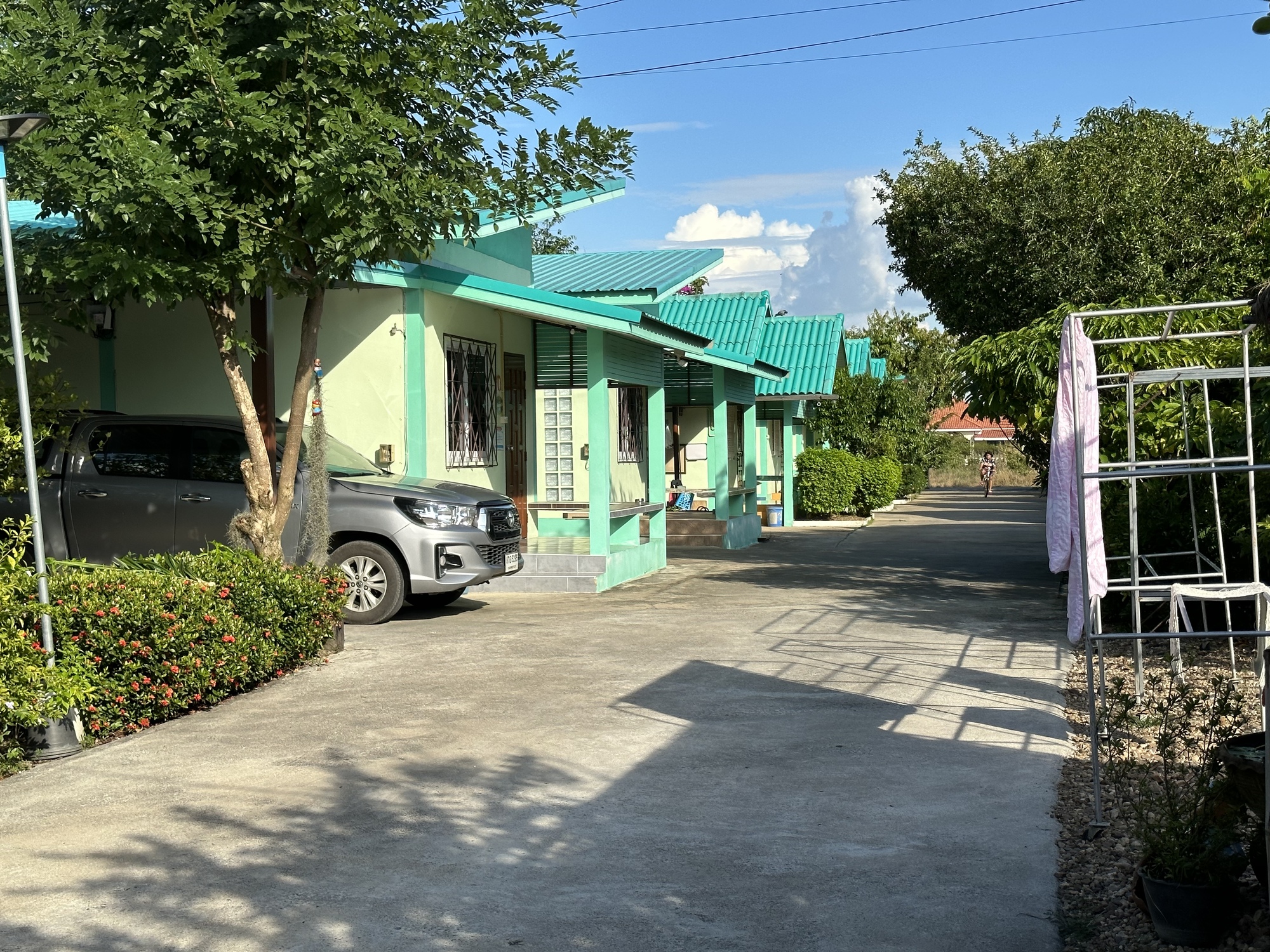 Let’s be clear here. The so-called “resorts” we stay at are sometimes mainly love hotels, rentable by the hour. The ubiquitous “24 Hours” signs seem to have mostly disappeared but the ones we have chosen are far from seedy, they have a lot of garden plantings, are spotlessly clean, and provide a locked door, a hot shower, air-conditioning, and a small refrigerator to chill our water bottles in.There is always a tv but Thai programming is the worst, mainly shopping channels and Korean soap operas, so we don’t indulge. Oh, and WiFi! Gone are the days when Thai WiFi was the worst in SE Asia, we’re on 5G networks all the time and thus far have not lost any of our facilities.