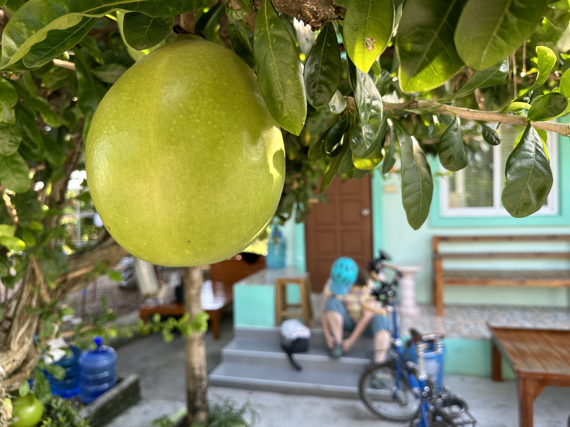 How we deal with personal discomfort is always going to be a work unfinished, isn’t it? On the other hand, it’s not just being tough or sucking it up, you have to be smart and not crap on your health by getting heat illnesses either. The schoolyard was adjacent to a temple grounds so Bruce pedaled off to find a hong nam. Peeing is not an issue for me in this heat, believe me. It doesn’t even cross my mind. So I sat on a whimsical strawberry stool on the kindergarten playground and gloomily contemplated my prospects.