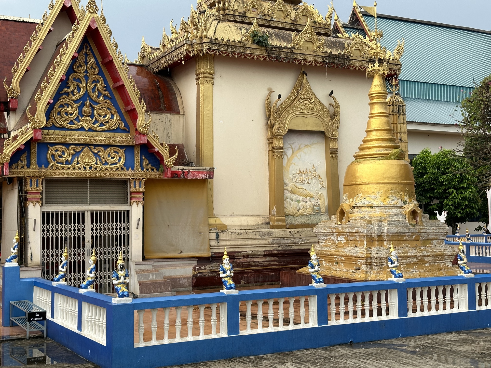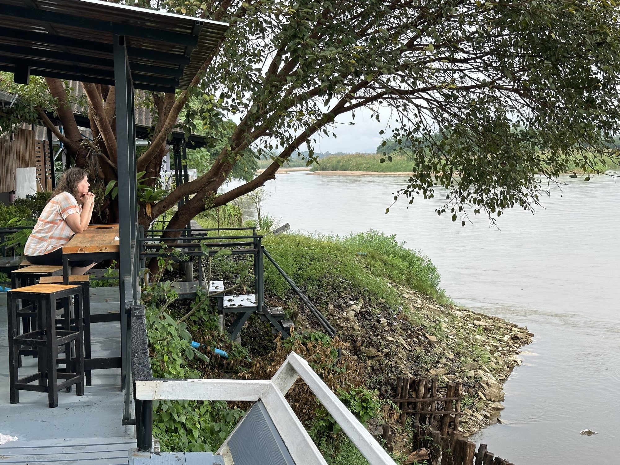 Anyway, our resort is right next to the Ping River which is beautiful. The Ping is very full and running fast but it’s not as full as it was a month ago. It looks like this resort lost some of its little sitting area to the river recently. It also seems as though things have changed at this resort. We’re pretty sure they used to have a restaurant but when I asked about food I was told there was a place 1.8 kilometers down the road. There is a big sign advertising their coffee too but there is no evidence that will be happening. We think Covid really changed places like this. The bungalows are all super nice and quite new but things must have been rough during Covid. I think they are waiting to see how many people come to stay here before they start offering a lot of extras like food and coffee.