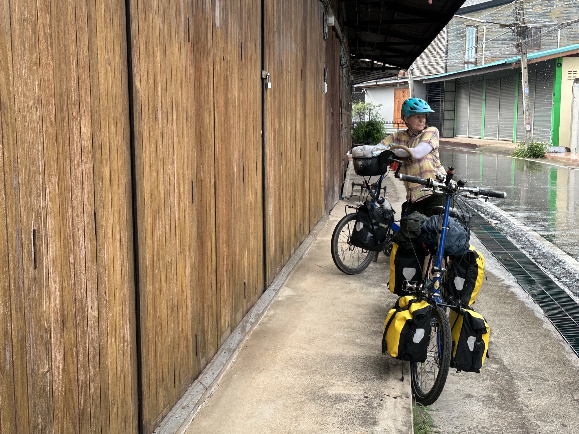 We got going an hour and a half late but it didn't matter one bit. We had another ideal little road right along the Ping River. It’s only a mile or so parallel to the super highway which means it is the least vehicle’d road we’ve had yet. Most of the time we had the road all to ourselves. It was an easy day with only 23 miles to the only guest house for miles. Rain threatened but we laughed at it. It has been in the forecast for days but nothing ever comes down. This time it did start raining but only for about four minutes. We ducked under an overhang and didn’t get wet. Then we were dry all the way to our guest house. Once inside our room the skies opened up. We feel lucky we have escaped rain with most of it coming at night. I have a raincoat but Andrea does not. It’s still hot so getting drenched would not be that much of a problem and might be enjoyable.