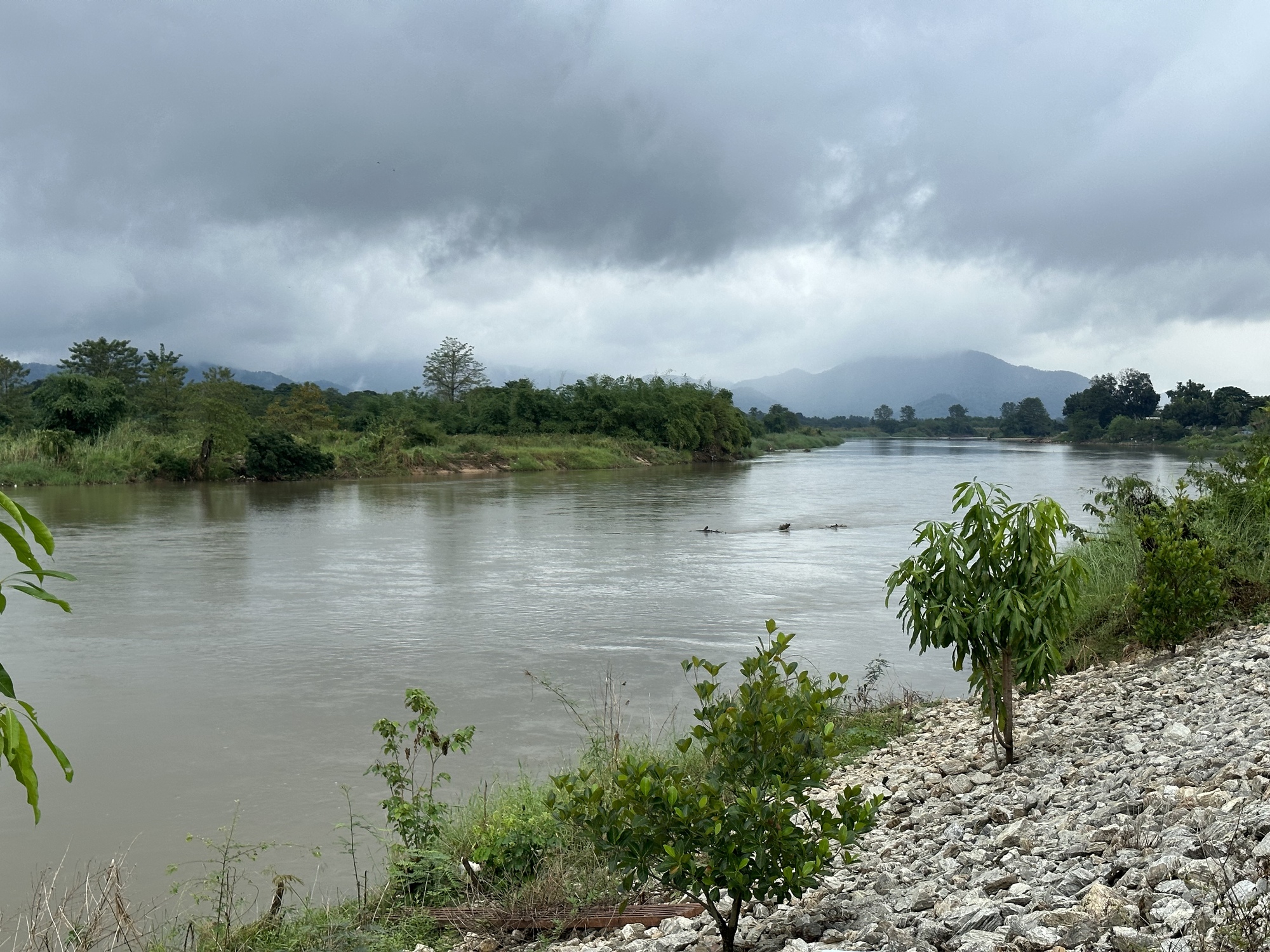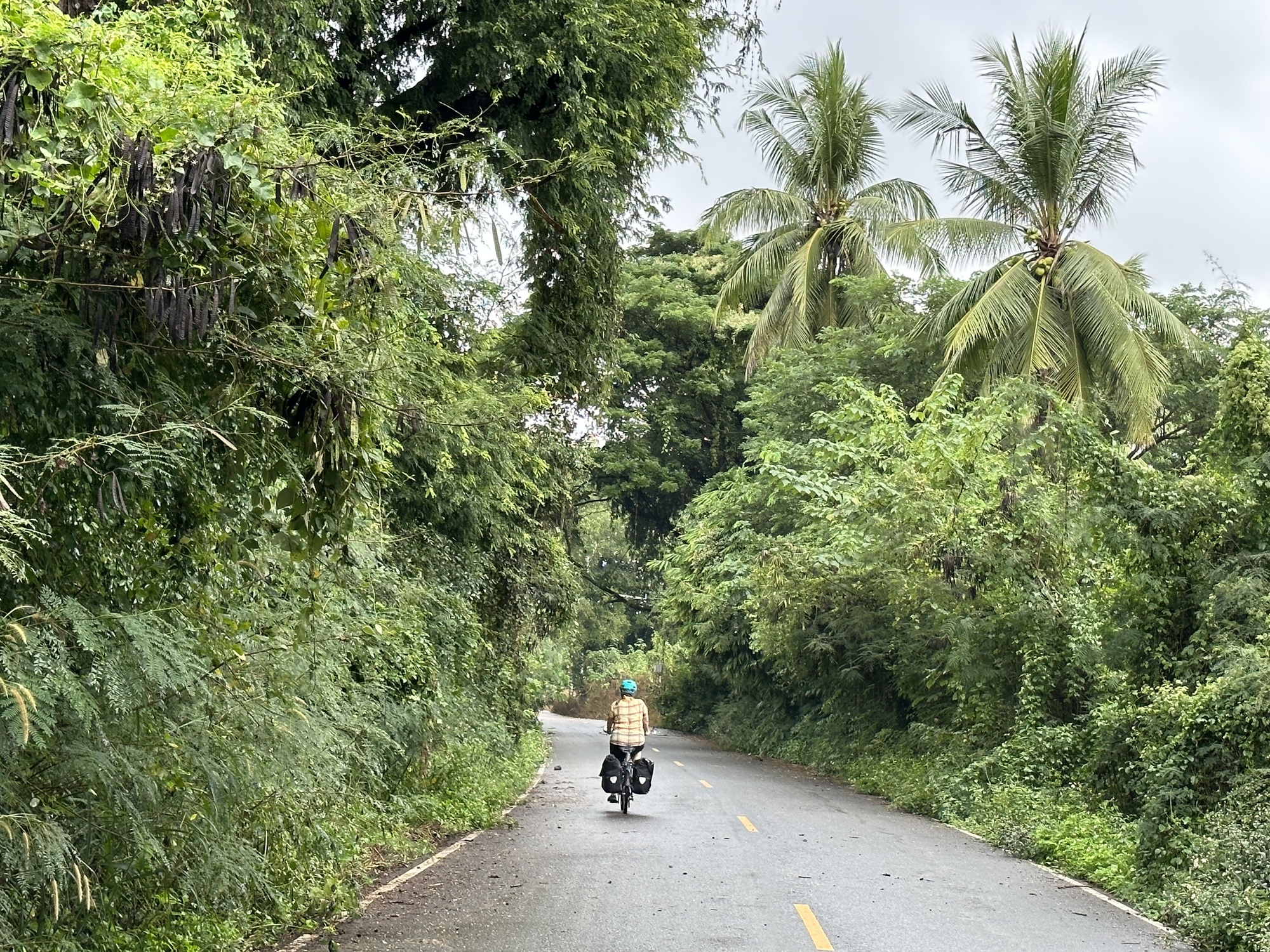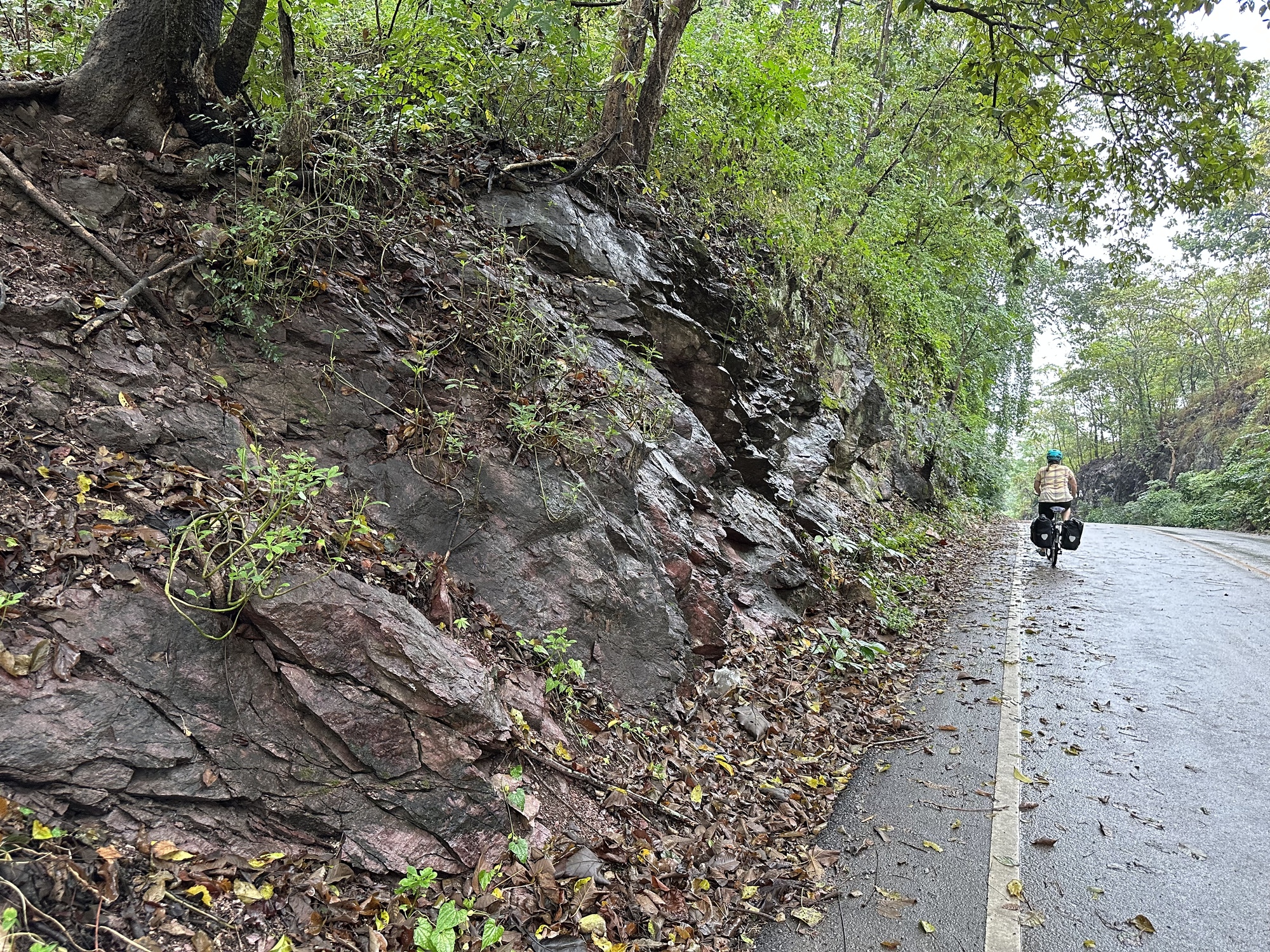 By then the rain had largely dissipated so we took off. At first the road had similar views as yesterday with lots of big rice growing areas before large hills to the west. But then it got more wild, the road narrowed and we were back right along the Ping River. There was a slight hill and a cleft chiseled out of solid rock which was something new for us. Everything was dank and dripping just like the way we were from sweat again. The Ping was so full and wide that it very much reminded me of the Mekong. There were many large sandbars and I could see how incredibly high the river had gotten recently by all the debris lodged up in trees.