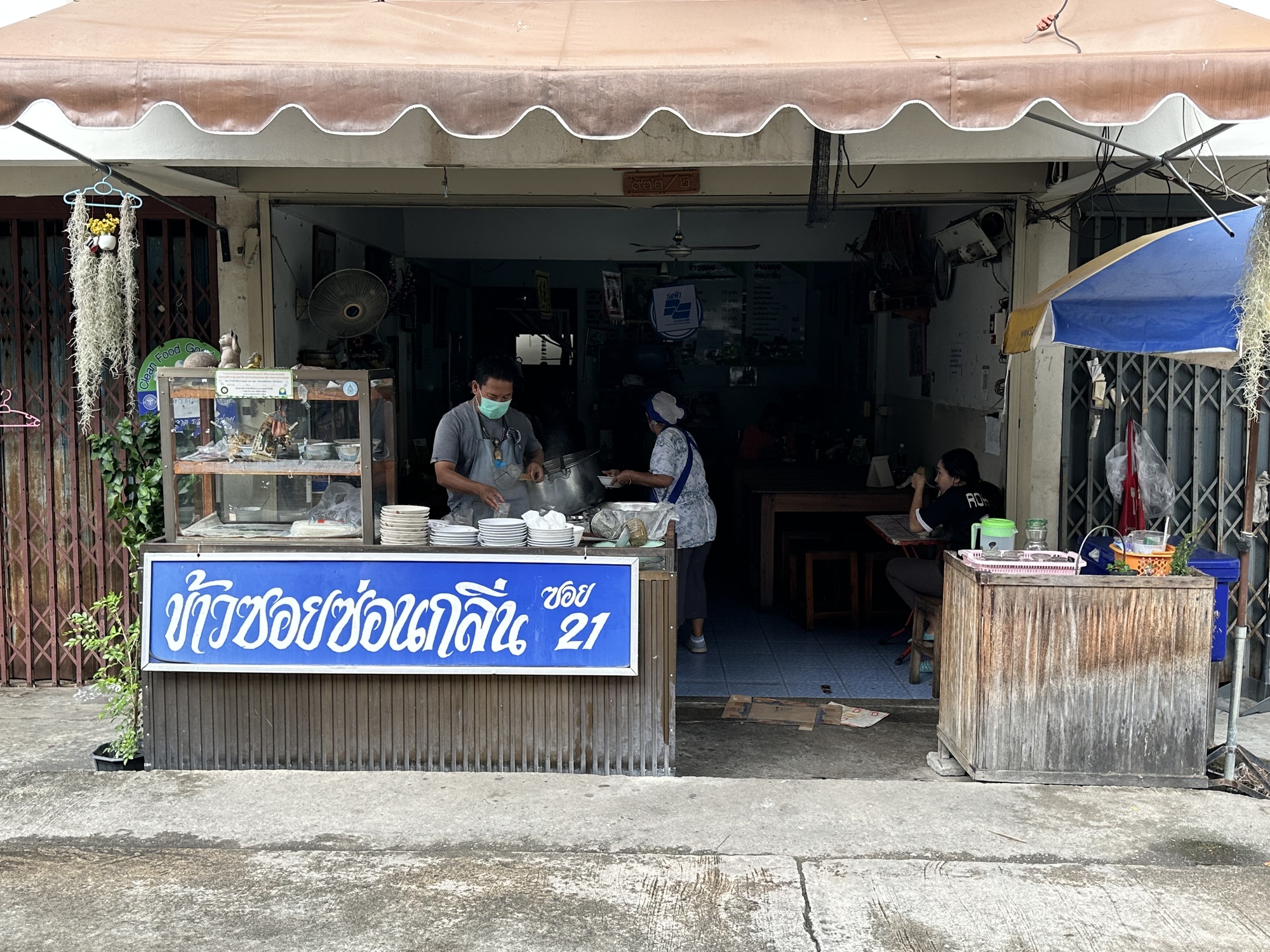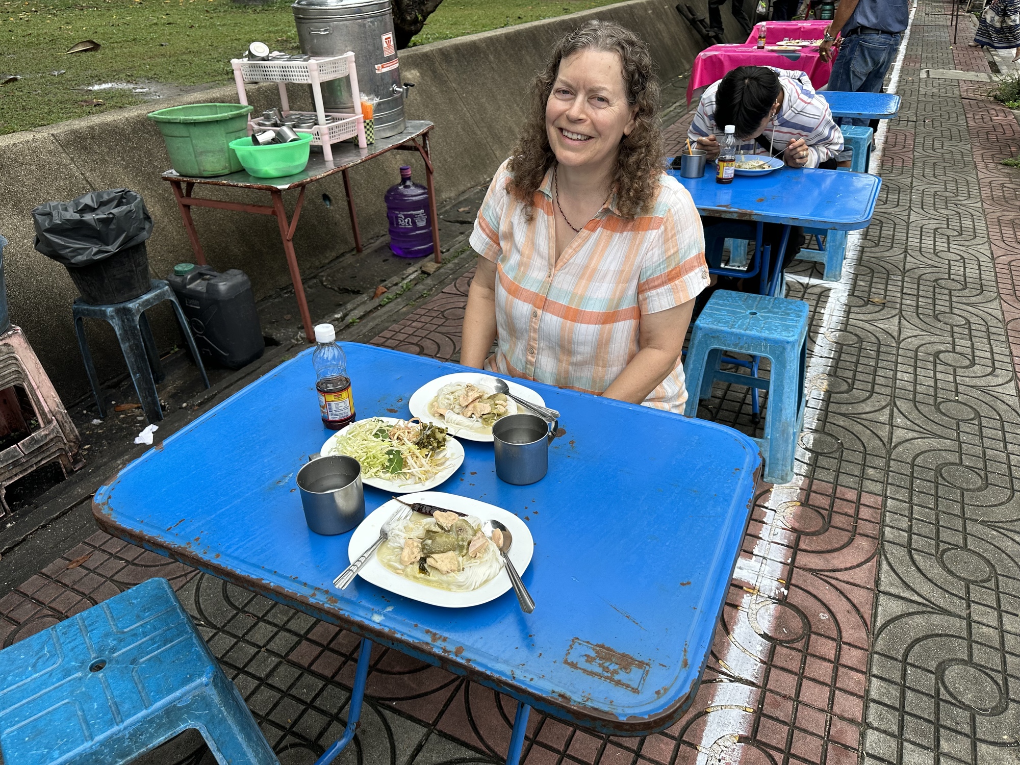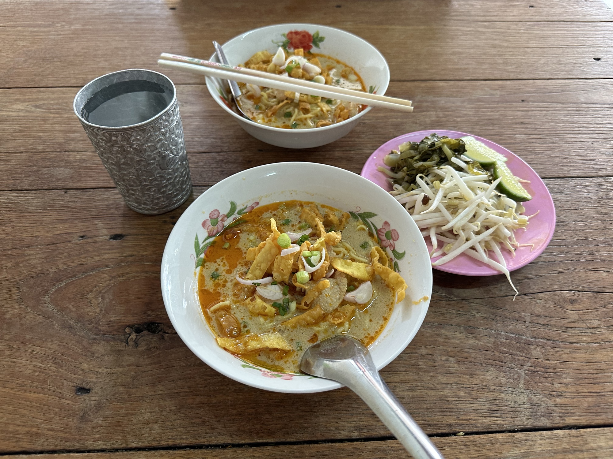We unloaded all of our panniers into our room as quickly as we could and immediately beat it over to a khao soi restaurant Andrea had found earlier. We were quick because the skies were threatening and, khao soi is a lunch item and so popular that they often run out of their batch. Khao soi is a northern Thai soup/curry. It involves a little bit of chicken swimming in a sea of spices and coconut cream. It's originally from Burma and Burmese food has a touch of India which is why khao soi is full of spices. There is also a layer of noodles on the bottom and some dry toasted noodles on top. A plate of preserved greens, raw shallots and a lime always come with the bowl of khao soi to add to the unusual flavor. Khao soi is a real taste treat and because it is hard to find and only in northern Thailand we ride like the wind in front of a thunderstorm to find it. And we did find it and it was excellent. Good that we hurried because the pot was almost empty when we got there.