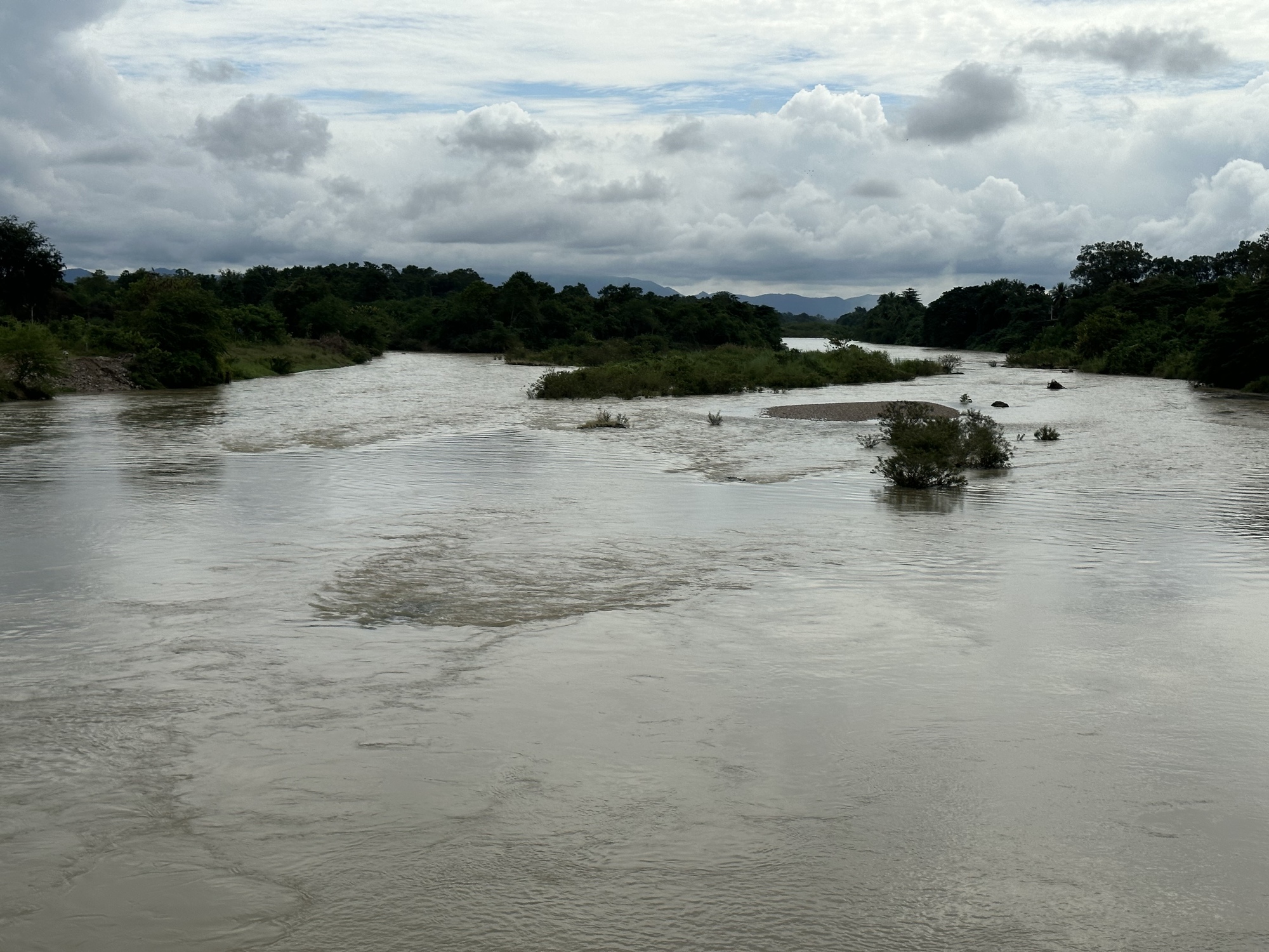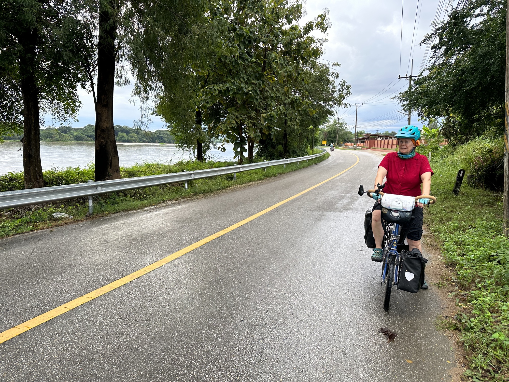 We had crossed to the east side of the Ping when we entered last night but this morning we went back to the west side to continue on the nice road hugging the river. The road was even nicer today, perfectly smooth with very gradual ups and downs. Also, for the first time on this trip, we had a slight tailwind. It was only a couple miles per hour but it was nice to have that extra little push. The temperature is coming down very slightly each day but the humidity is still horribly high so it's still really sticky. But, add it all up: the smooth road, slight tailwind, slightly cooler and it all made for a nicer ride today. (Mostly I think it was the excellent iced lattes we had that made it so enjoyable.) I don't even drink coffee that often back home but here I crave coffee because it's so tasty.