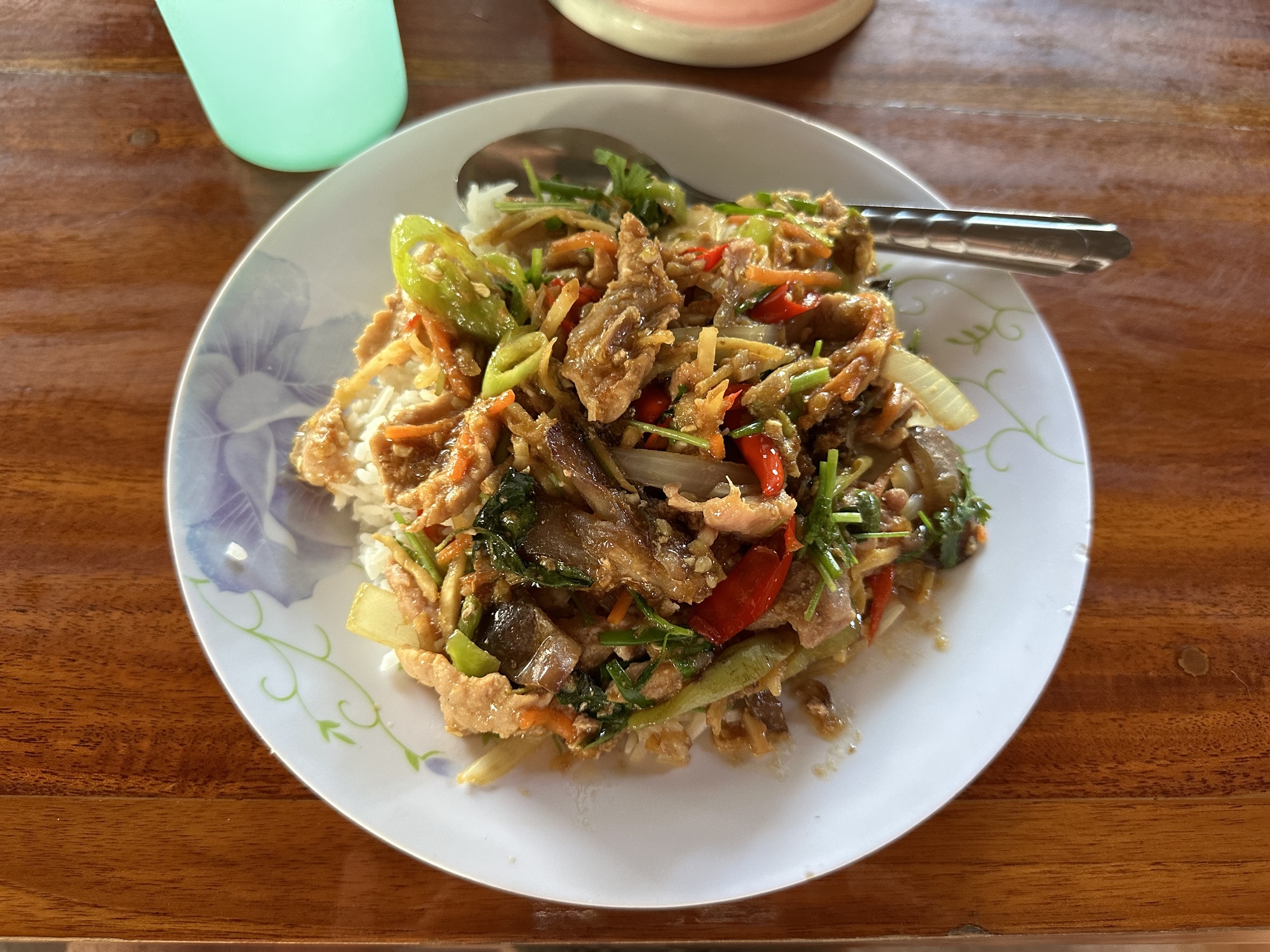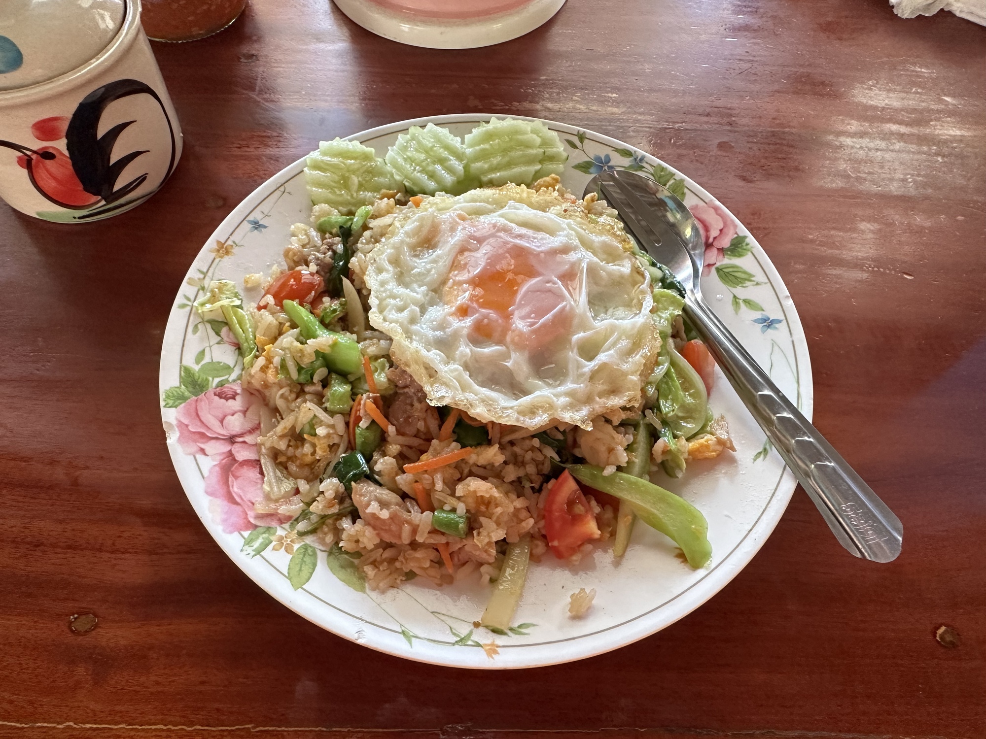 We ordered the basic stuff that most locals eat for lunch. I got fried rice with chicken and a fried egg on top and Andrea got fried wide noodles - pad siew. - with chicken. But this time there were all sorts of vegetables mixed in both our dishes and the portions were enormous. Same price however, just over a dollar apiece! We loved her cooking so much that I figured out how to ask when she closes her restaurant. Often restaurants in the countryside close quite early. She closes at 6PM.