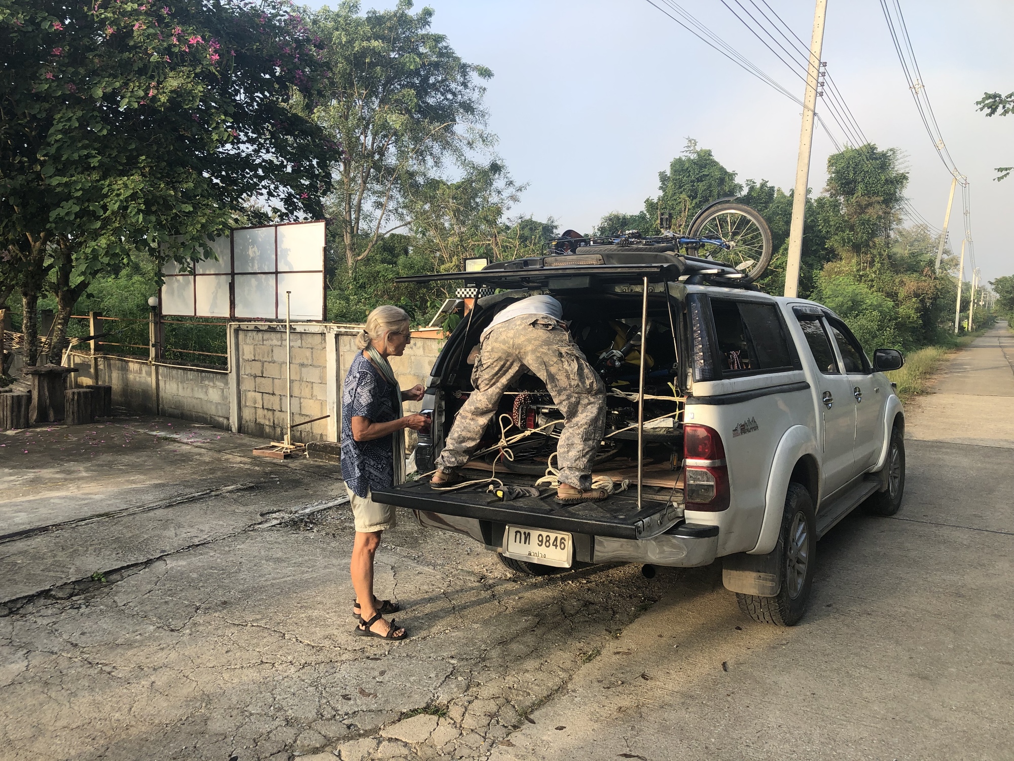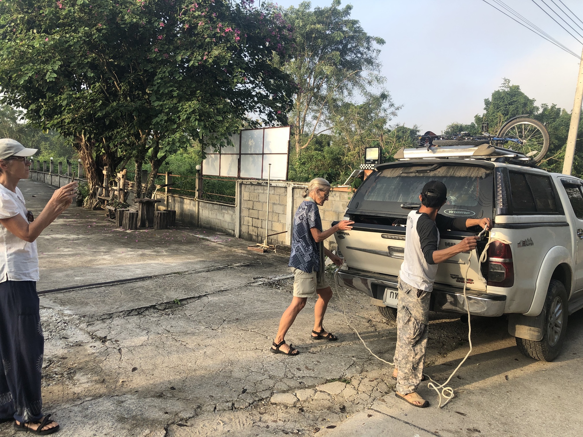 At 7:30 a Toyota pulled up to Silver Place Hotel to pick us up. It was not the sort of vehicle any of us had imagined. It wasn't an open pickup or the type of pickup taxi with two rows of seats in the back. It was some sort of hybrid of every kind of vehicle we had all imagined. The covered back part could take quite a lot of cargo although getting four bikes inside was too much and Andrea's bike had to be tied on top.