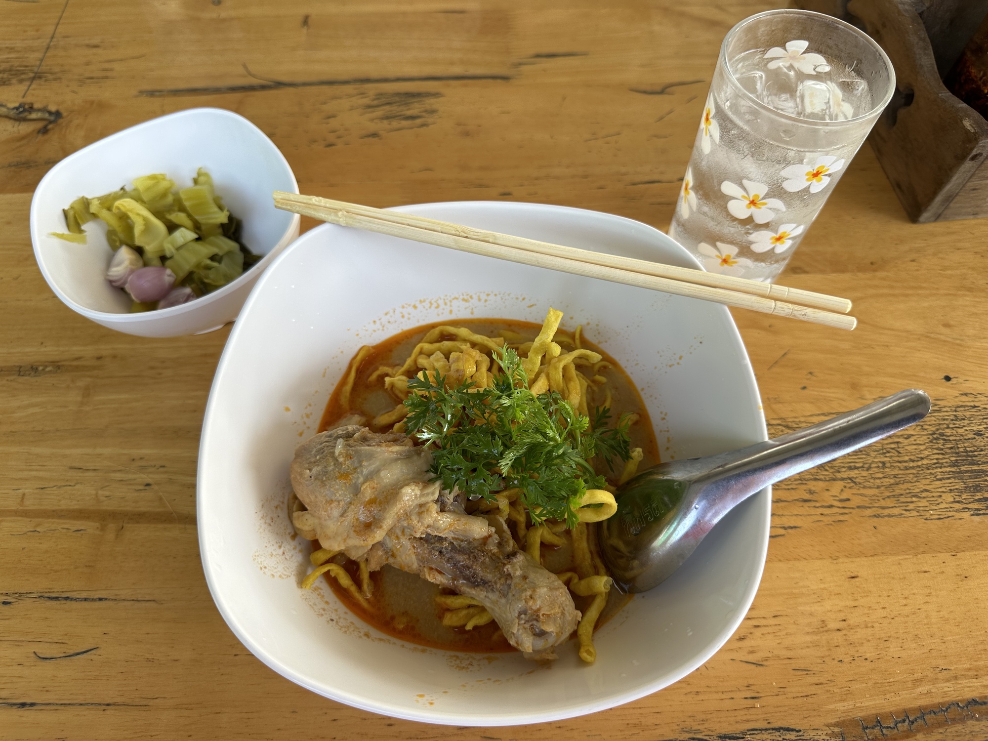 But when we got off our bikes we realized there was also a restaurant more or less connected to the coffee shop and something smelled awfully good. We asked what was available to order and when the woman said, "Khao soi" Andrea literally jumped for joy. We quickly forgot about coffee and sat down to some bowls of khao soi. The view of the hills from our table at the restaurant was great and so was the khao soi. Khao soi is not super common even in the north where it originates from, so we kind of lucked out to pick the one restaurant that had it. As we oohed and awwed over the khao soi I thought that this bike trip of ours could easily turn into a khao soi seeking tour.