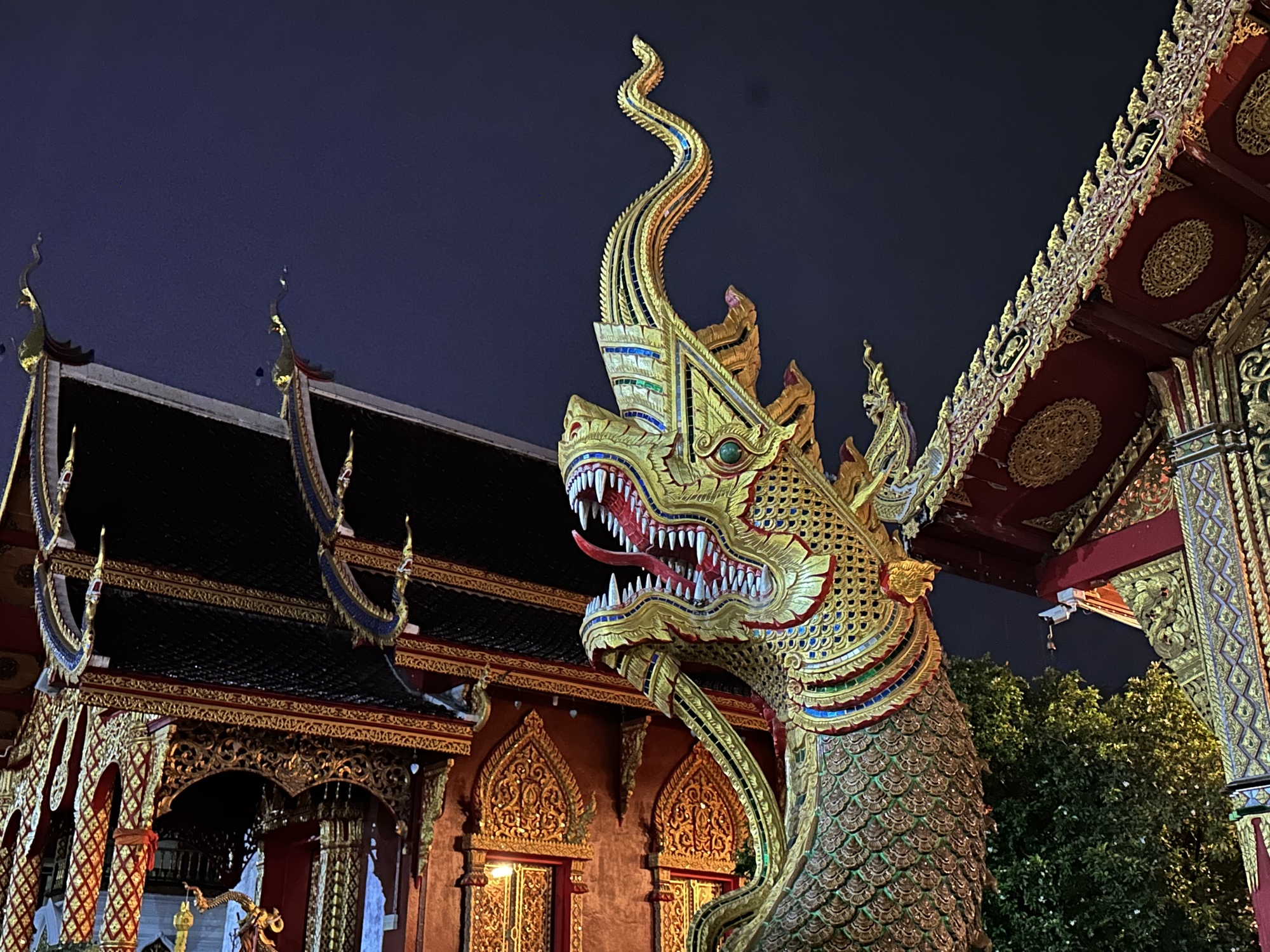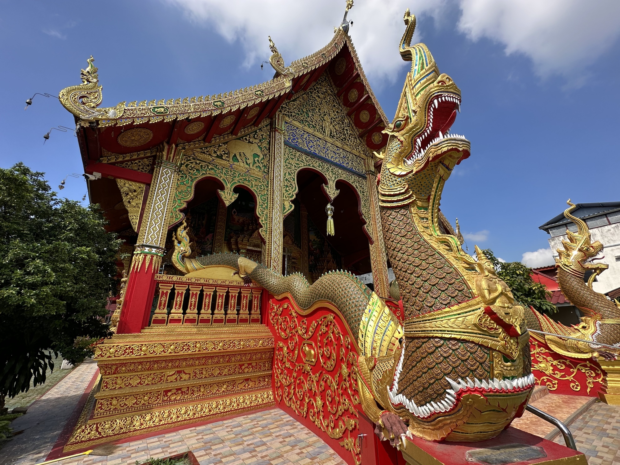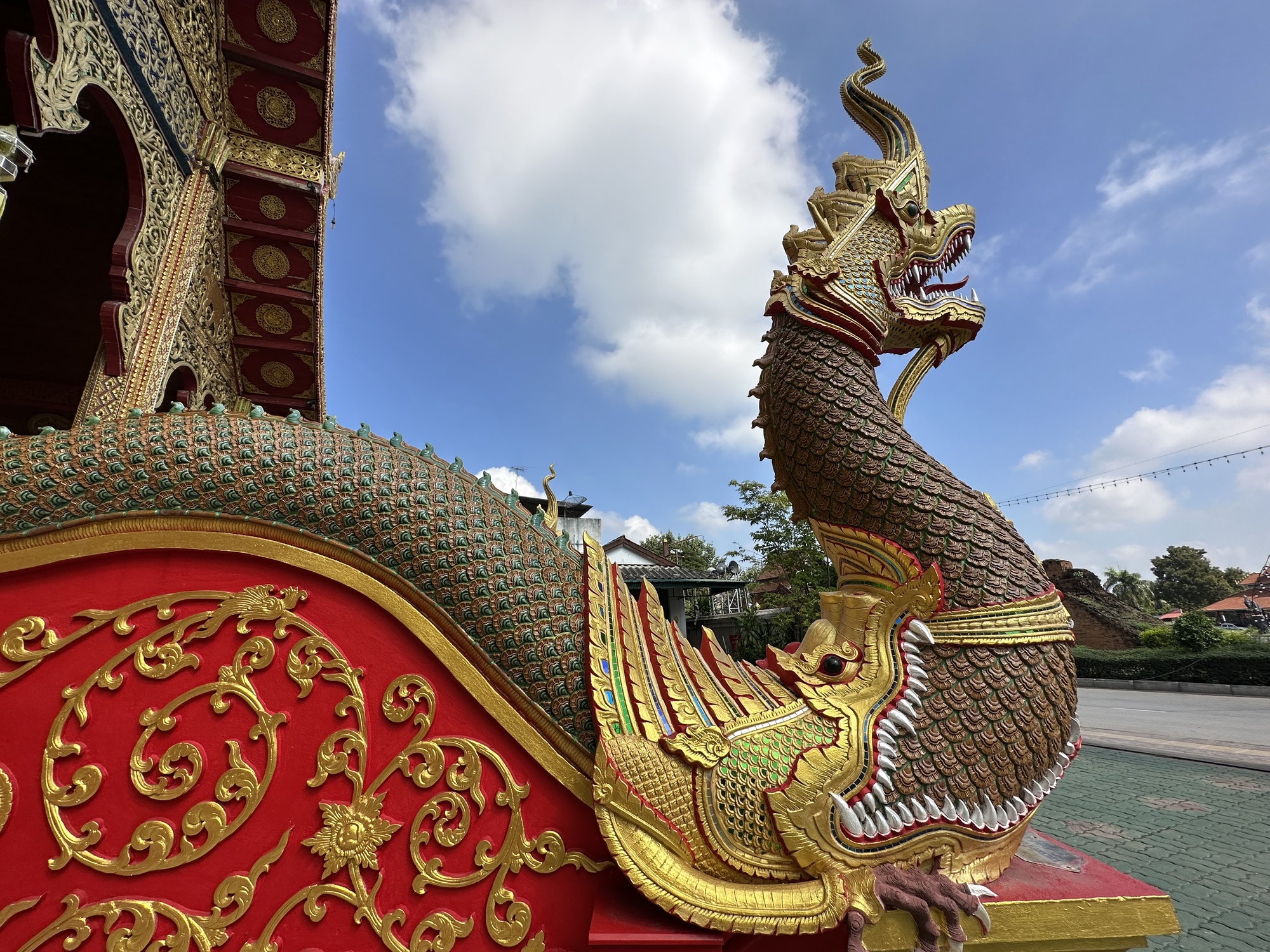 Wat Chang Rong. The Naga is the serpent-protector which is not being eaten by the Makara (another watery dweller) which it always looks like, but instead is coming out of the Makara, triumphantly I might add.