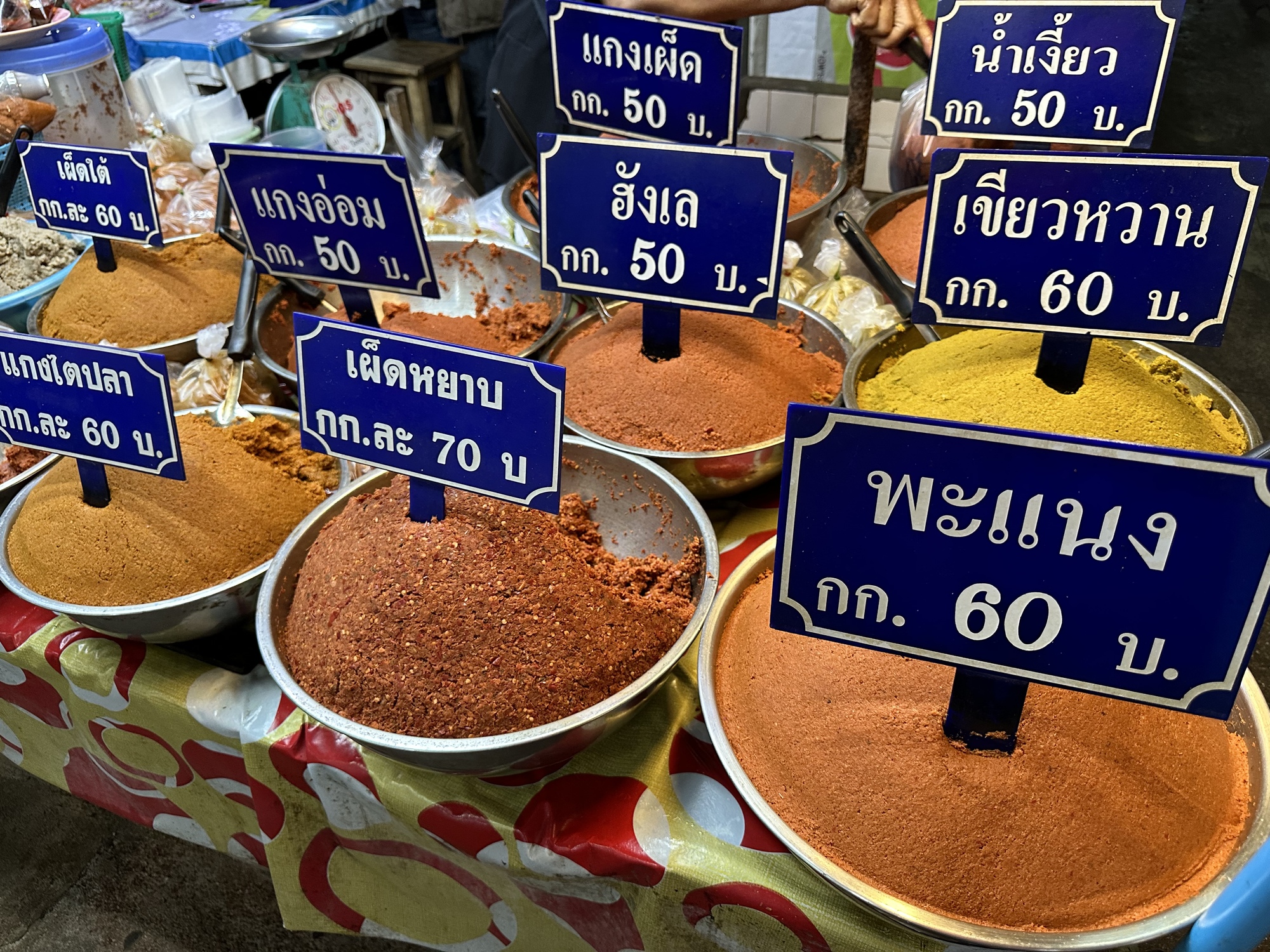 All the various curry pastes. The aroma was amazing! They are priced by the half kilo, which means that from $1.25 - 1.75 you can buy a pound of fresh curry paste. A pound is quite a lot of curry paste!