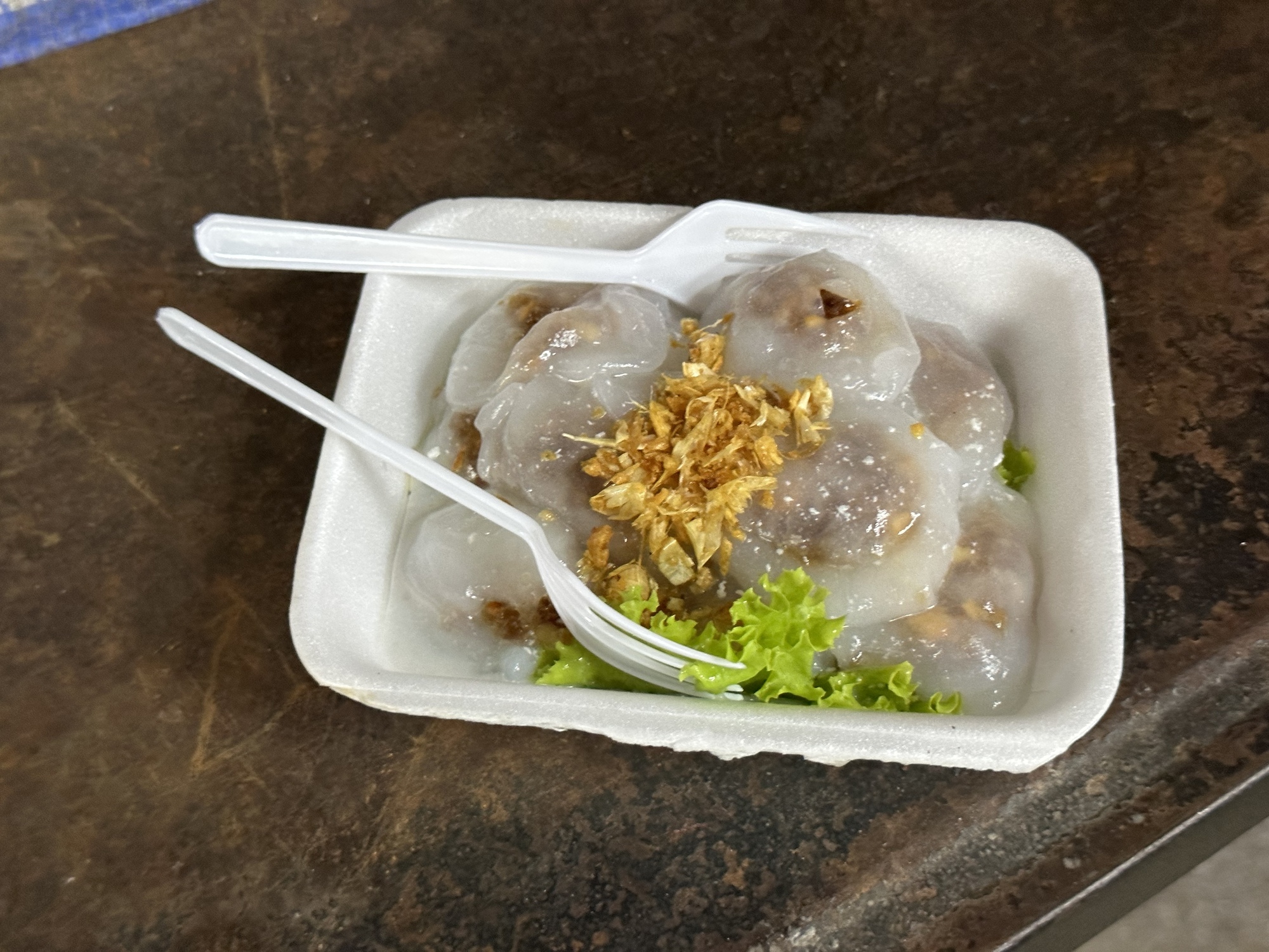 We don't know the name of this stuff but it is one of our favorites if and when we ever find a woman making it. She steams a thin layer of coconut/rice flour mixture on a thin cloth then separates out a few sections and adds some crushed peanuts and unidentifiables and folds them over. Topping is toasted garlic. They are a taste treat. There were ten of them in this little tray for 10 Baht or $.27.