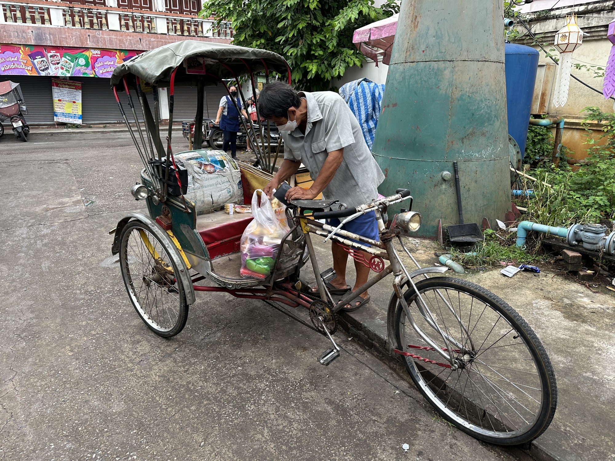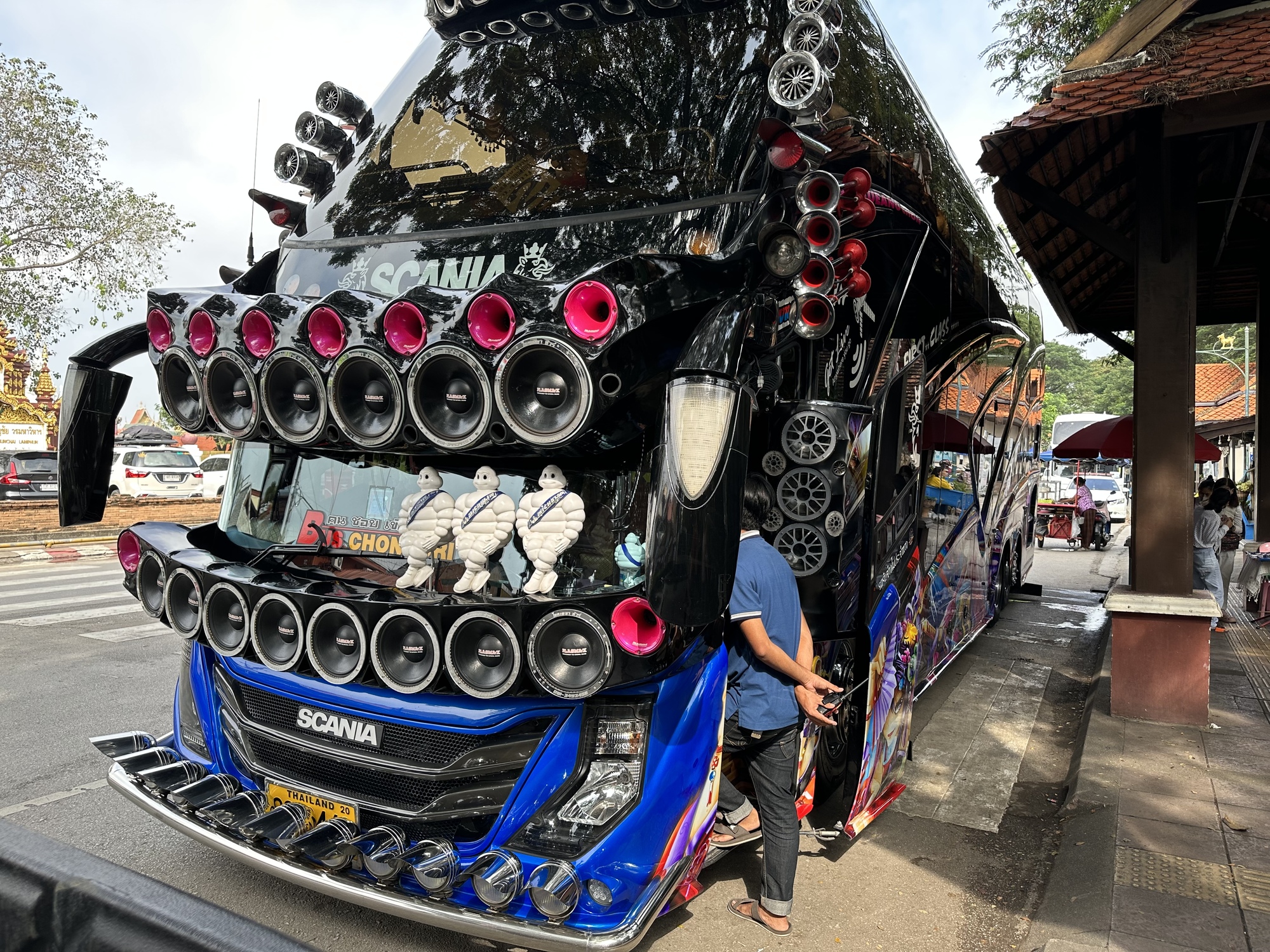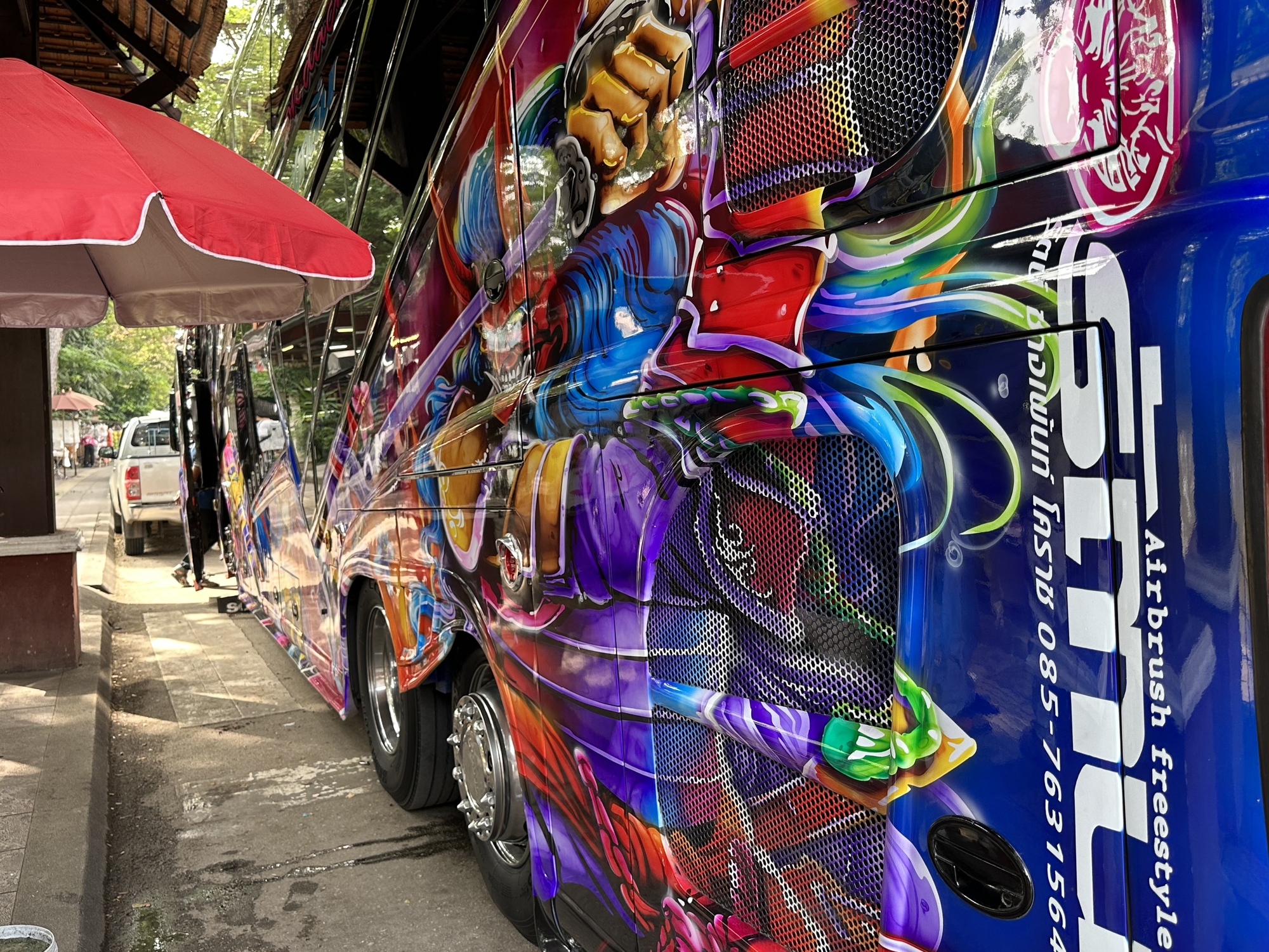 The tour buses in Thailand are over the top when it comes to decoration but I've never seen one this over the top. No idea why all of this! Don't ask me what it's for. I just hope the driver can still see out the windshield.