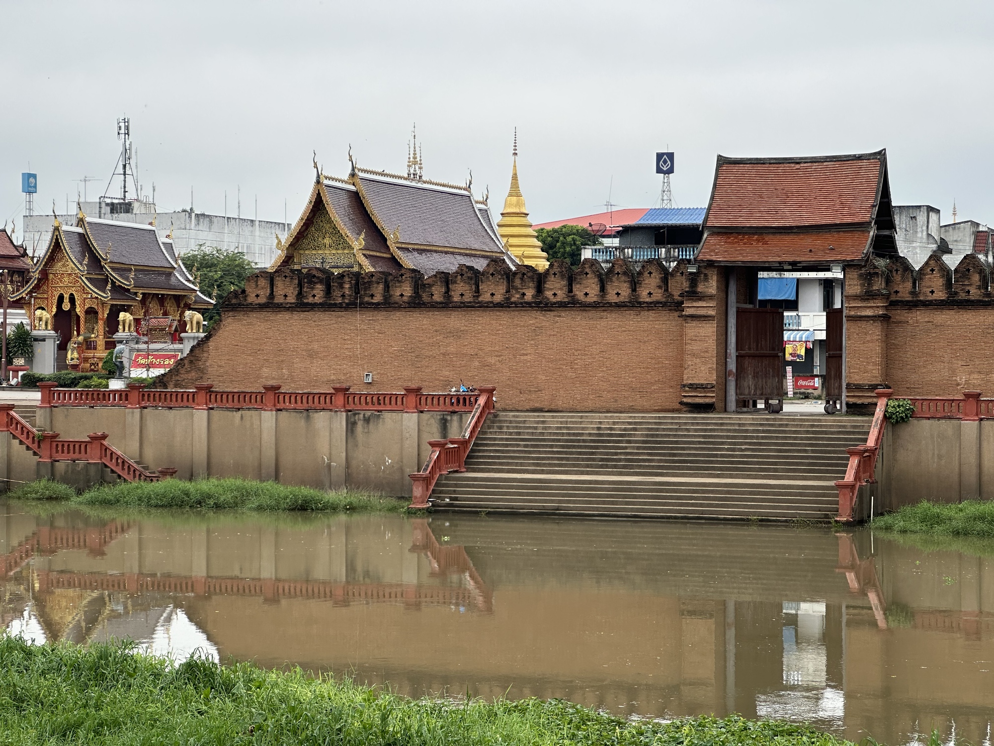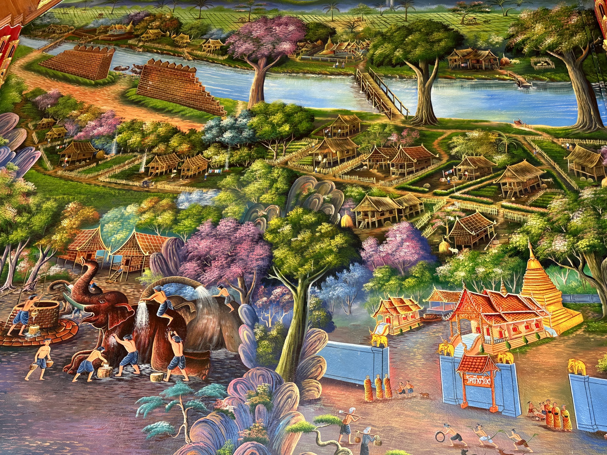 A mural on the outside rear wall of Wat Chang Rong depicting the temple and its setting in ancient times. The main gate to the city, the moat and Wat Chang Rong in the lower right. Interesting that they reversed the orientation of the temple so that we could see its front.