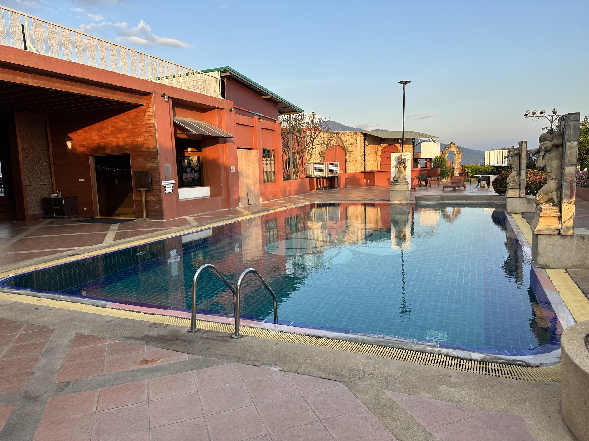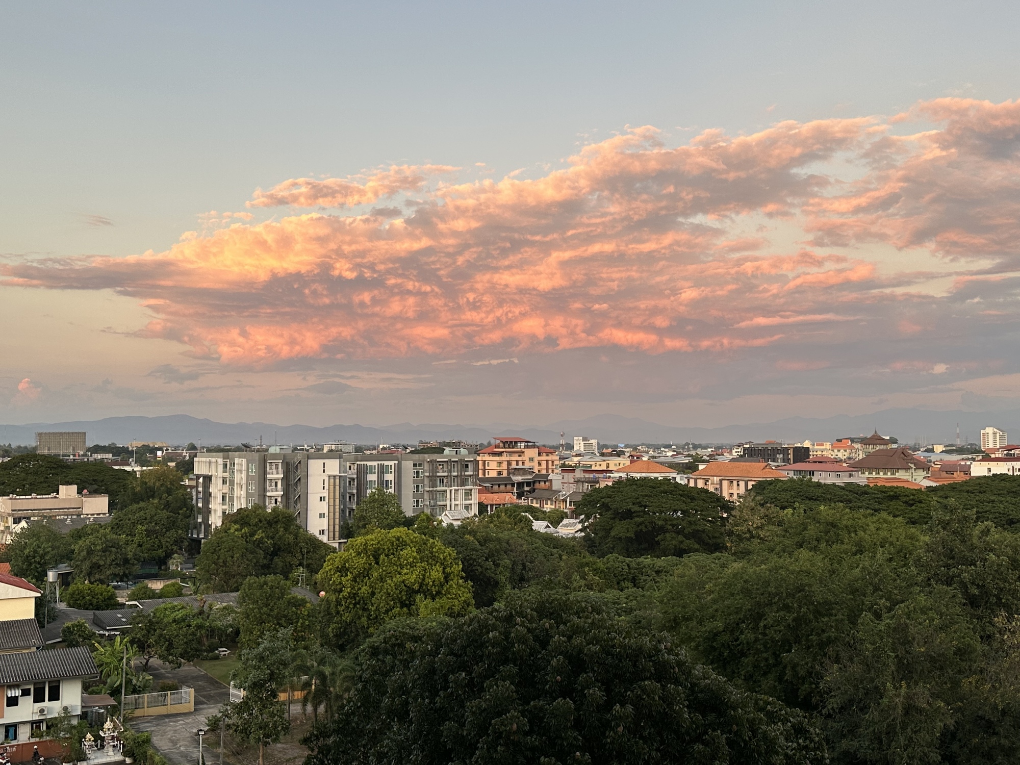 But we always make the best of things and we had bicycles which we used to find the kind of restaurants we love. The best part of our rundown hotel was the rooftop where I went for sunrise every morning. Besides the pool on the rooftop the entire west side was an open air restaurant which was vacant in the early mornings. I went there every sunrise to take panoramas of Doi Suthep - the sacred mountain which watches over Chiang Mai. It seemed very close by and it looked slightly different everyday.
