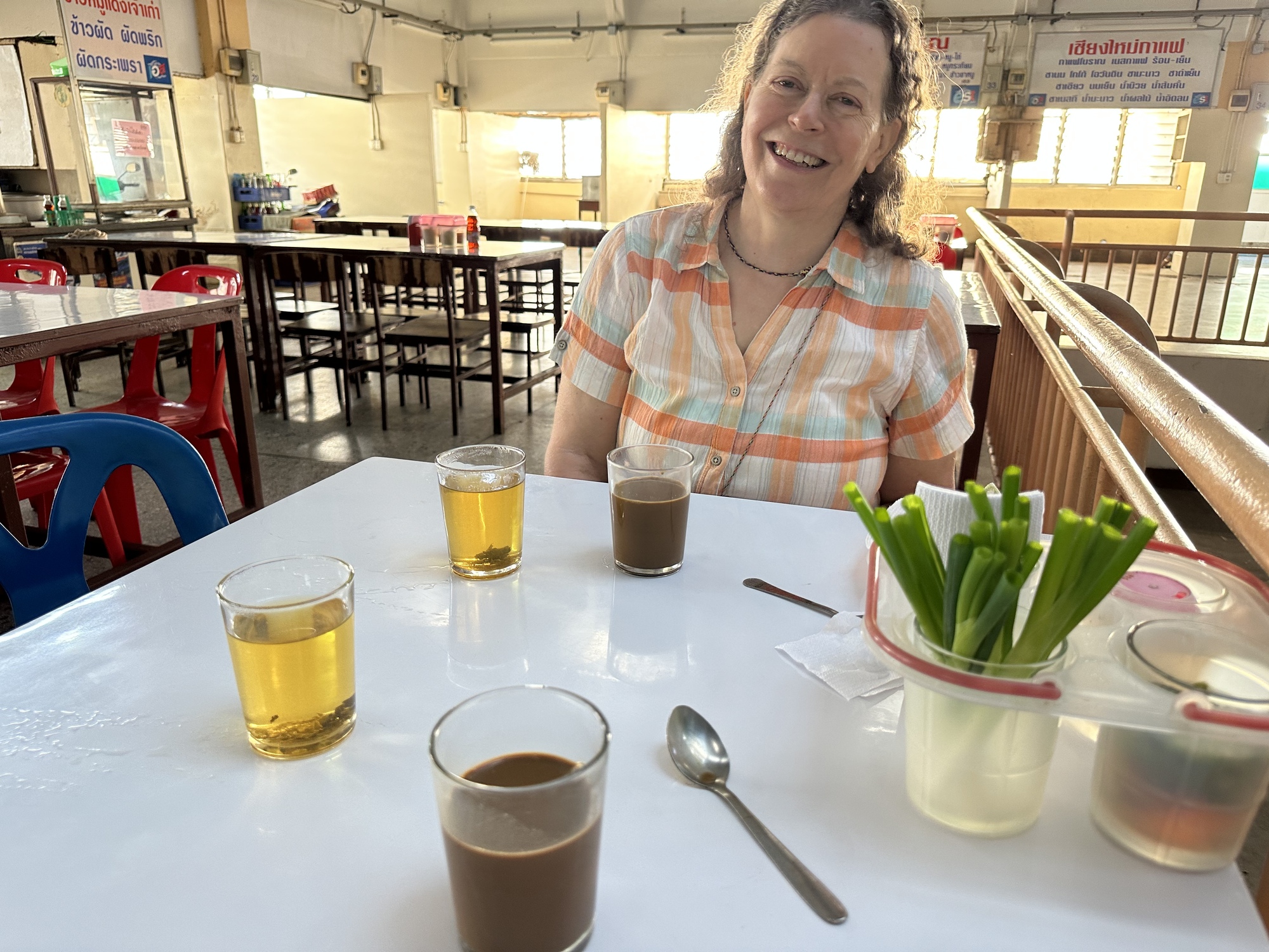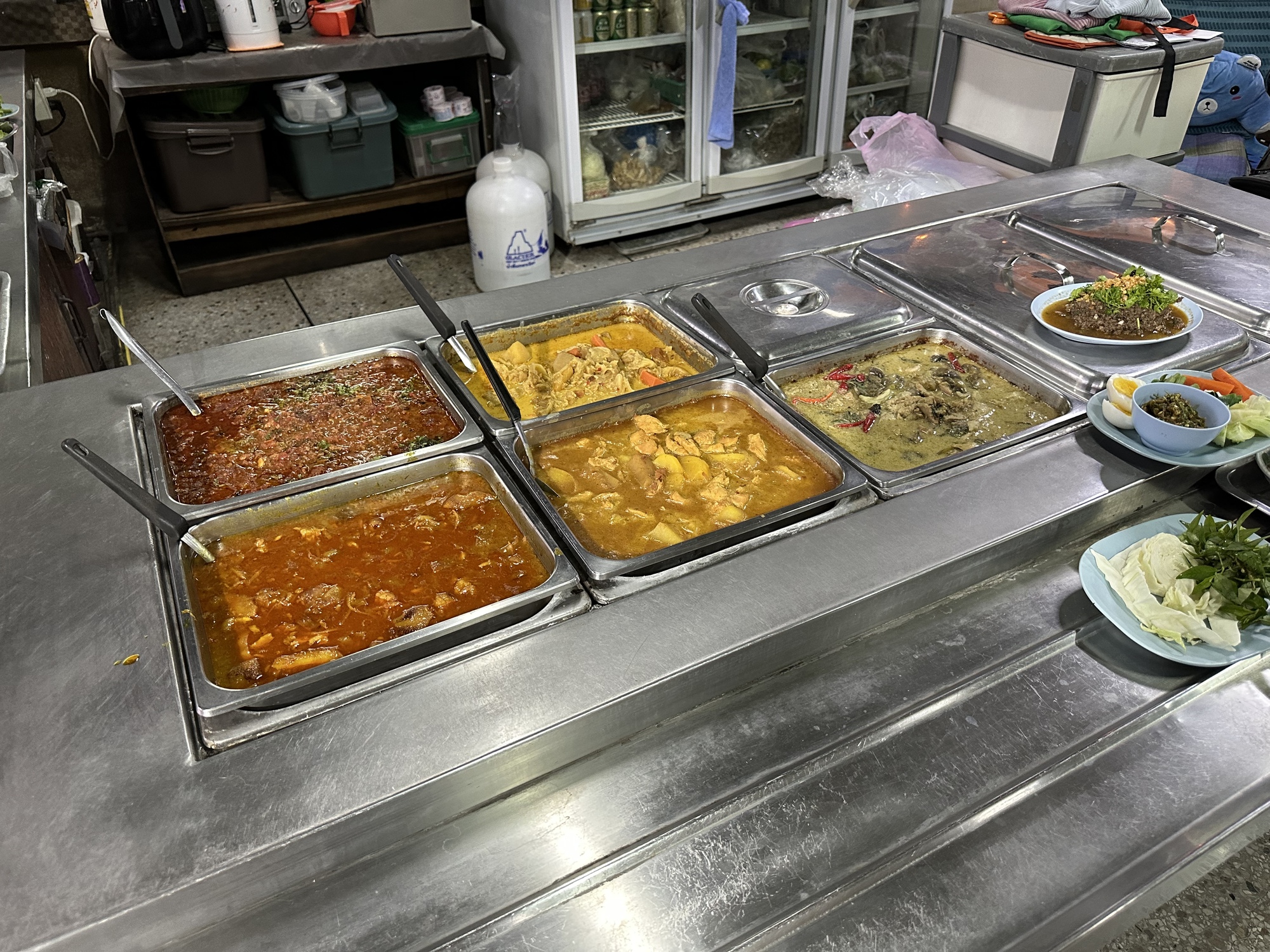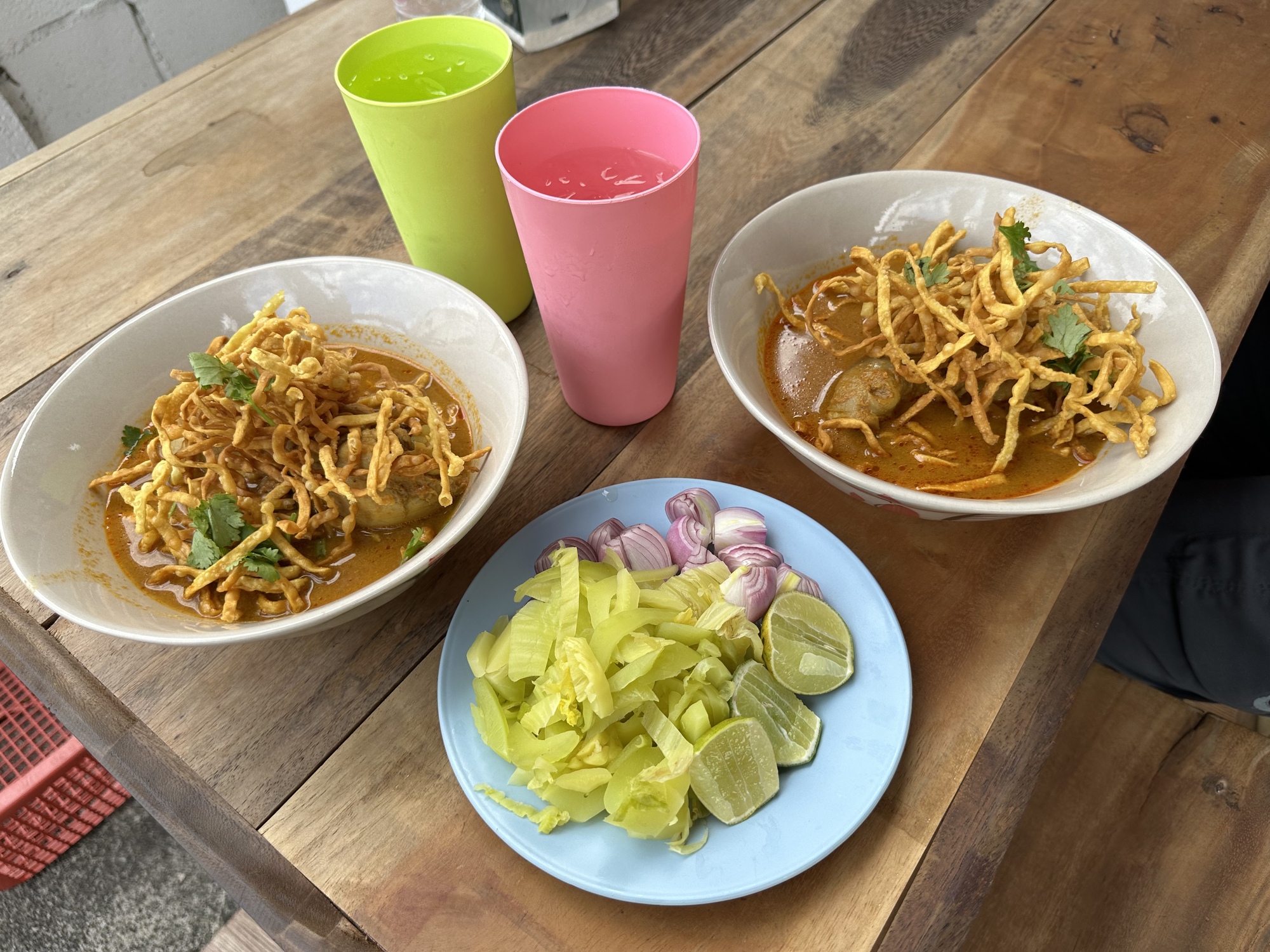 This was khao soi #6 for us on our quest to compare khao sois. This one was very good and the dish of condiments which you add to the bowl was huge. A lime, pickled greens (some sort of choy) and raw shallots always come with khao soi.