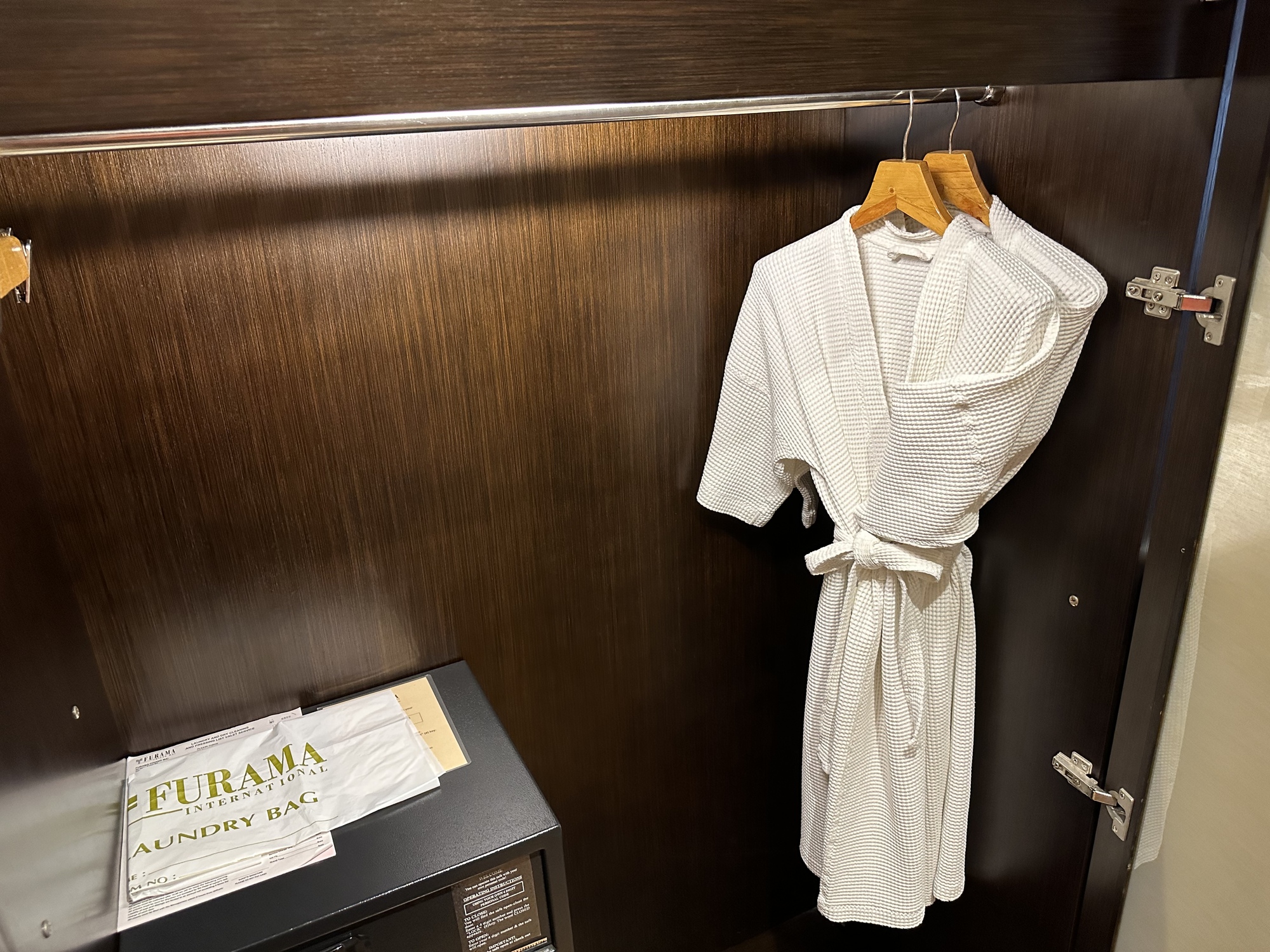 It looks good but the doors to this closet didn't close but they needed to close in order for the light inside the closet to turn off. It wouldn't have been that big a deal except the doors were mostly glass and the light all night inside our room was unacceptable. I had to figure out how to remove the light itself. And, the robes were so small they made me look like a ten year old. There should be a photo of that but we failed to take one.