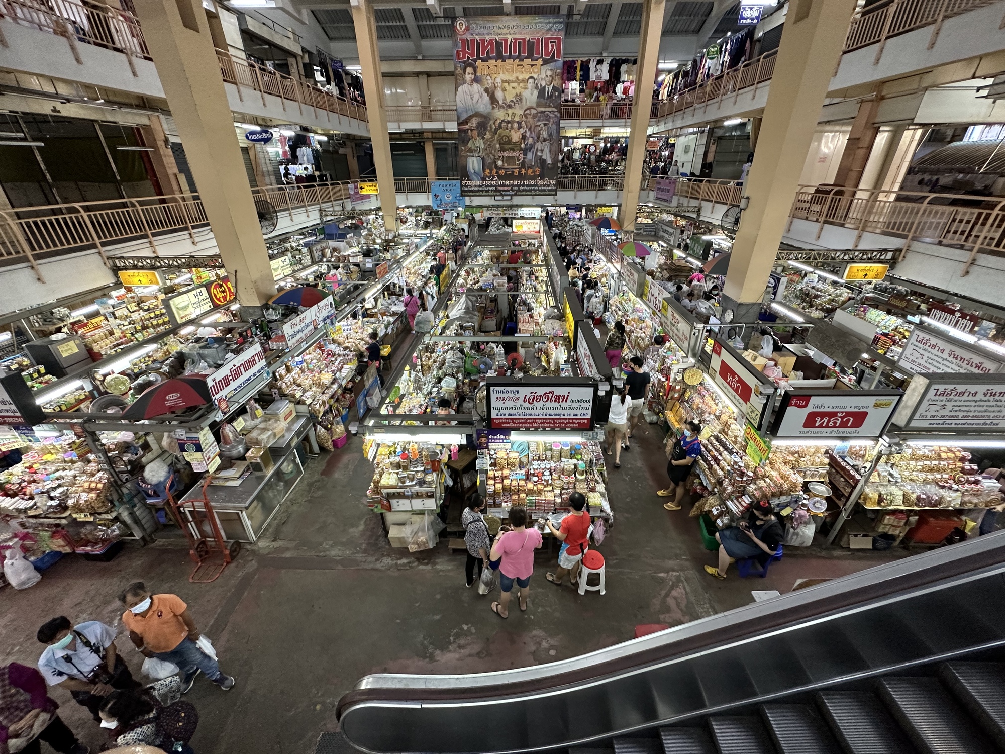 One of our most favorite places in Chiang Mai is Warrorot Market, next to the Ping River which we more or less followed all the way up from Bangkok. Warrorot Market is an old-time Thai market built in 1910 and little has changed through the decades. In fact, it has not changed one bit in the 48 years I've known it. The escalator which was not working 48 years ago is still not working and by now I think most people would think it a travesty if it were fixed. There is a woman who sits surrounded by piles of vegetables who has been there for 48 years as well. I don't know if she is winched into her spot each morning or how she ever gets out but there she is every time I've been in Chiang Mai.