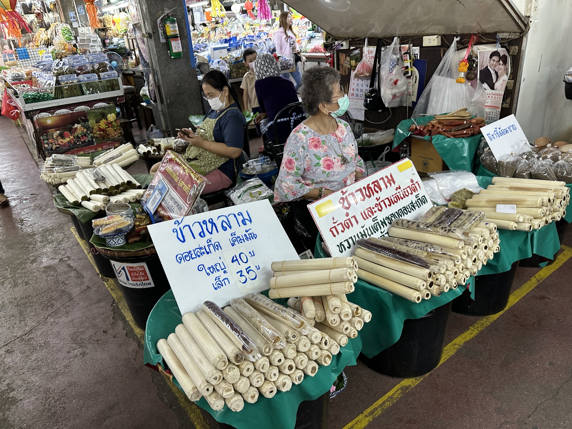 The khao lam ladies at Warrorot Market. Khao lam is sticky rice steamed inside of bamboo, a northern specialty. The outside of the bamboo is stripped away first to let in more steam. To eat you peel away the remaining whitish bamboo.