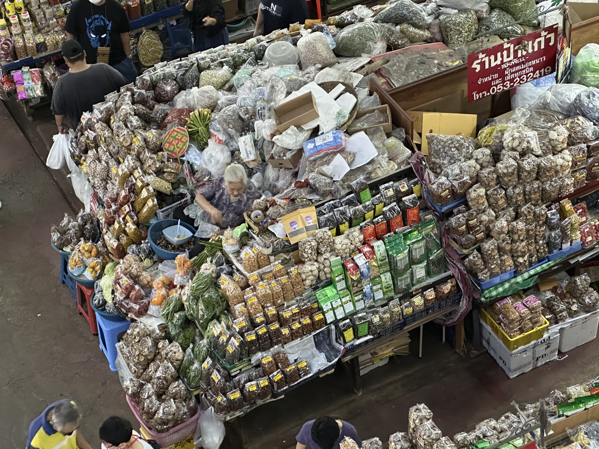 This is the woman who must be lowered into her spot by ropes from the ceiling every morning. She always had piles of fresh vegetables surrounding her but now she seems to be switching to more dried things. She's been there at least half a century!